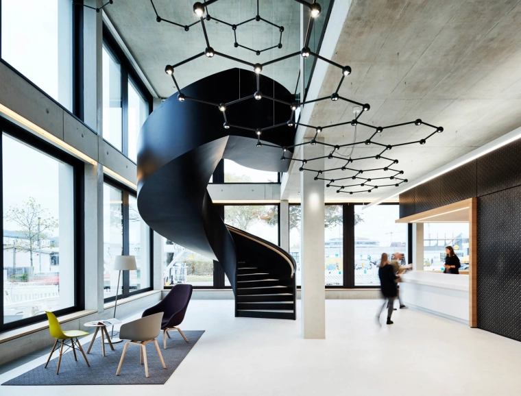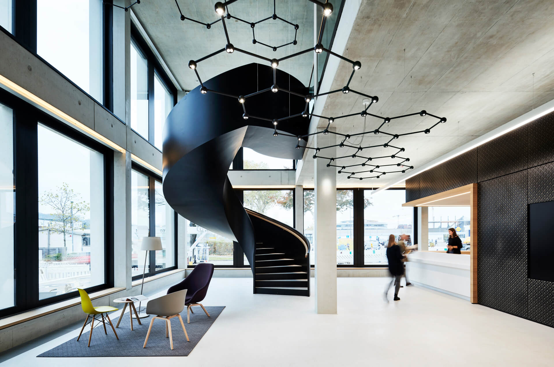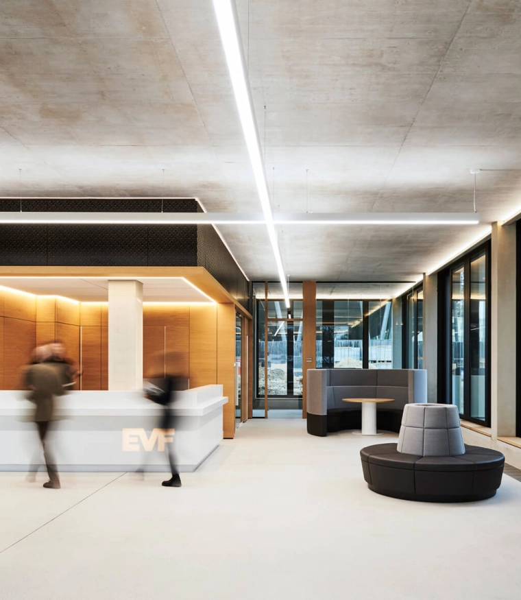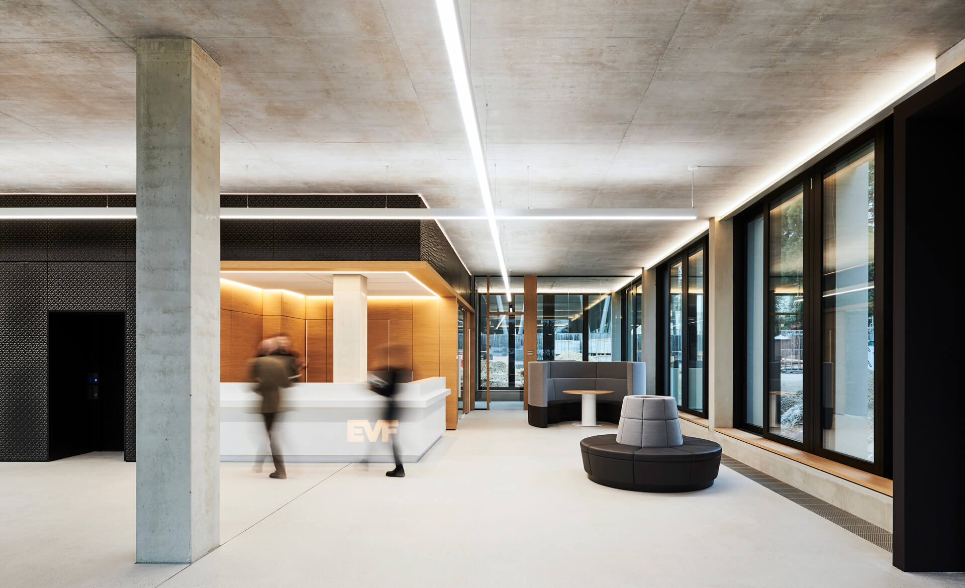Erd- und erstes Obergeschoss verbindet eine skulpturale Treppe, ein mit gelasertem Stahlblech versehener Kern bringt die Werte der EVF – Stärke, Qualität und Verlässlichkeit – zum Ausdruck. Raumhohe Verglasungen verspringen und geben der Fassade Plastizität. Die Kontur des Gebäudes wird im Innern durch eine indirekte Beleuchtung an der Fassade unterstrichen, zwei orthogonal zueinander verlaufende Lichtachsen leuchten die Sichtbetondecke aus und nehmen die strukturierte Raumteilung auf.