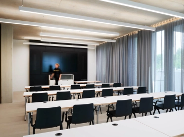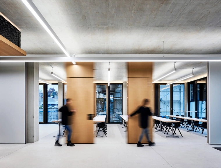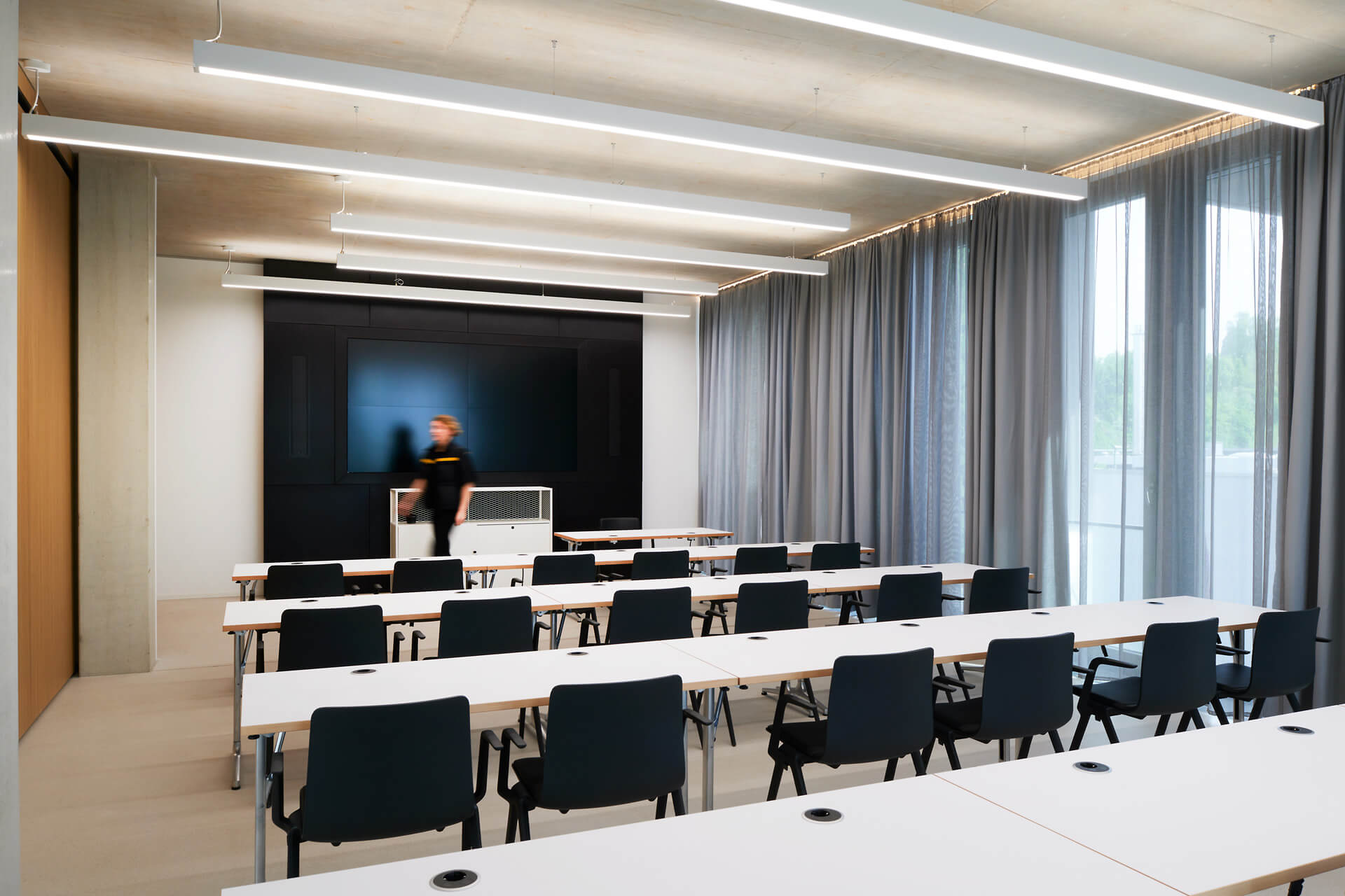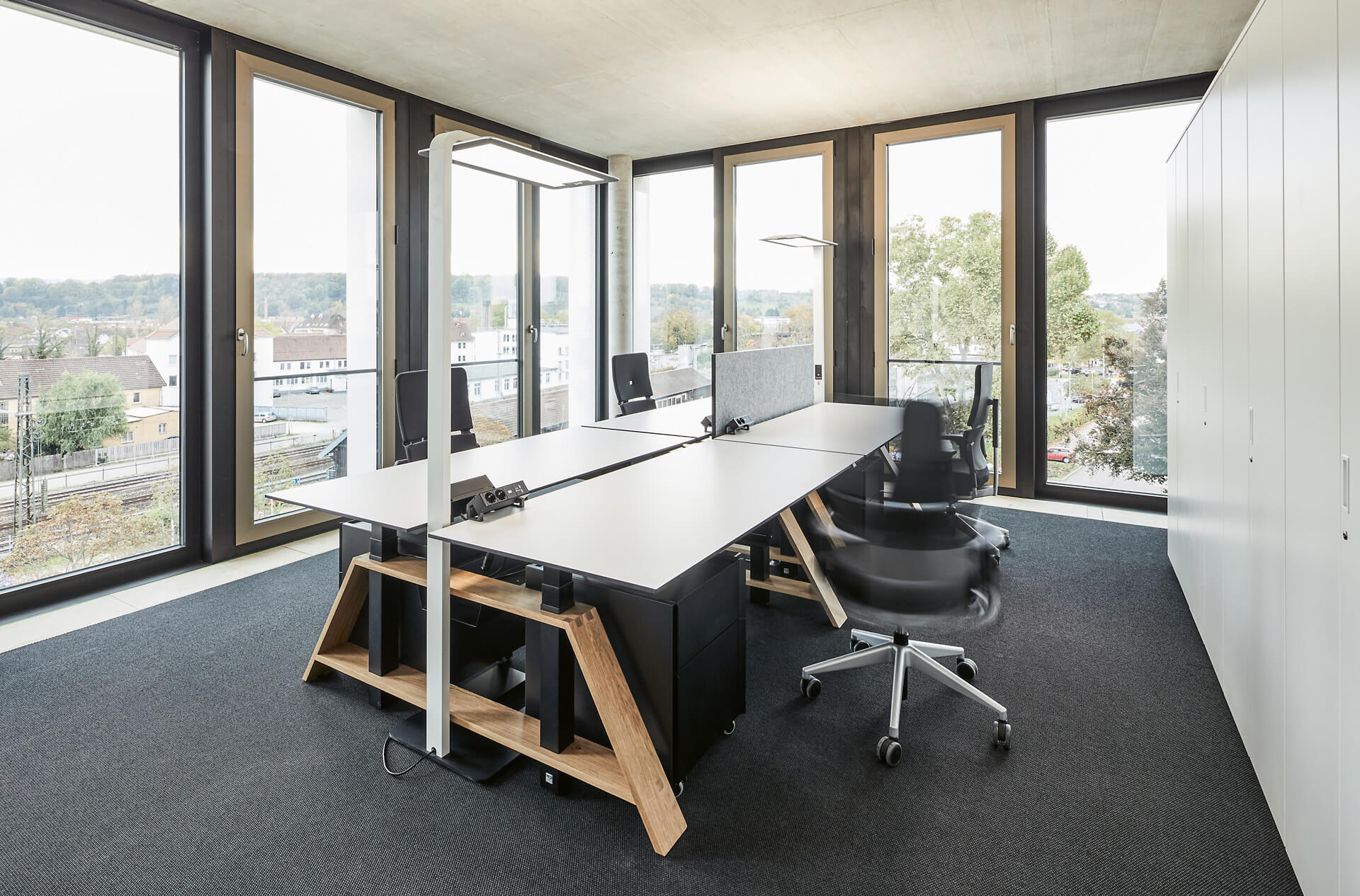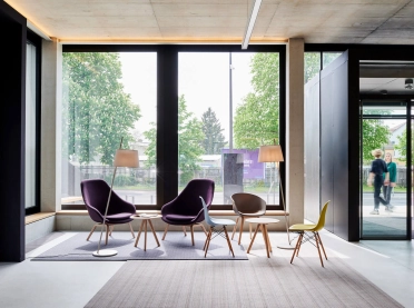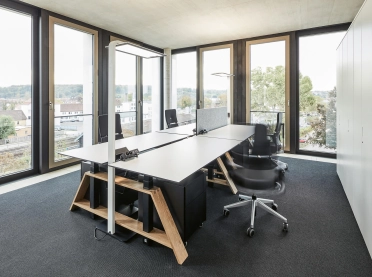 Obgleich die Büroräume in den Obergeschossen geschlossener gestaltet sind, fördern sie interdisziplinares Arbeiten sowie die interne Kommunikation und erhöhen dadurch die Aufenthalts- und Arbeitsqualität. Dem Bestreben der EVF nach ständiger Weiterentwicklung – nach Innen und Außen – wird Rechnung getragen, in dem die Bürogrundrisse flexibel gehalten sind. Strukturelle Veränderungen können so jederzeit auch räumlich umgesetzt werden.