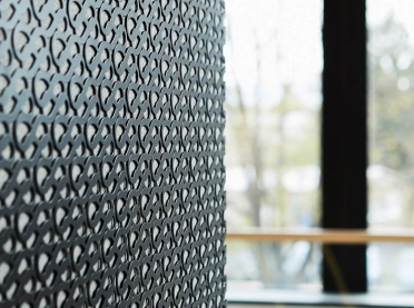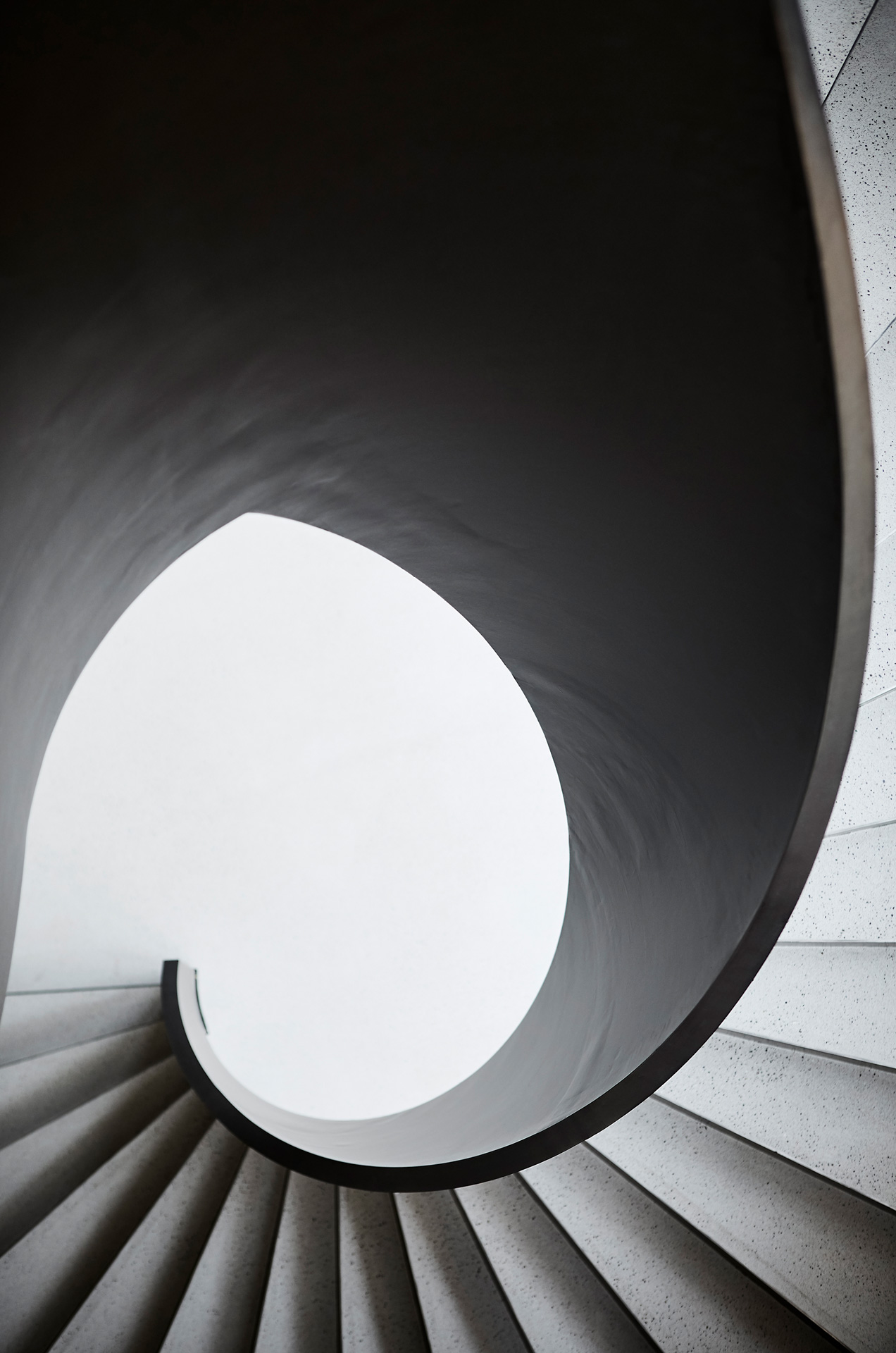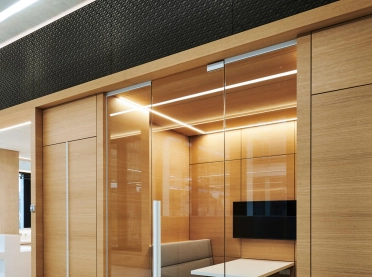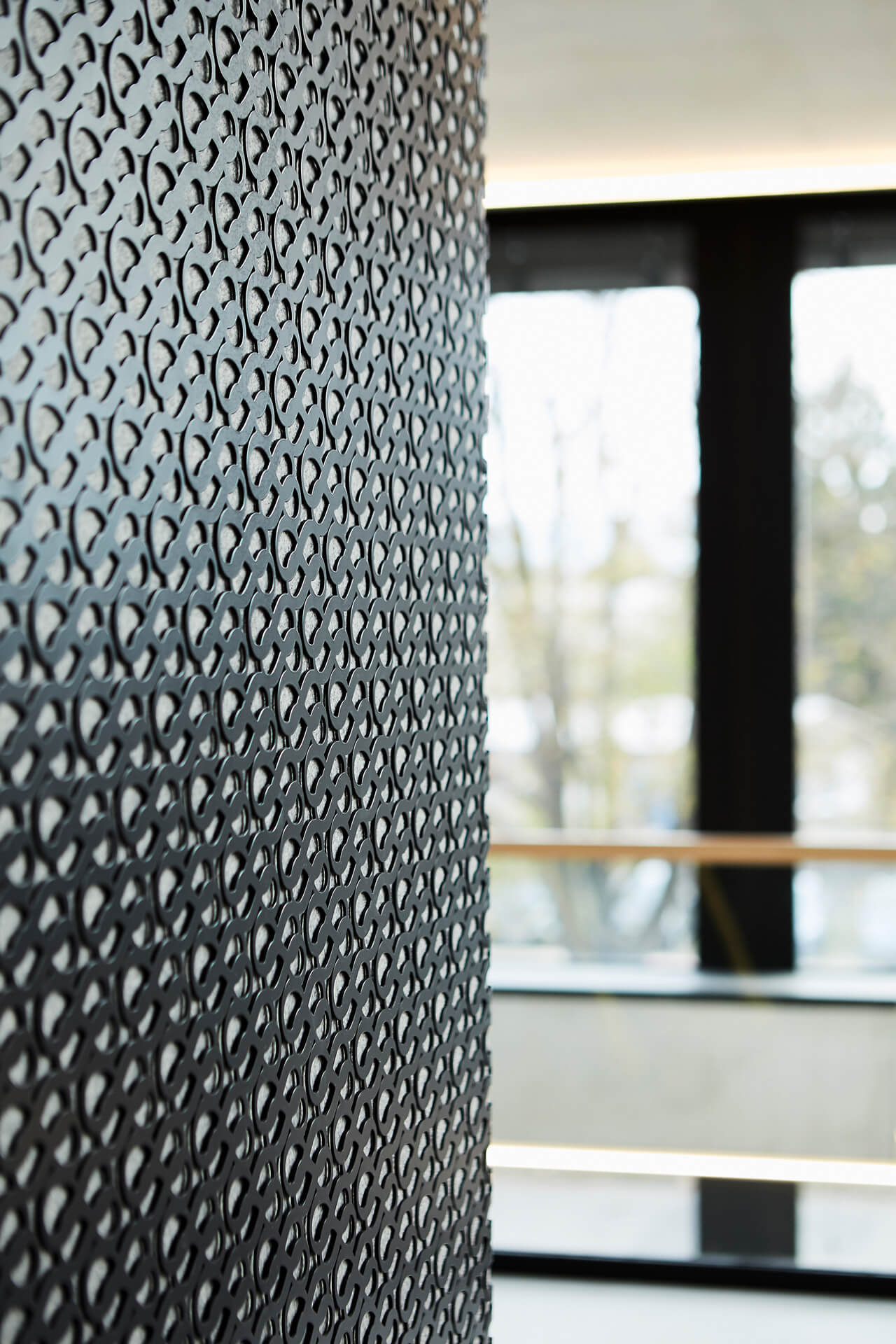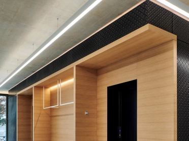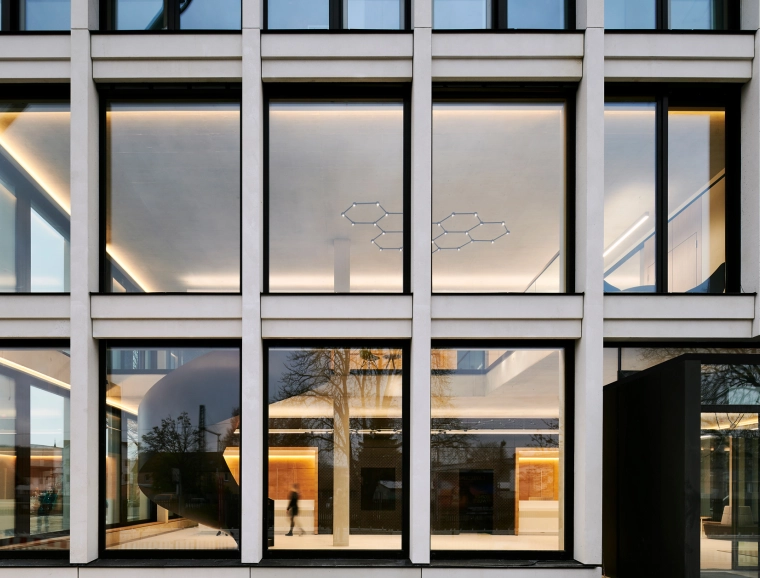 Verbindendes Element des Erd- und ersten Obergeschosses ist die Favo-Leuchte, die sich in drei Ebenen im Luftraum ausbildet und die Ausstellungsfläche im Erdgeschoss beleuchtet. Das innovative Beleuchtungssystem von Sattler Lighting wurde bereits mit mehreren Awards ausgezeichnet.