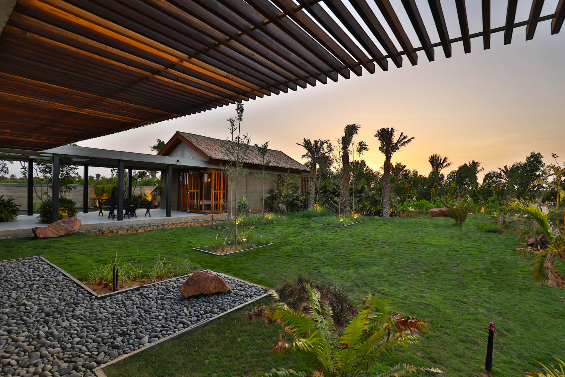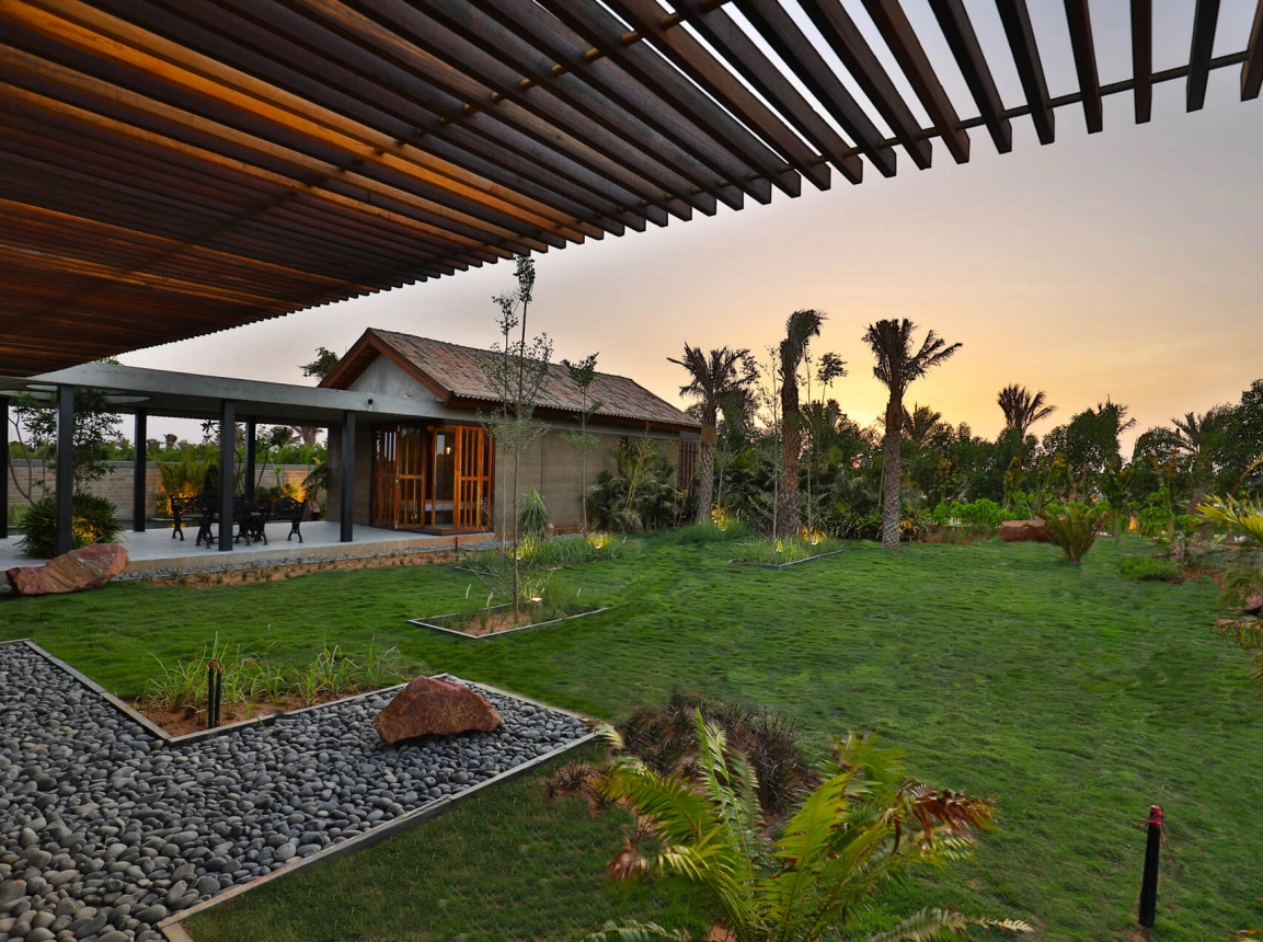 Im indischen Bundesstaat Gujarat entsteht eine Ferienhausanlage mit 650 Bungalows, einem Clubhaus, Restaurant, Pool, Spa-Bereich, Bistro und ausgedehnten Sportanlagen. Unter Berücksichtigung nachhaltiger Kriterien und mit dem Einsatz recycelter Materialien wird in der trocken-heißen Region ein Areal entwickelt, das Assoziationen an eine Oase weckt: Von Dattelpalmen gesäumte Straßen und üppige Grünflächen strukturieren das Gelände. Die Bungalows werden um großzügige, verschattete Außenräume ergänzt und bieten ihren Bewohnern ein hohes Maß an Lebensqualität. Die Bauweise basiert auf traditionellen, indischen Bautechniken – aufgewertet durch moderne technologische Erkenntnisse.