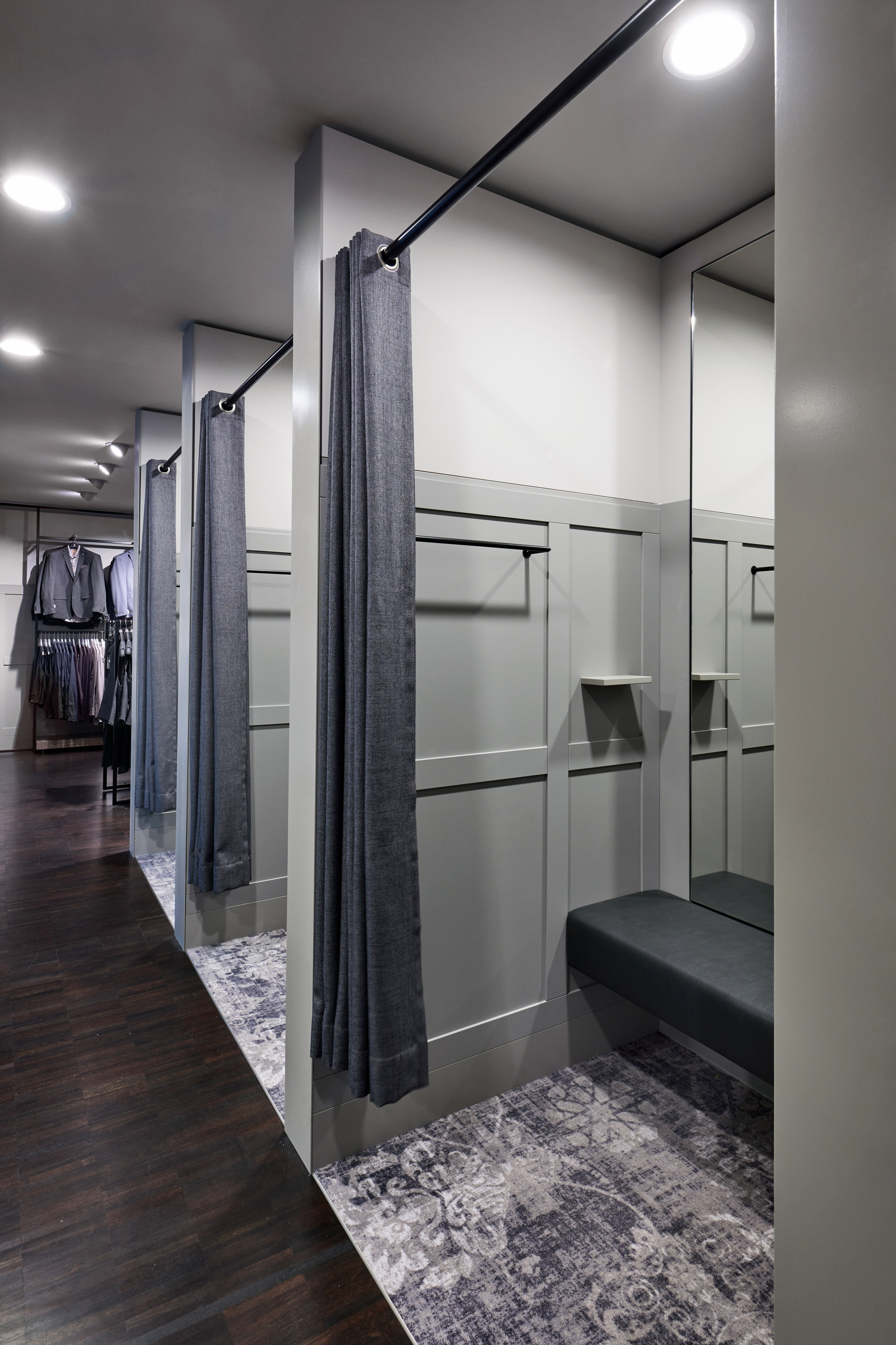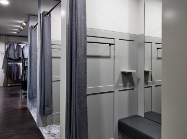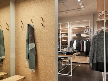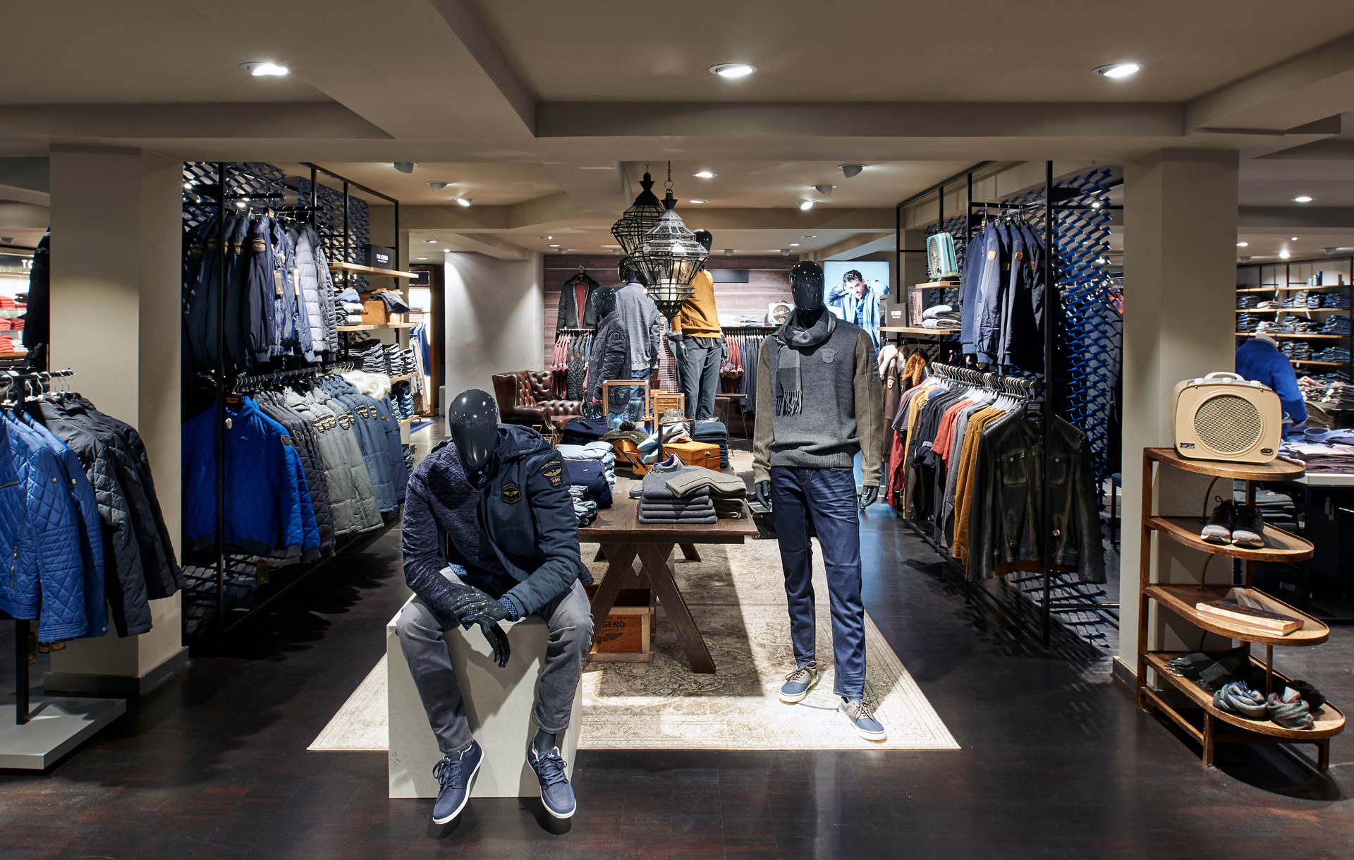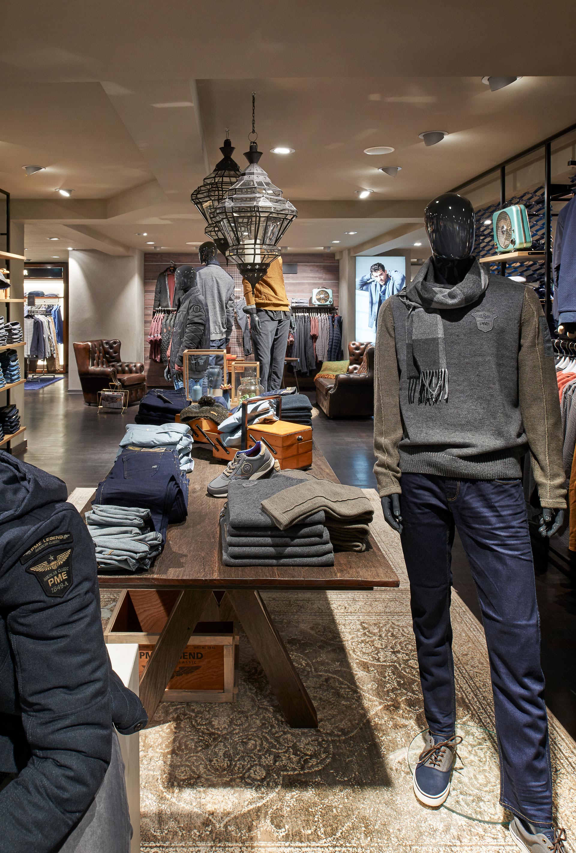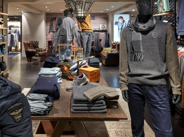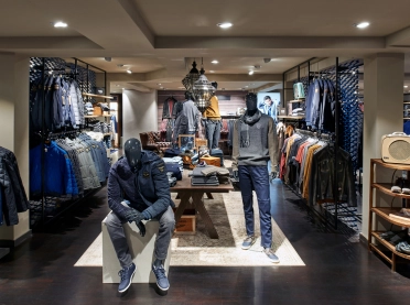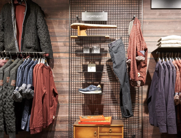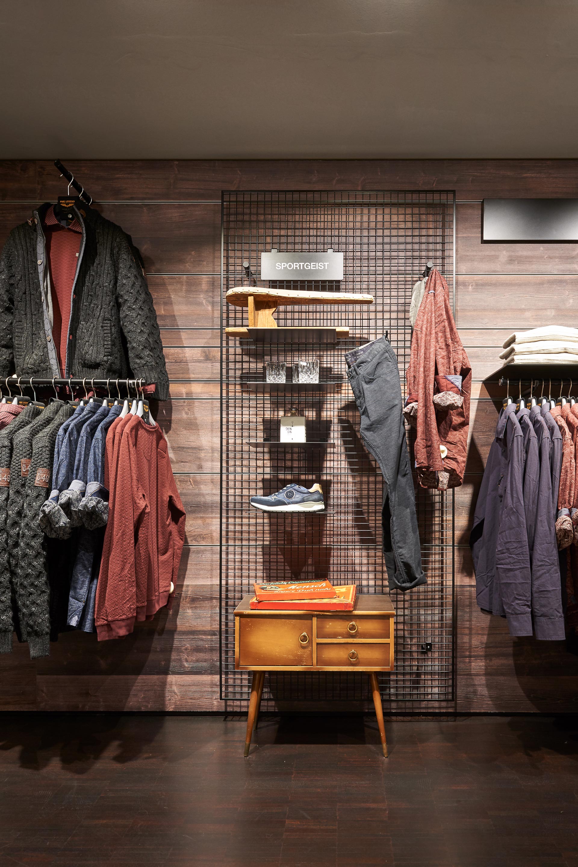 Dem Herrenbereich verpassten die Innenarchitekten von blocher partners einen roughen und markanten Look. Das Entree bildet der Bereich Casual mit seiner Highlightfläche, einem von zwei Raumtrennern mit Rückwänden aus grobmaschigem Streckmetall begrenzten und hervorgehobenen antiken Holztisch mit stolzen drei Metern Länge. Auf dem dunkel eingelassenen Echtholzboden setzen Vintagemöbel wie Ledersessel und Couches Akzente. Zur Präsentation der Waren werden Regale und Warenhänger aus dunklem Metall und hellem Holz eingesetzt, ergänzt durch Gitter aus schwarzem Metall.