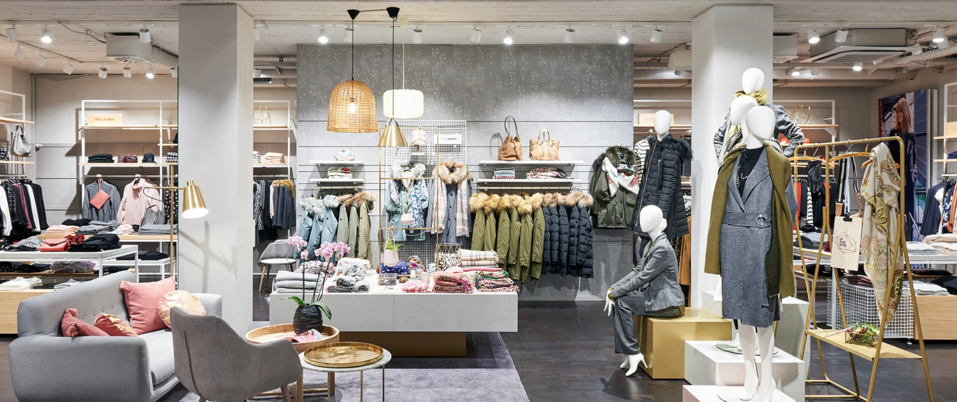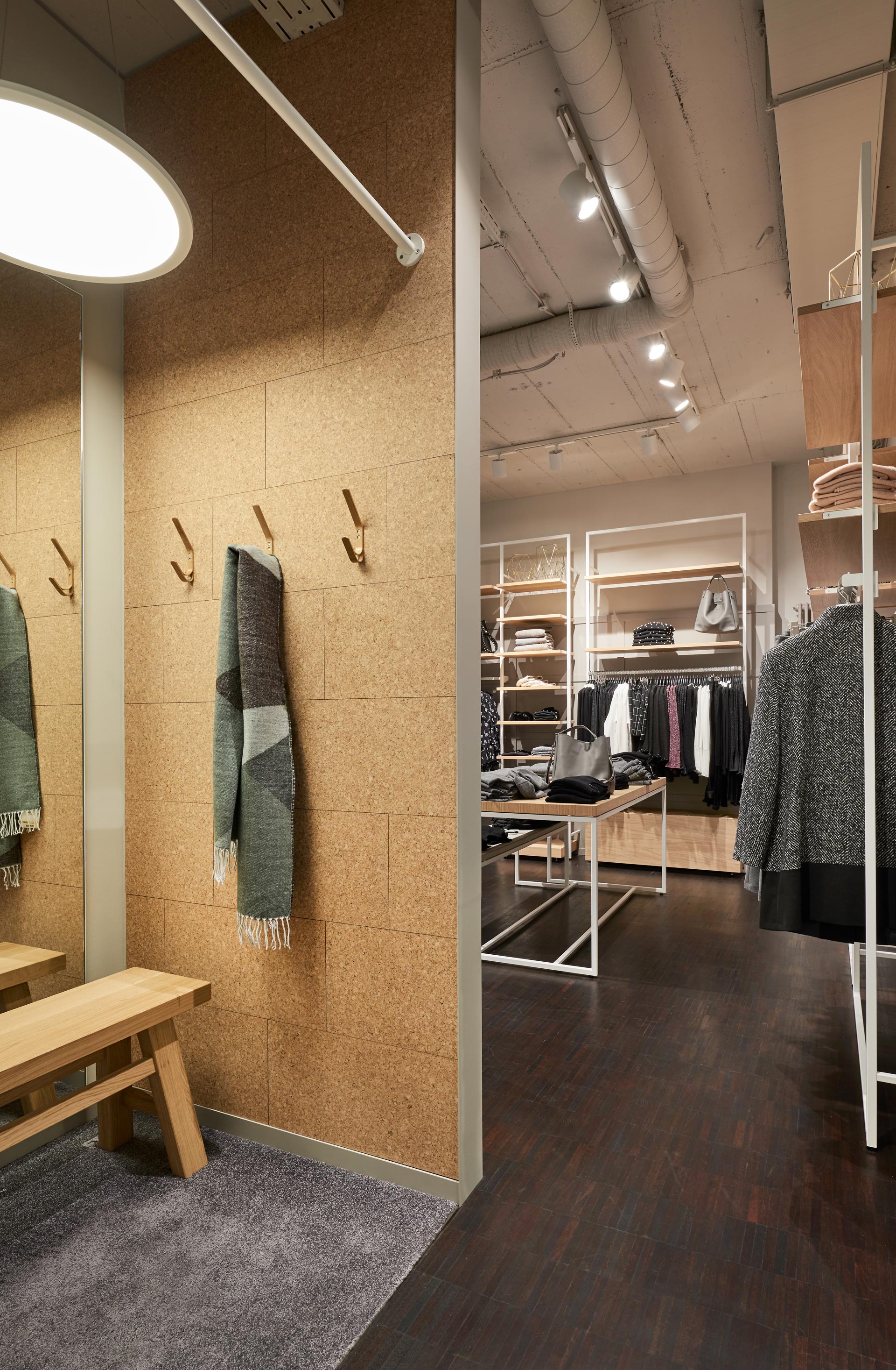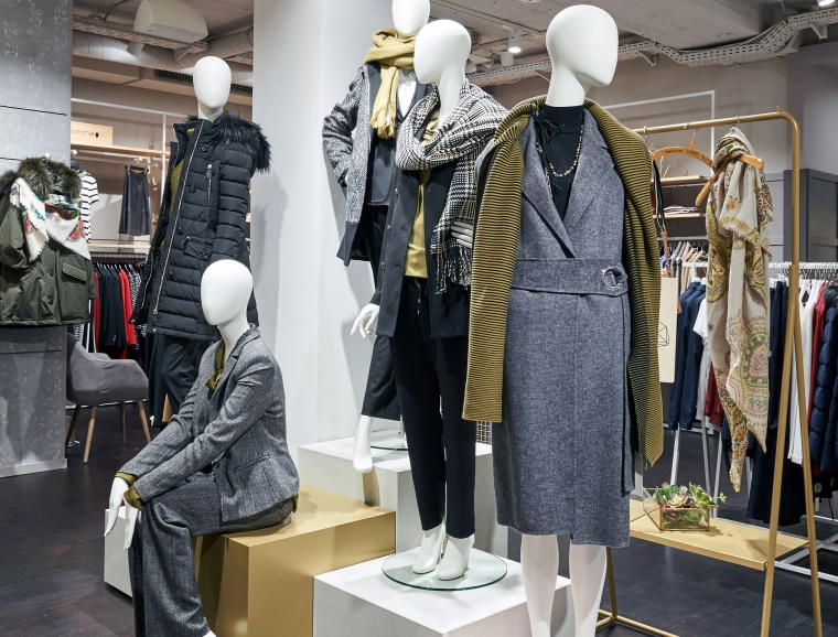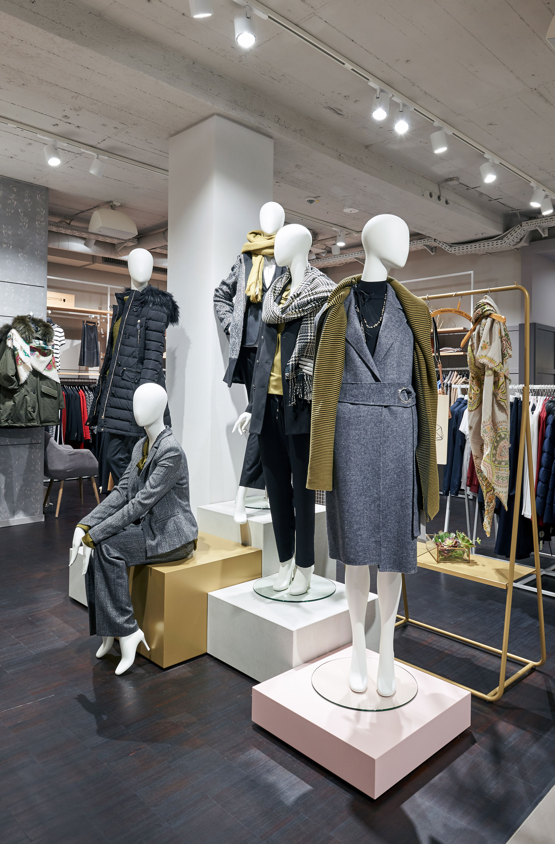 Die in Modern Woman und Anlassmode unterteilte Womenswear im ersten Obergeschoss ist nach der Entfernung der Zwischendecke deutlich heller und luftiger. Die weiße Wandvertäfelung sowie geometrisch klare Regalmöbel und Warenträger aus Holz und weißem Metall unterstützen den Effekt. Dazu kommen weiße Metallgitter als gestalterisches Element in der Rückwand sowie als Dekokuben unter den Tischen. Im Kontrast dazu stehen der dunkel eingelassene Holzboden und die darauf abgestimmten Sitzmöbel und Teppiche in der Mittelfläche. Dort wiederum laden kleine Tische in Messing- und Marmoroptik zum Verweilen ein, während Mittelmöbel zur Warenpräsentation in Sichtbetonoptik, zarten Rosa- oder Goldtönen Akzente setzen. Einen sehenswerten Kontrast bildet die Highlightwand in Sichtbetonoptik mit halbverwischten Ornamentmustern. Behaglich sind die Umkleidekabinen mit großformatigen Leuchten in Verbindung mit Teppichen, Sitzmöbeln aus Holz und einer Wandverkleidung aus Kork.