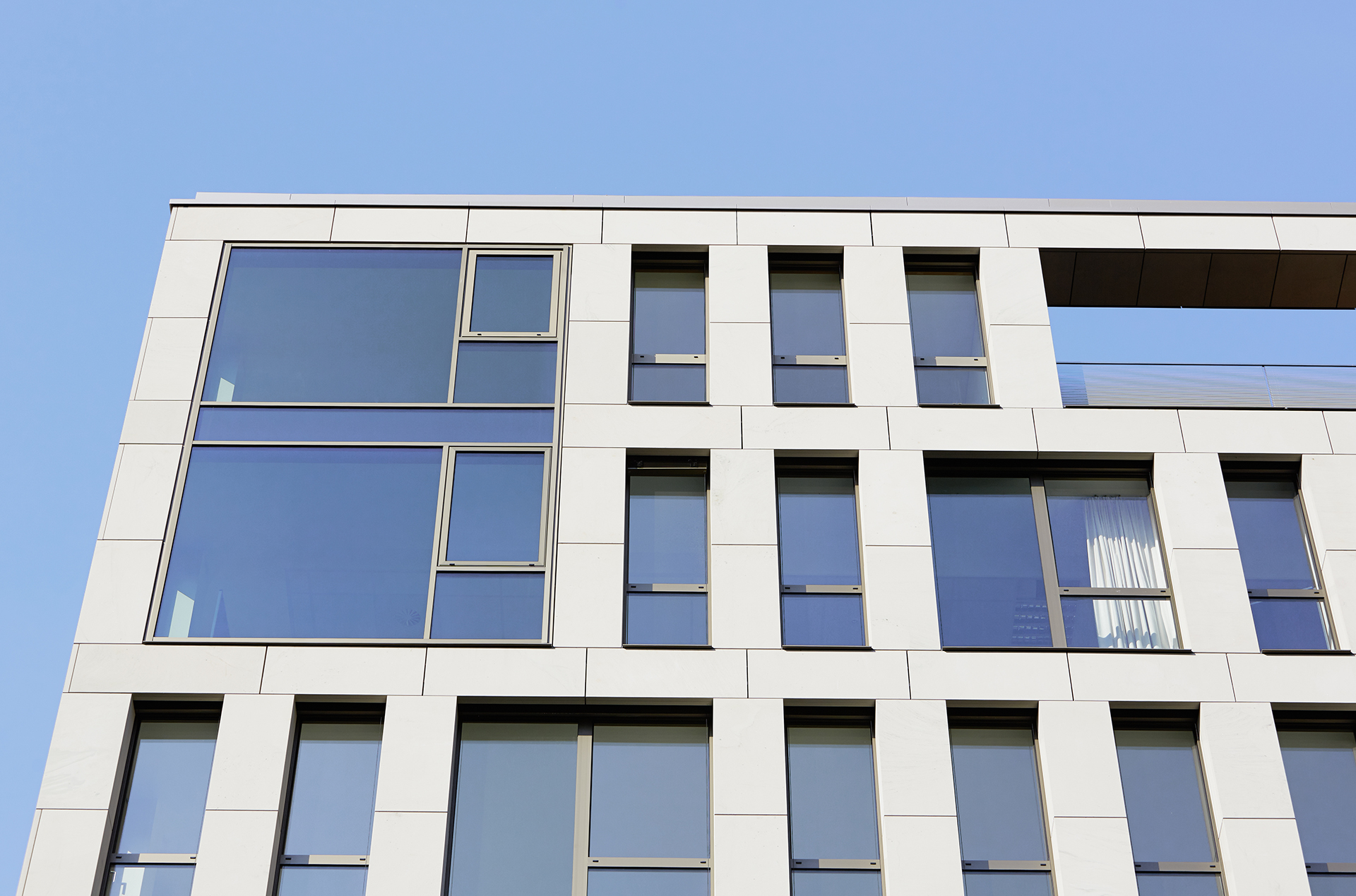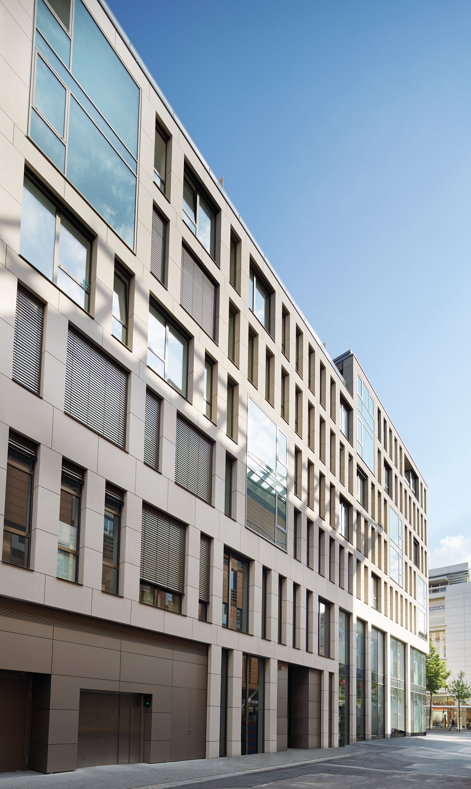 Neben Verkaufsflächen entstehen vier Geschosse mit Büros und Wohnungen inklusive Terrassen im Staffelgeschoss. Die Fassade wird durch die Geschossdecken und die Fassadenstützen mit ihren unterschiedlichen Rasterabständen bestimmt. Die massive Gitterstruktur aus hellem (Schönbrunner) Main-Sandstein interpretiert die stadtbildprägende Lochfassade neu. Die zweigeschossige Schaufensterfassade schafft Transparenz auf den Handelsflächen. Das Gebäude schließt ein für Mannheim typisches Quadrat und schafft damit zugleich eine attraktivere Innenhofsituation.