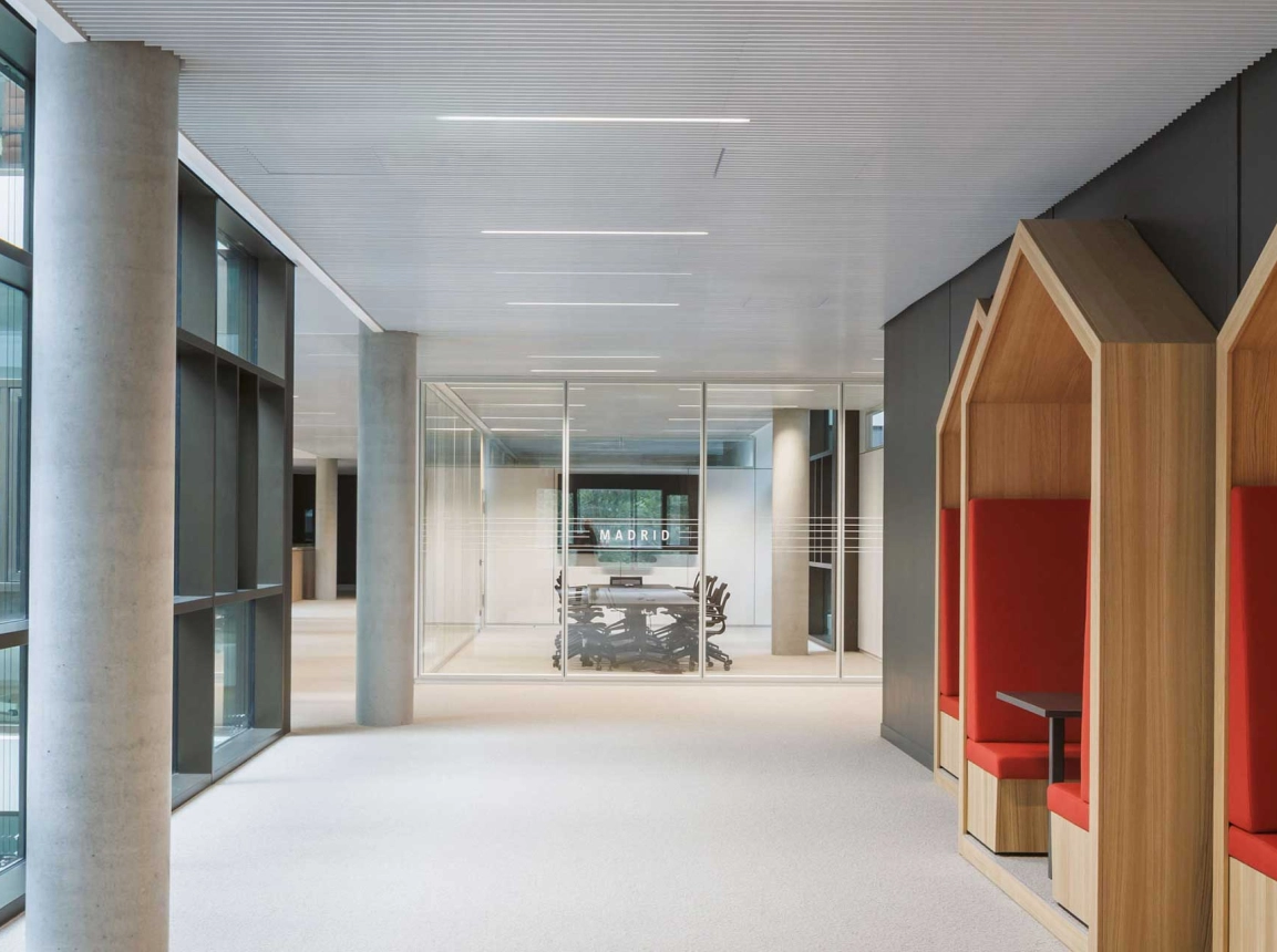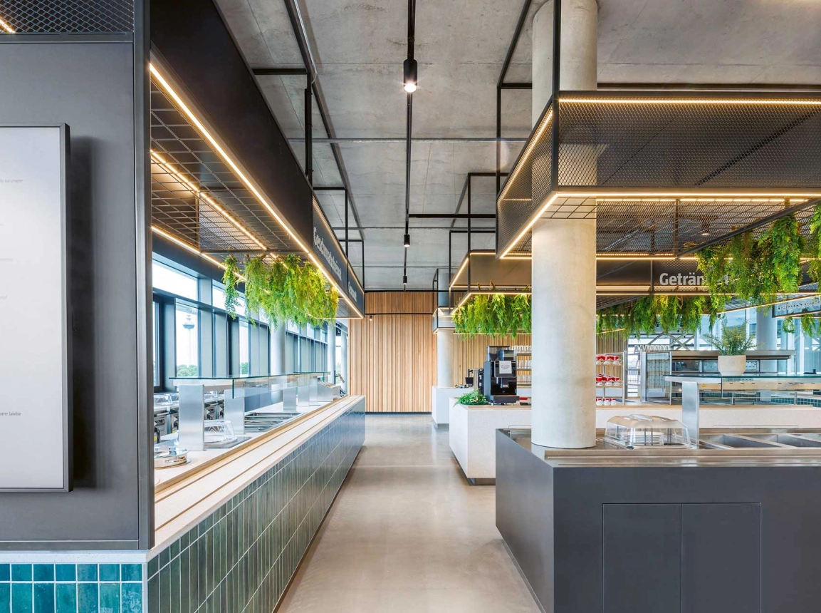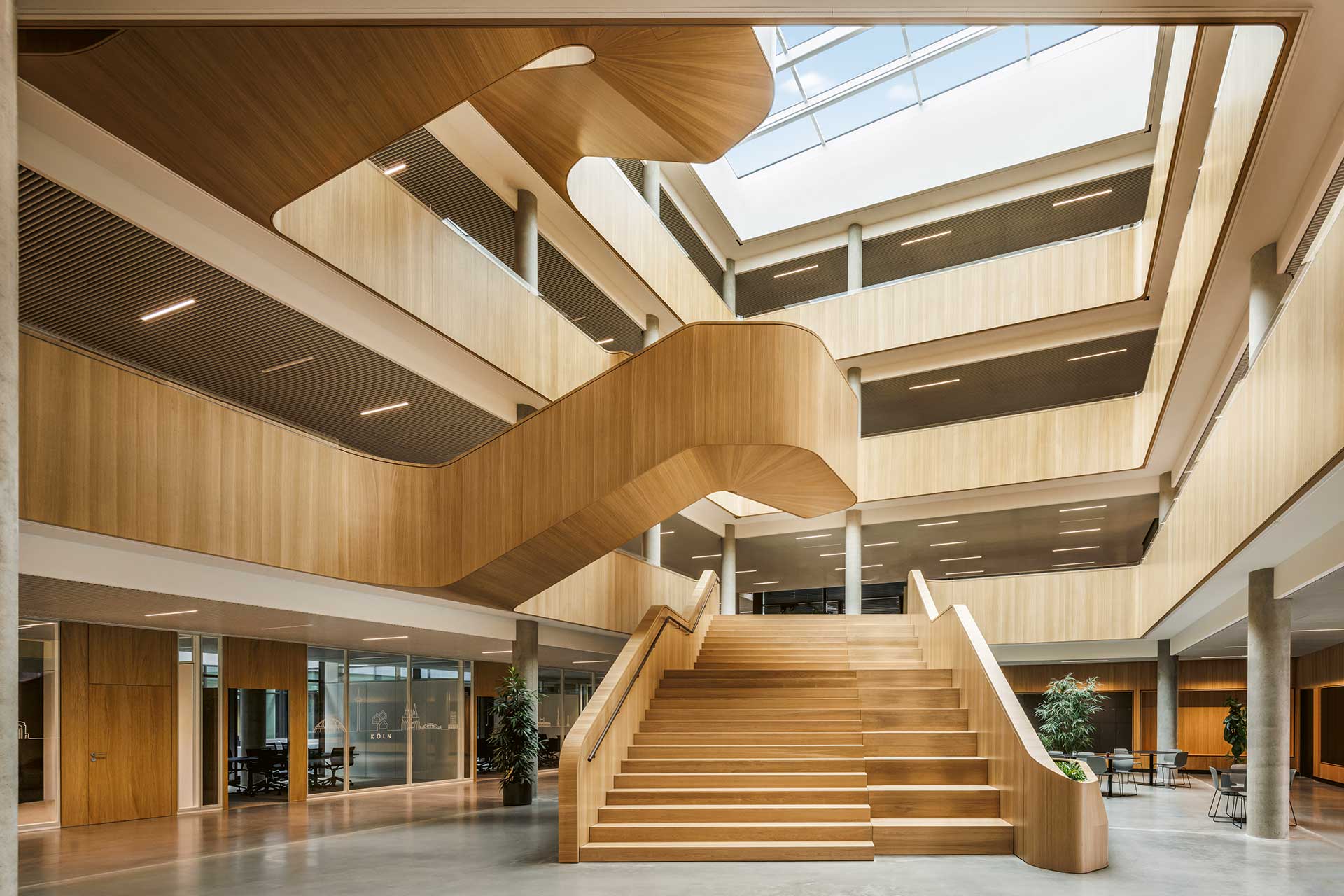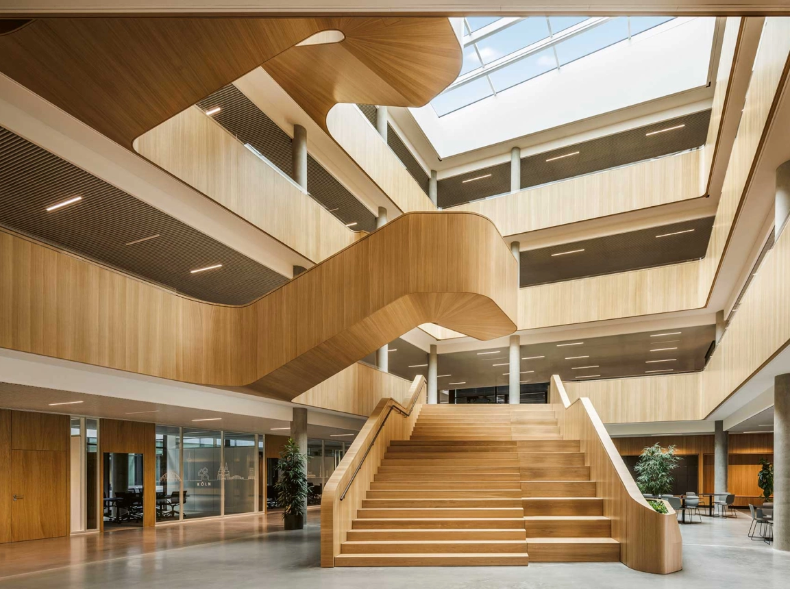 Der neue Bauhaus-Campus in Mannheim vereint Alt und Neu in einem modernen Arbeitsumfeld. Ein fünfgeschossiger Neubau, der nach KfW40-Standard errichtet wurde, ergänzt das Bestandsgebäude und schafft Raum für etwa 840 Mitarbeitende. Zwei offene Innenhöfe, lichtdurchflutete Atrien und eine begrünte Dachlandschaft unterstreichen die einladende Atmosphäre. Flexible Arbeitsplätze und vielseitige Begegnungsorte prägen das Gebäude ebenso skulpturale Holztreppe im Atrium.