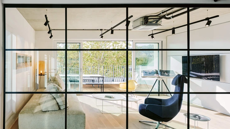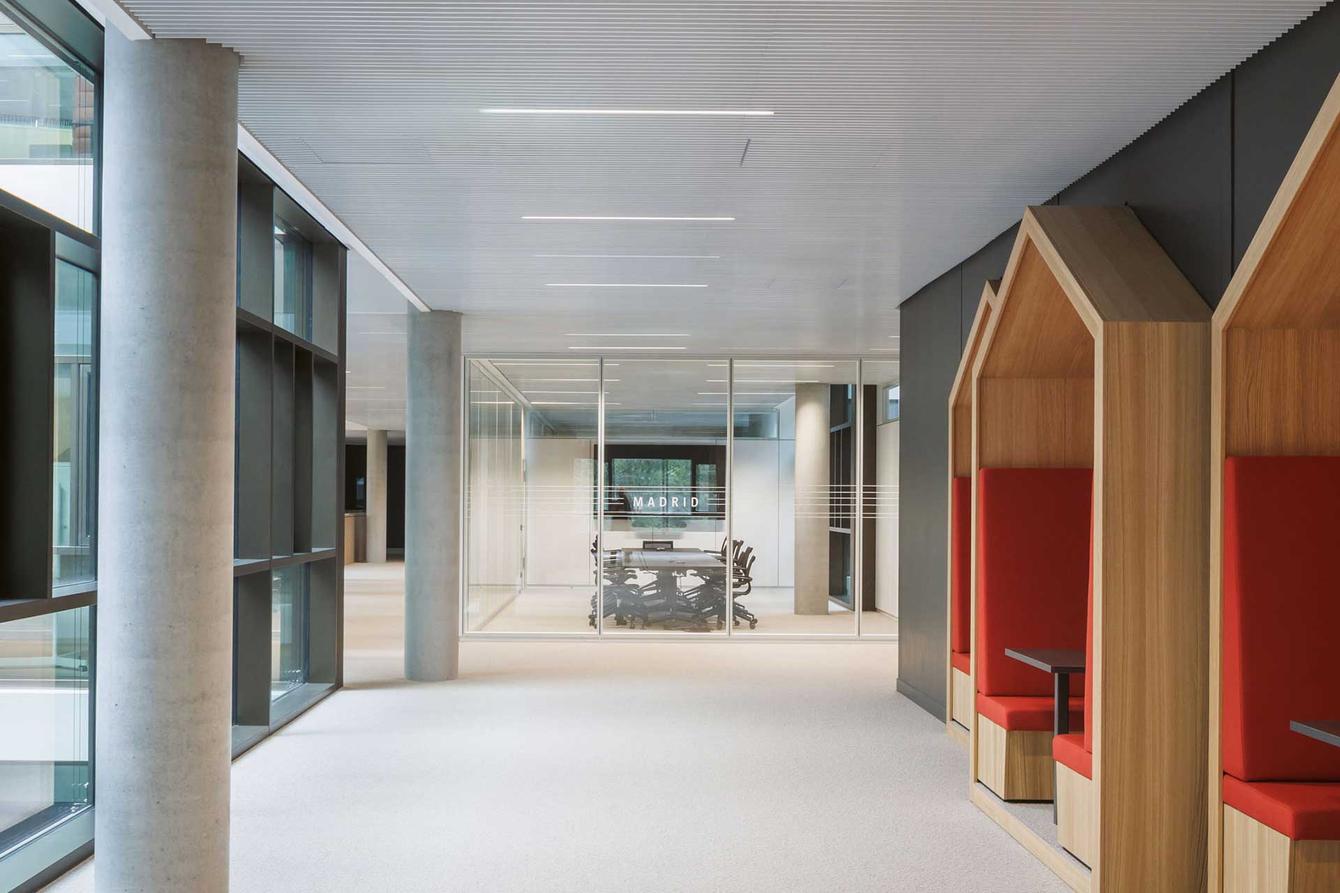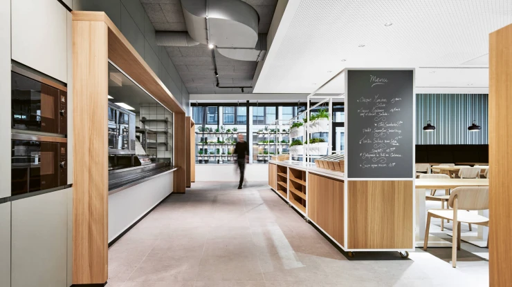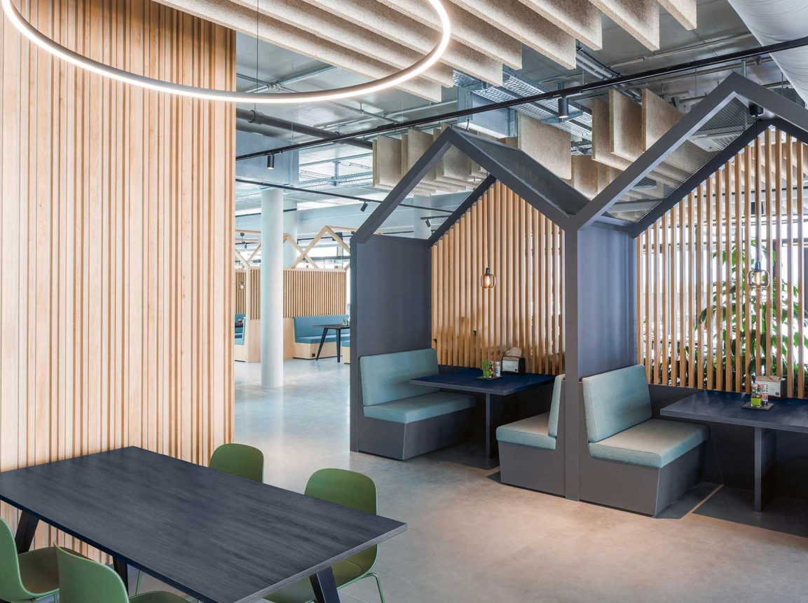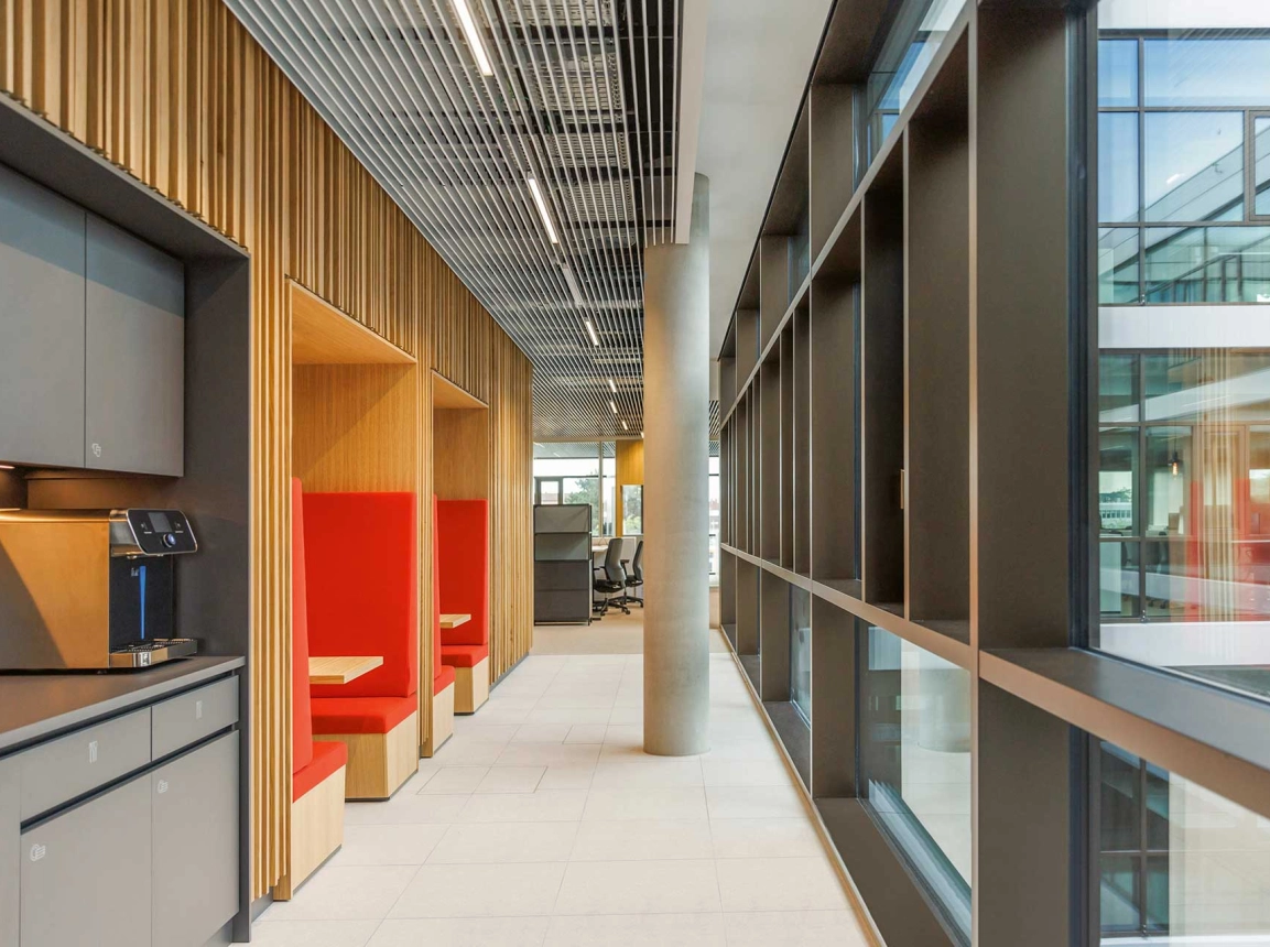 Der neue Bauhaus-Campus in Mannheim vereint Alt und Neu in einem modernen Arbeitsumfeld. Ein fünfgeschossiger Neubau, der nach KfW40-Standard errichtet wurde, ergänzt das Bestandsgebäude und schafft Raum für etwa 840 Mitarbeitende. Zwei offene Innenhöfe, lichtdurchflutete Atrien und eine begrünte Dachlandschaft unterstreichen die einladende Atmosphäre. Flexible Arbeitsplätze und vielseitige Begegnungsorte prägen das Gebäude ebenso skulpturale Holztreppe im Atrium.
