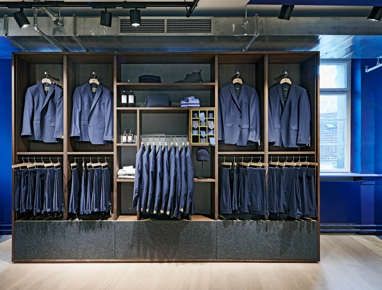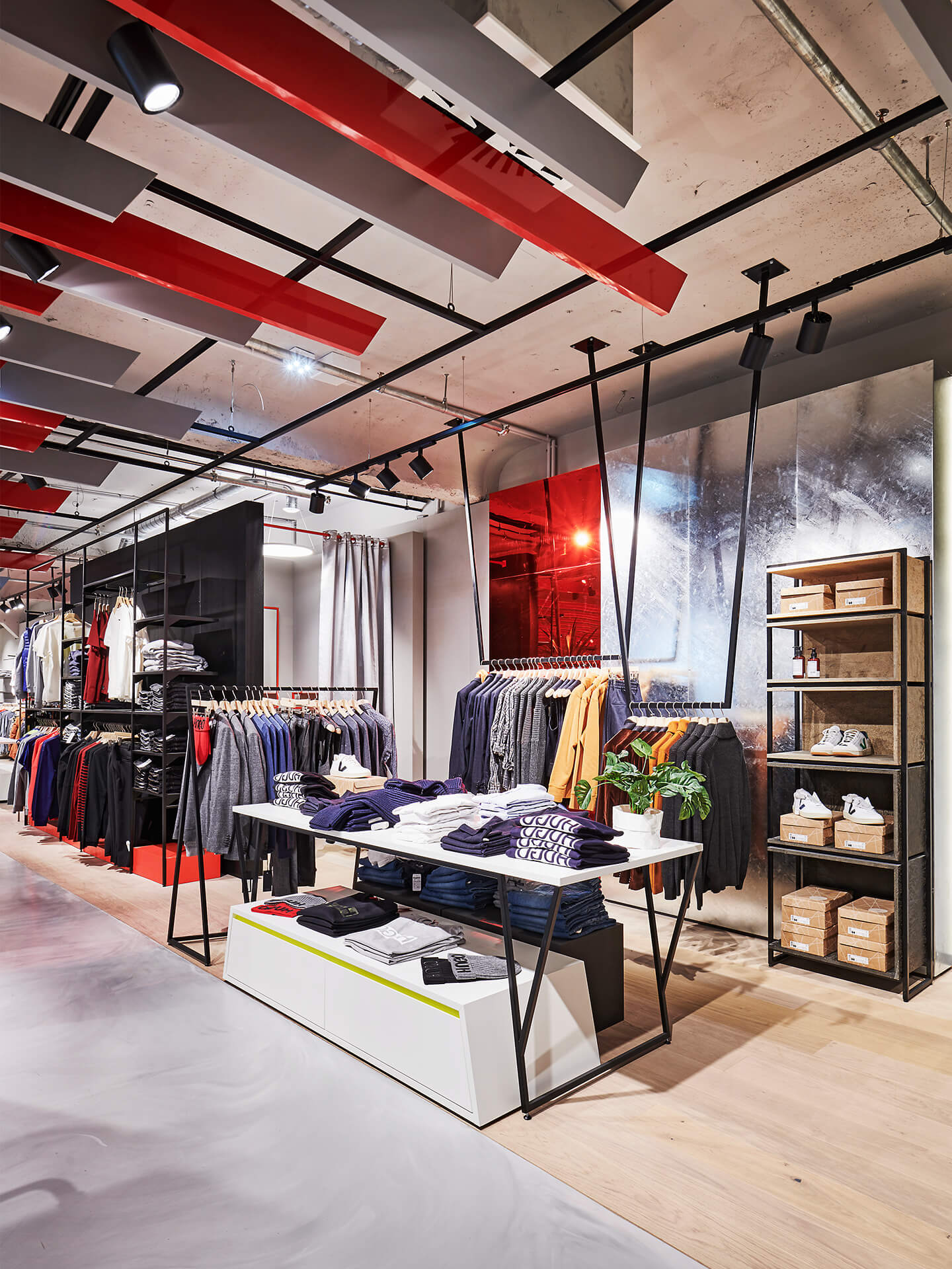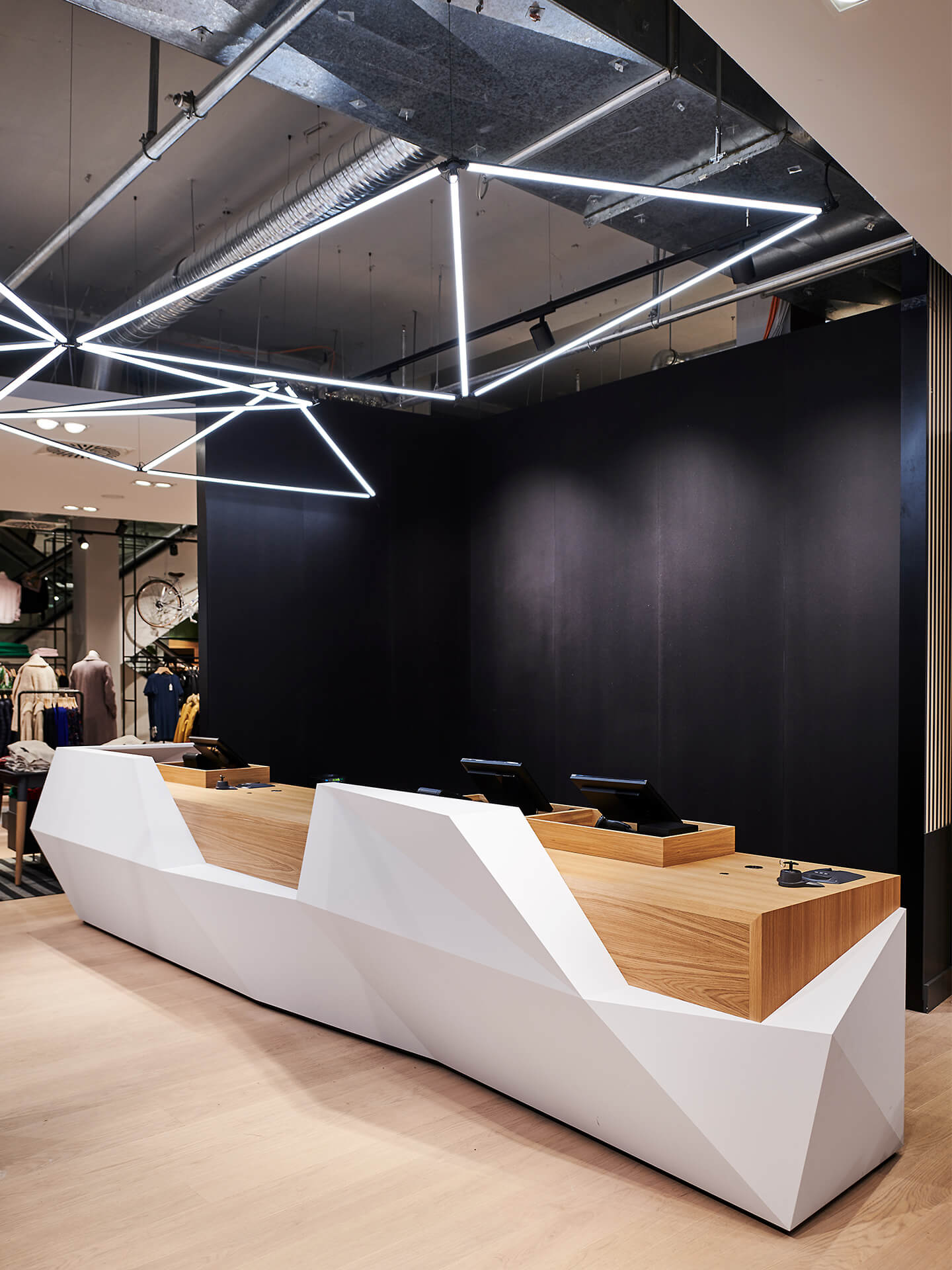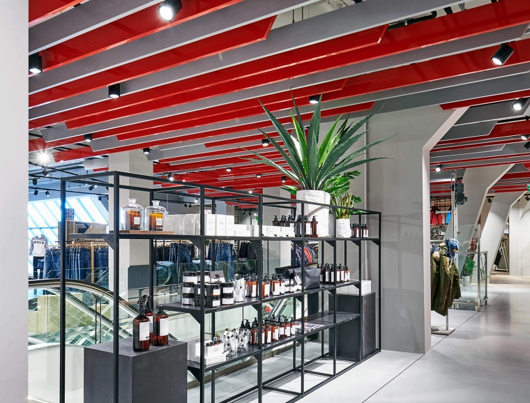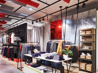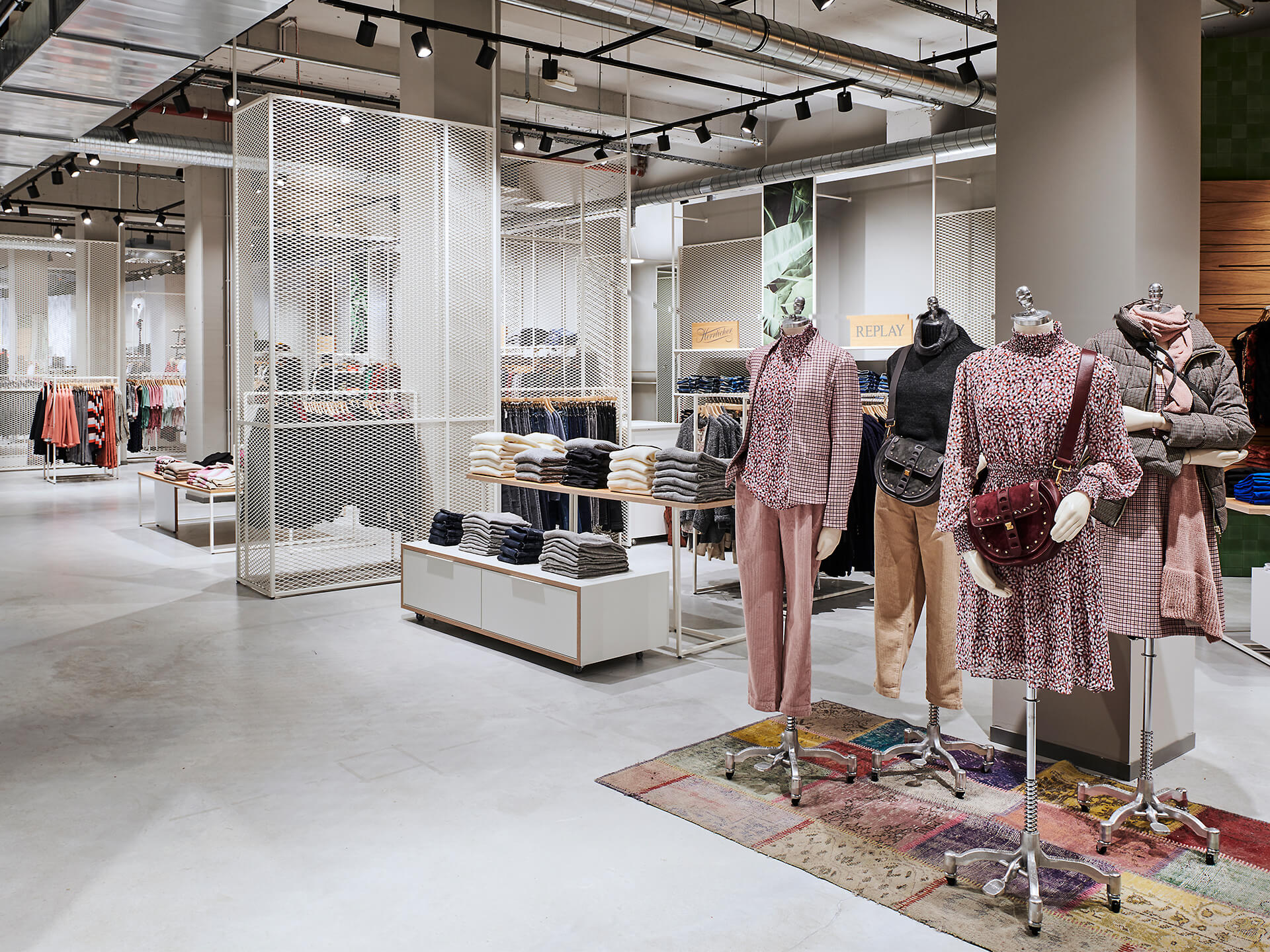 Bei der Neugestaltung des Erd- sowie des zweiten Obergeschosses wird eine wohltuende Offenheit durch die Zonierung mittels Farbe und Materialität erreicht. Im Erdgeschoss mit seinem differenzierten Angebot inklusive Shop-in-Shop-Flächen sowie einem Damen-Young-Fashion-Bereich mit separatem Eingang wird der jeweilige individuelle Look von einer verbindenden gestalterischen Klammer aus Boden, Decke und Wänden eingerahmt. Dieses Prinzip setzt sich in der Herrenabteilung im zweiten Obergeschoss fort. Ein Blickfang ist auch der Kassenkorpus im Erdgeschoss, dessen dynamisch geformte Hülle die Formensprache des gesamten Modehauses widerspiegelt.