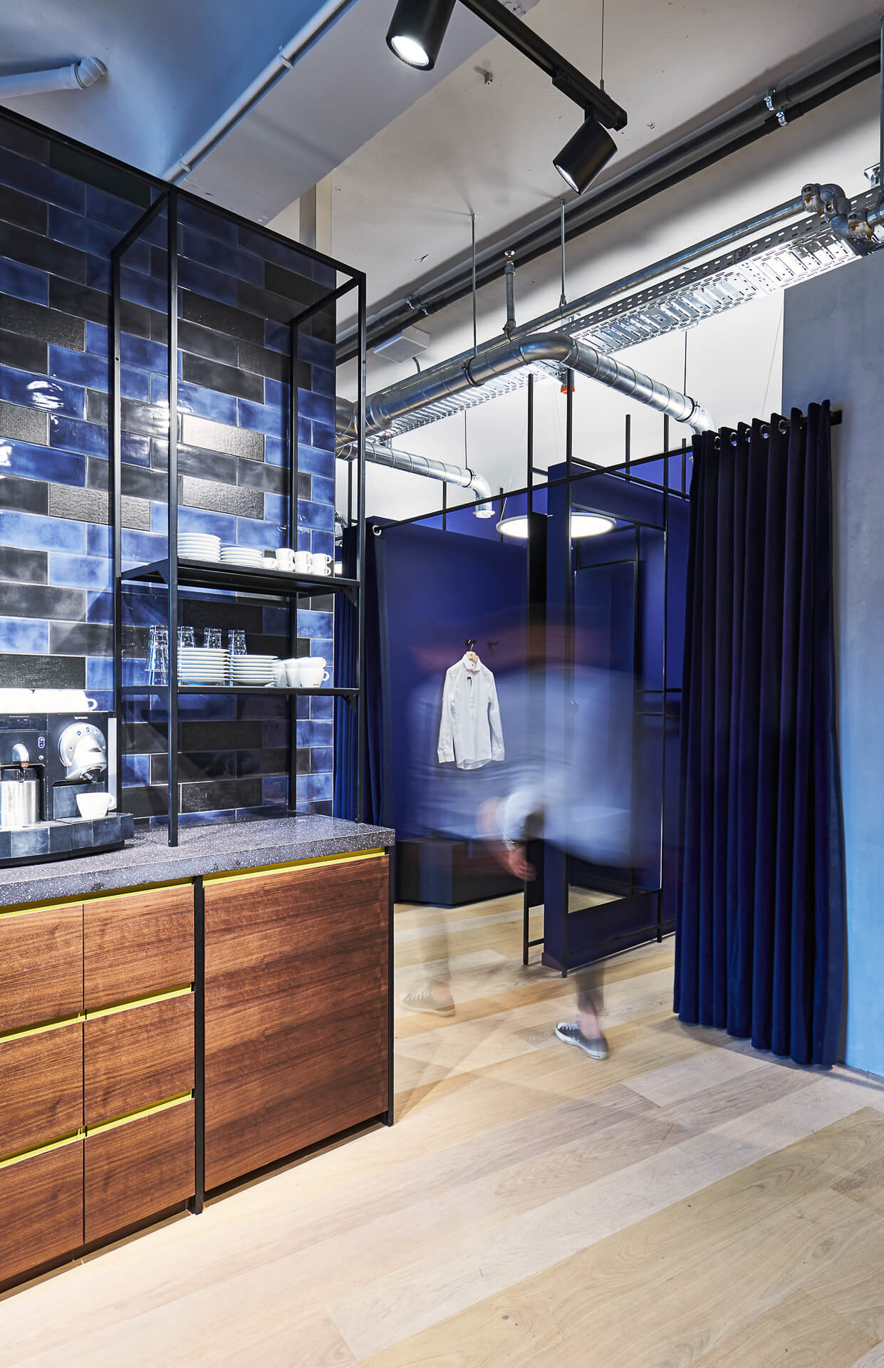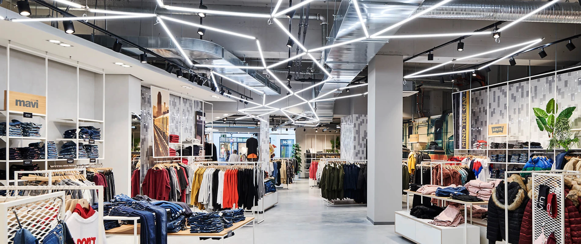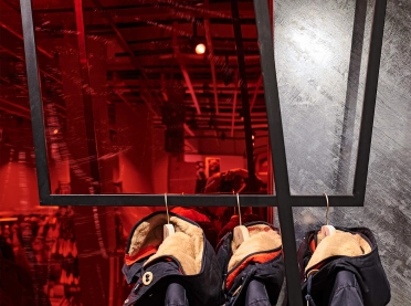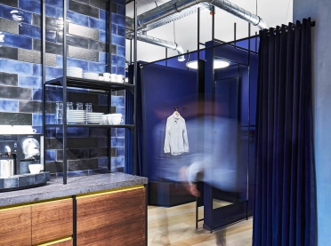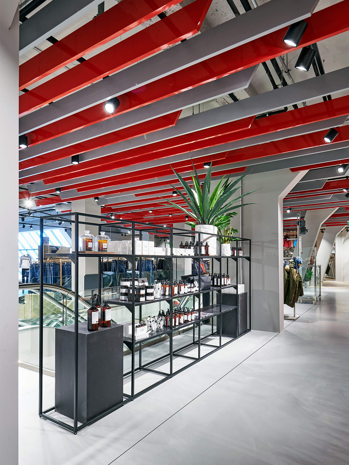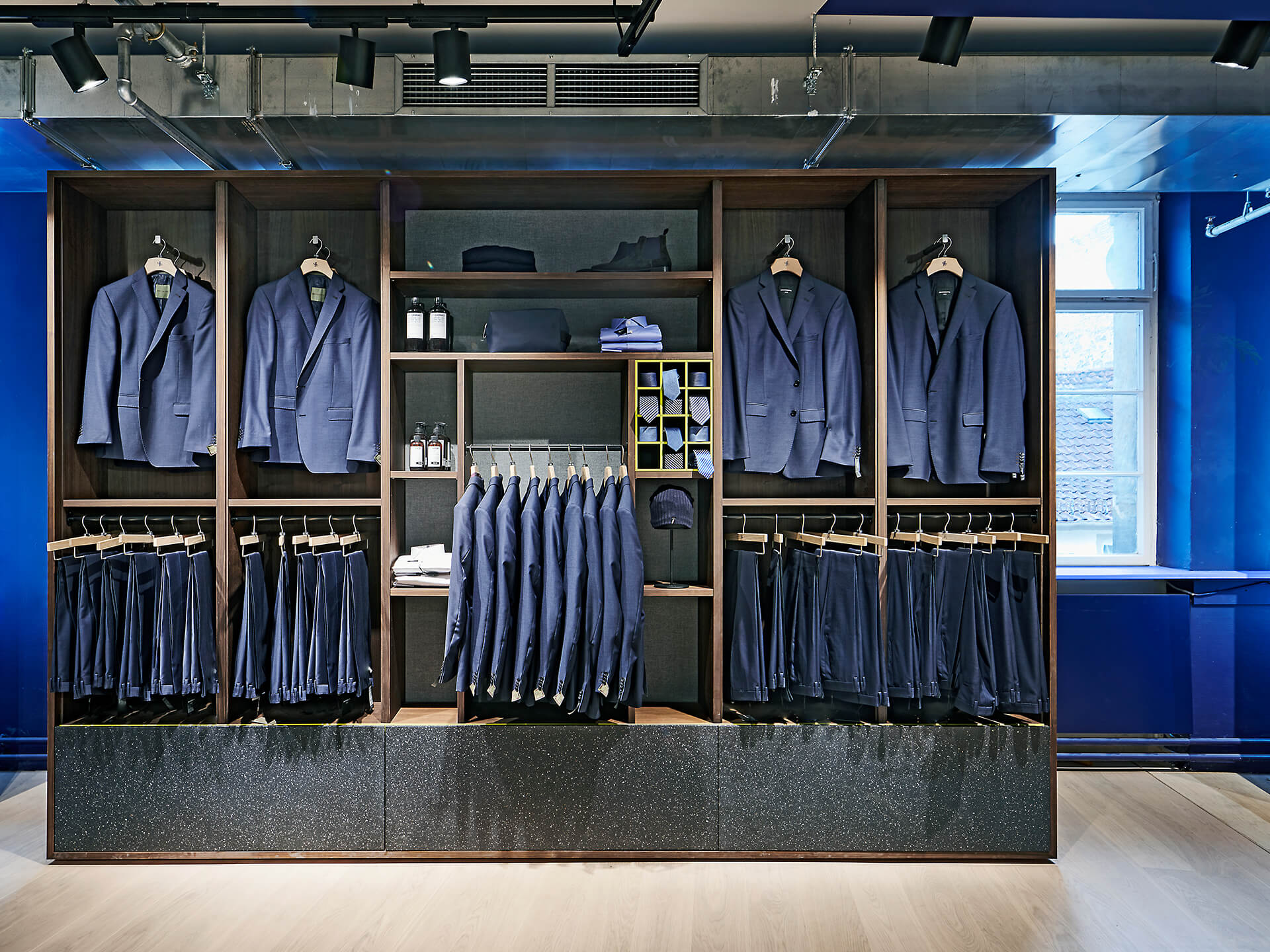 Bei der Neugestaltung des Erd- sowie des zweiten Obergeschosses wird eine wohltuende Offenheit durch die Zonierung mittels Farbe und Materialität erreicht. Im Erdgeschoss mit seinem differenzierten Angebot inklusive Shop-in-Shop-Flächen sowie einem Damen-Young-Fashion-Bereich mit separatem Eingang wird der jeweilige individuelle Look von einer verbindenden gestalterischen Klammer aus Boden, Decke und Wänden eingerahmt. Dieses Prinzip setzt sich in der Herrenabteilung im zweiten Obergeschoss fort. Ein Blickfang ist auch der Kassenkorpus im Erdgeschoss, dessen dynamisch geformte Hülle die Formensprache des gesamten Modehauses widerspiegelt.