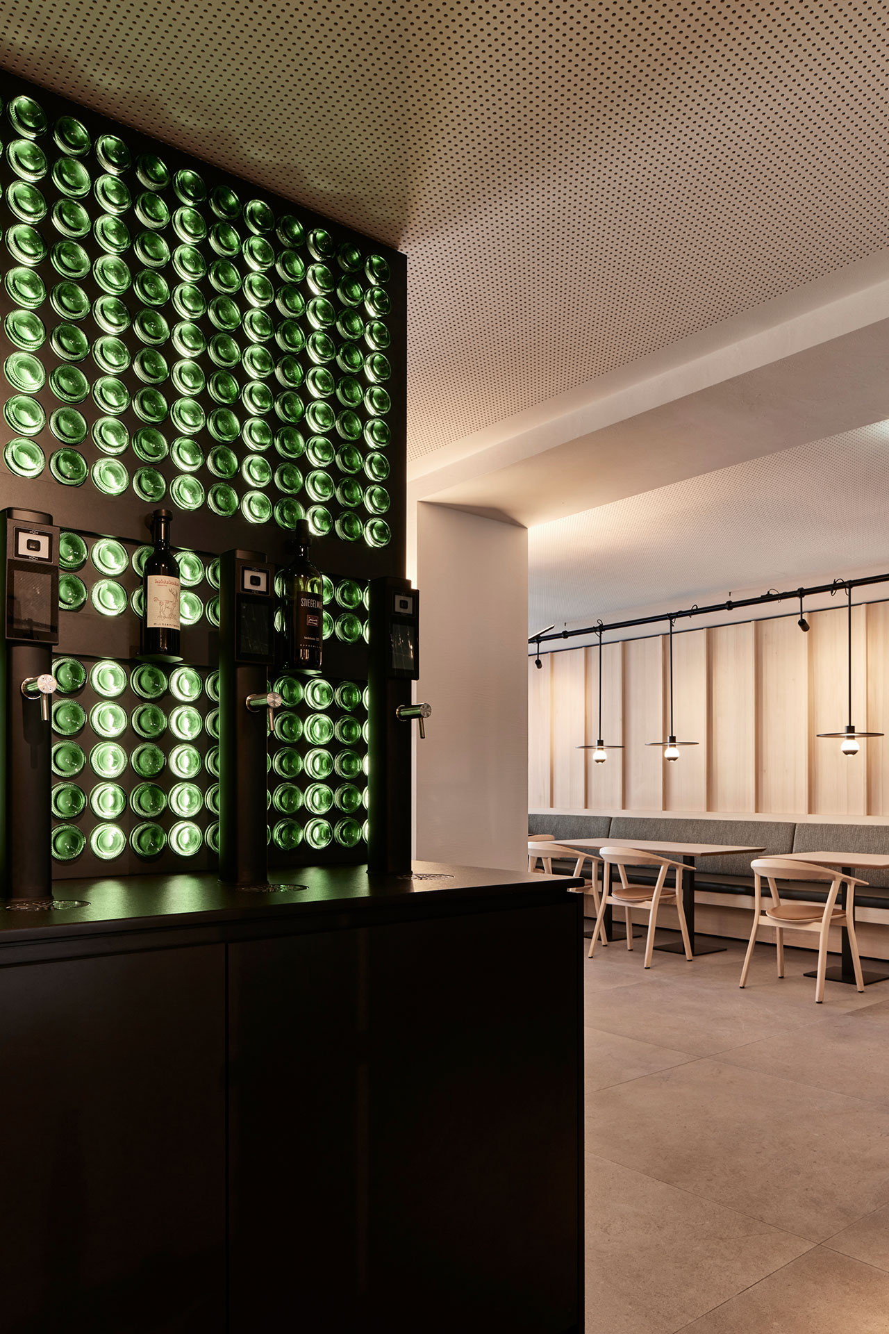 Das bestehende Gebäude wurde um einen markanten Neubau erweitert, der sich in drei leicht versetzte Volumina gliedert. Die charakteristischen Satteldächer greifen alpine Bautraditionen auf und interpretieren sie zeitgemäß. Besonders auffällig: die Glasfassade mit vorgelagerten Metalllamellen in perlbeige, die dem Ensemble eine rhythmische Leichtigkeit verleihen. Unterirdisch ergänzt eine zweigeschossige Tiefgarage das Angebot.