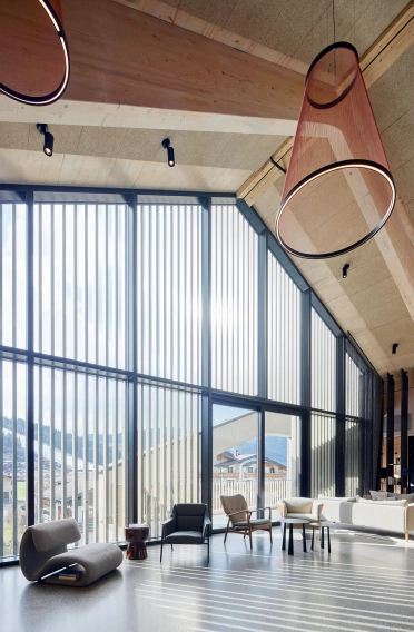 Im Inneren legten die Innenarchitekten Wert auf die Verbindung von regionalen Materialien und modernem Interieur: alpiner Kompositstein Nagelfluh, lokale Weißtanne und gestockter Sichtbeton treffen auf eine klare, sportlich-elegante Designsprache. Das neu gestaltete Erdgeschoss beherbergt neben Rezeption und Gastronomie auch großzügige Loungeflächen, während das Restaurant mit einem beeindruckenden Panoramafenster den Blick auf die umliegende Bergwelt freigibt.