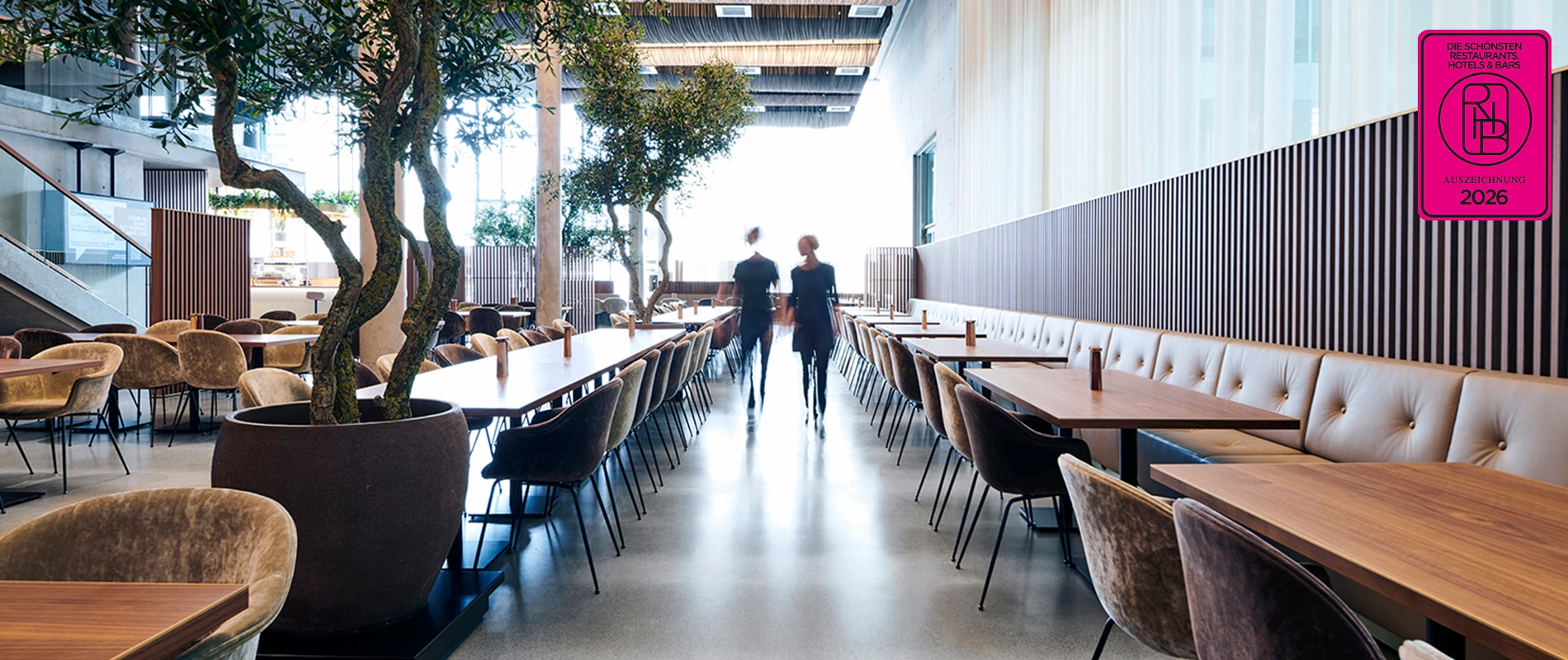 Im Erdgeschoss des Verwaltungsgebäudes empfängt eine mondäne Lounge die Besucher. Hier ist auch das Mitarbeitercasino mit angrenzender Terrasse verortet. Wie ein Solitär im Raum steht die neue Bar in der Kantine. Mit ihren Licht- und Pflanzringen belebt sie den Luftraum und dient als kommunikativer Anlaufpunkt für die Mitarbeiter. Die durchdachte Neugestaltung schafft auf zwei Etagen eine einladende Atmosphäre und fördert den Austausch zwischen den Mitarbeitern. Das Ergebnis ist ein funktionales und inspirierendes Mitarbeiterrestaurant, das die Unternehmenskultur von Hugo Boss widerspiegelt.