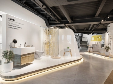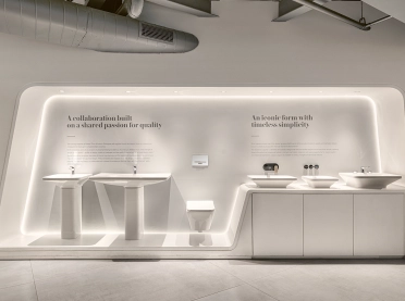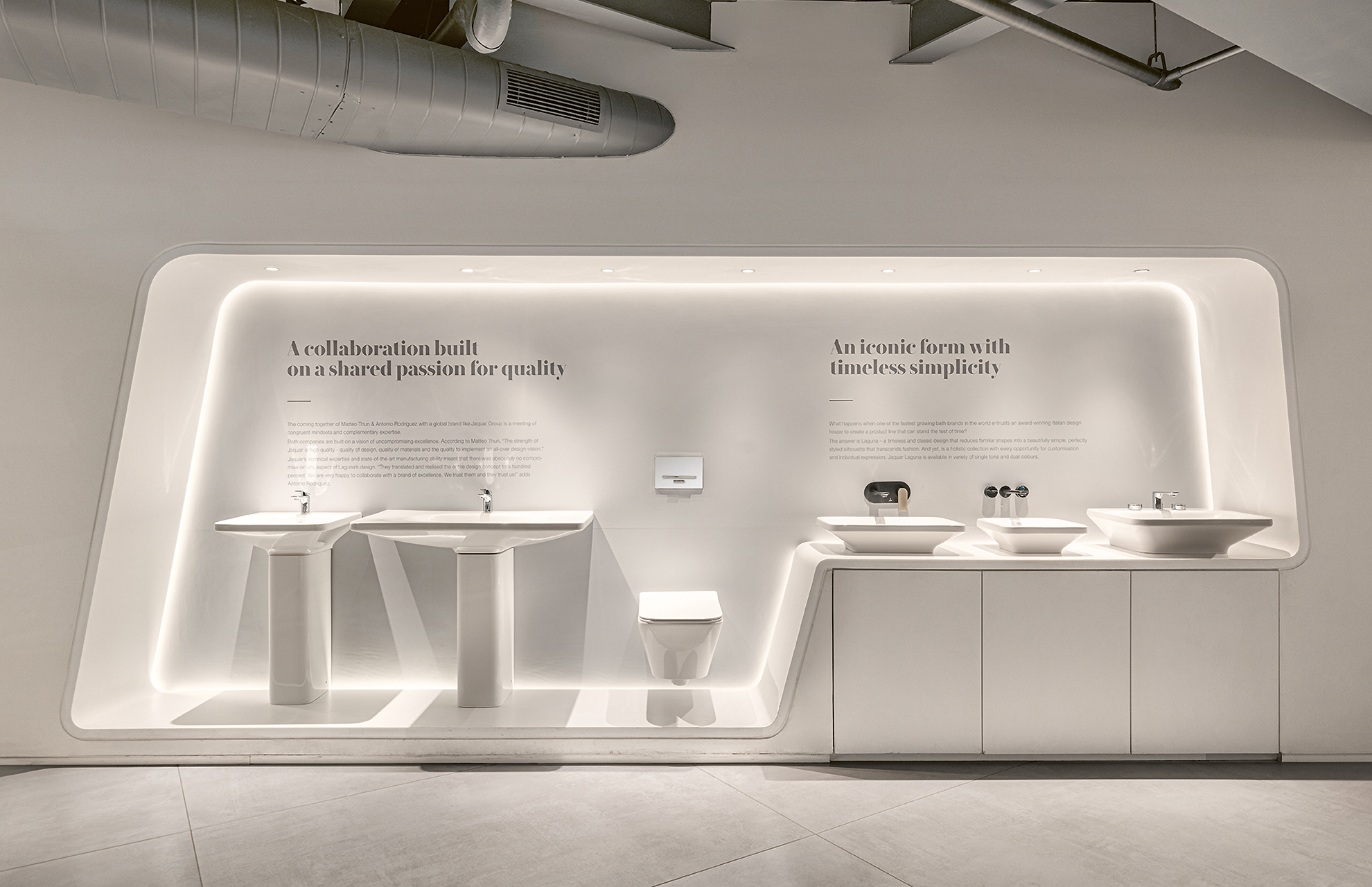 Eine klare Struktur war dabei essenziell: Die drei Produktlinien – Esco, Jaquar und Artize – sind präzise inszeniert, das macht die Unterschiede sofort erfassbar. Mit weißen Rückwänden haben die Innenarchitekten eine ruhige Grundatmosphäre hergestellt, die die eigentlichen »Stars«, die Produkte, wirken lässt. Ergänzend schaffen inselartige Bereiche realitätsnahe Badezimmer-Szenarien mit variierenden Materialien und Oberflächen.