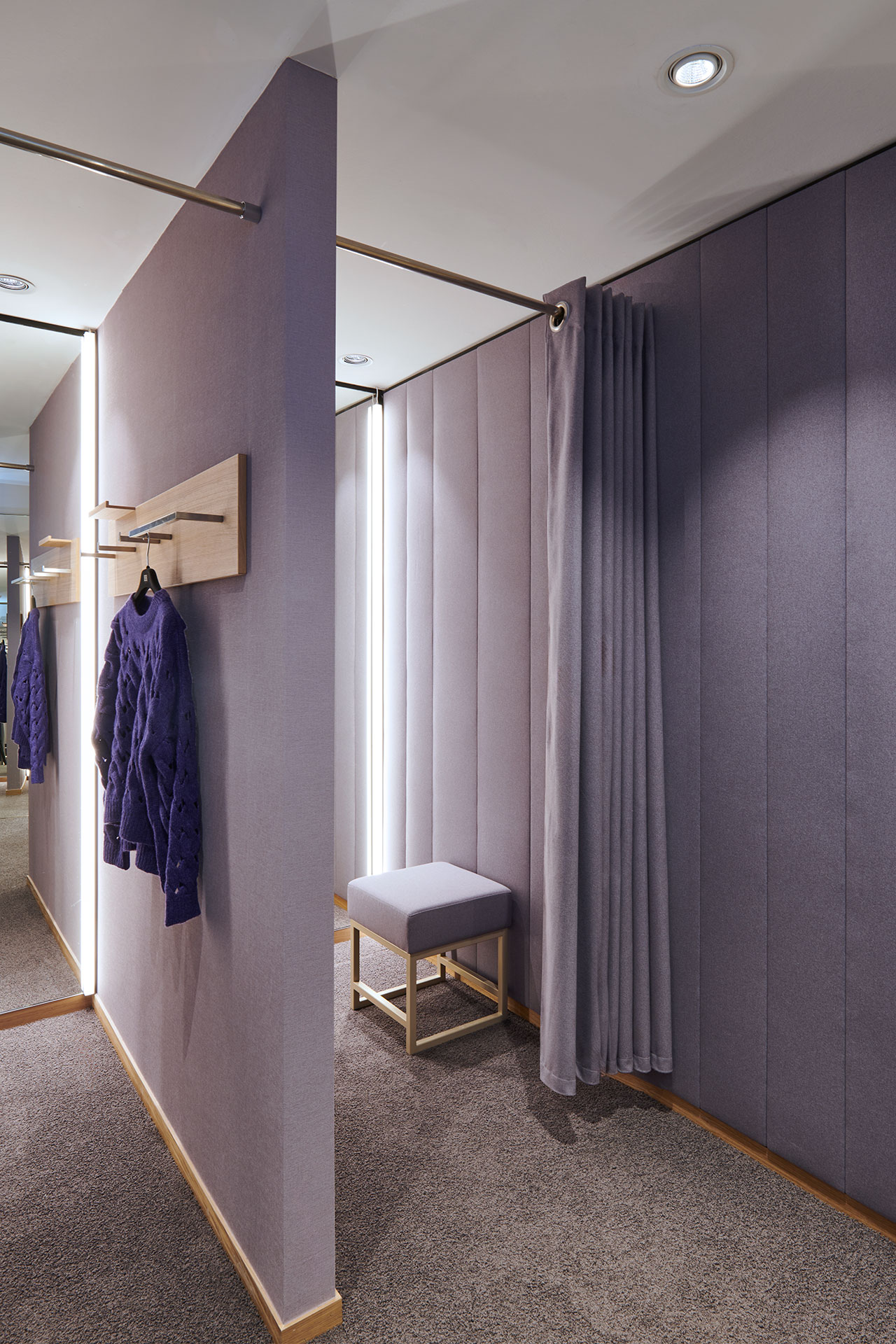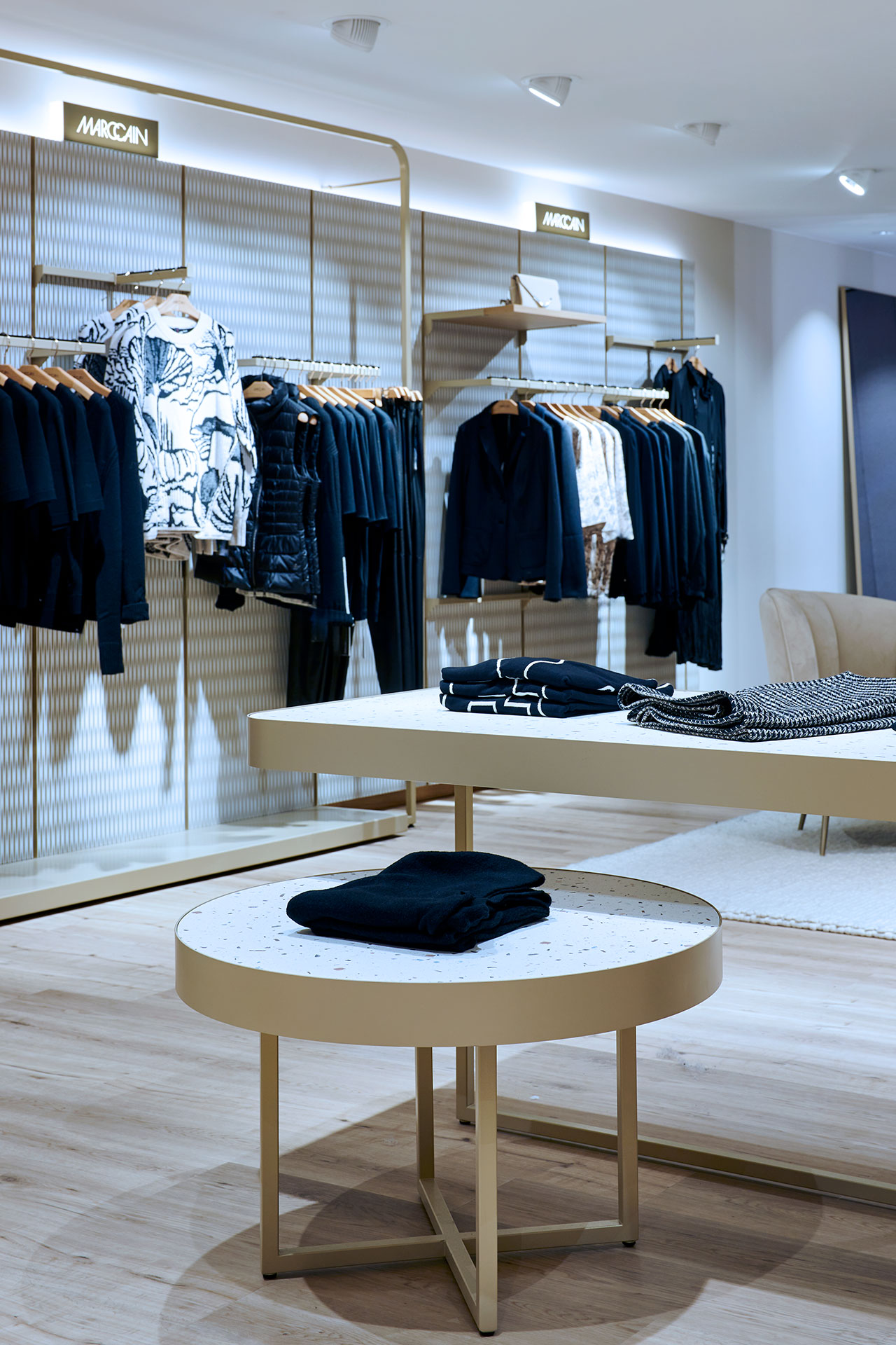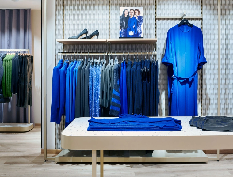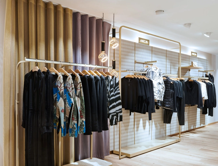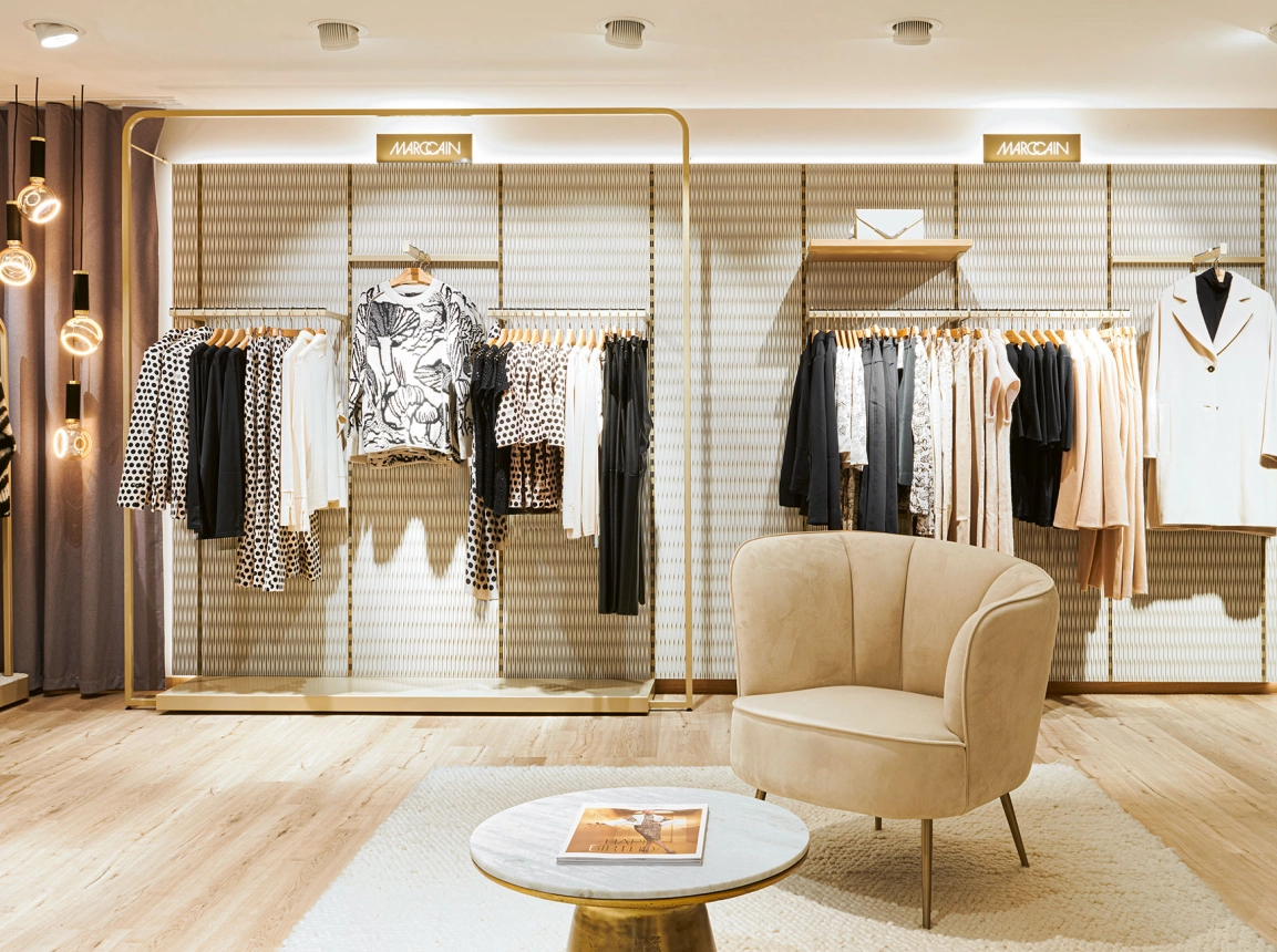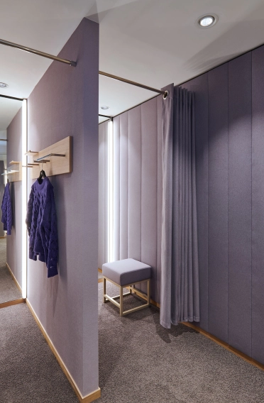 Im zweiten Obergeschoss wurde die Damen-Premium- und Jacken-Abteilung einem mondänen Upgrade unterzogen. Innovative Ladenbauelemente, die an der Wand verschoben werden können, ermöglichen eine flexible Strukturierung der Abteilungen. Der Premiumbereich wurde mit hochwertigen Materialien aufgewertet. Zudem wurde im gesamten Geschoss ein einheitliches Kabinenkonzept umgesetzt.