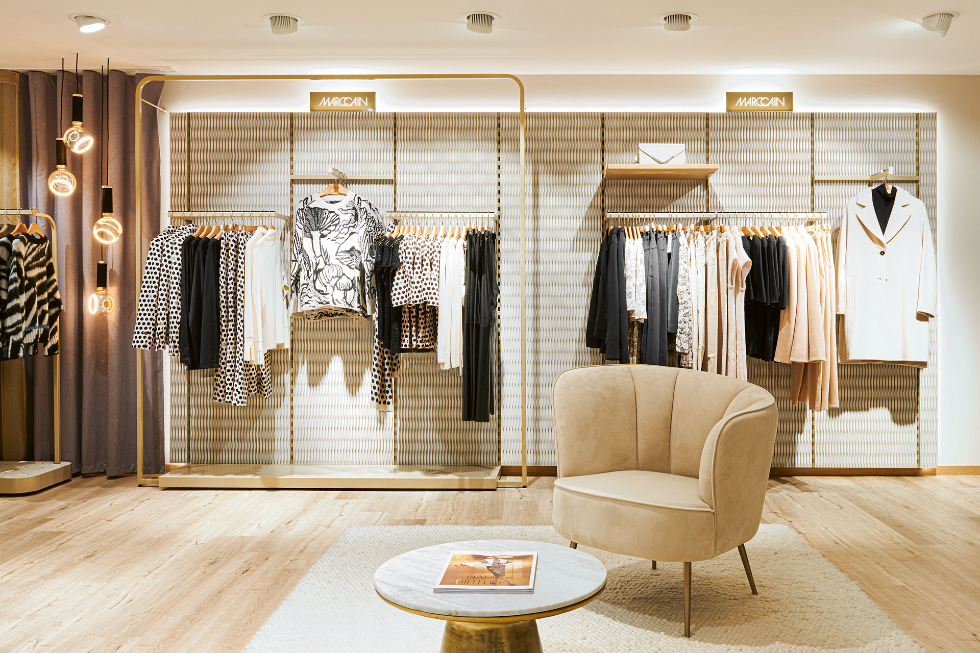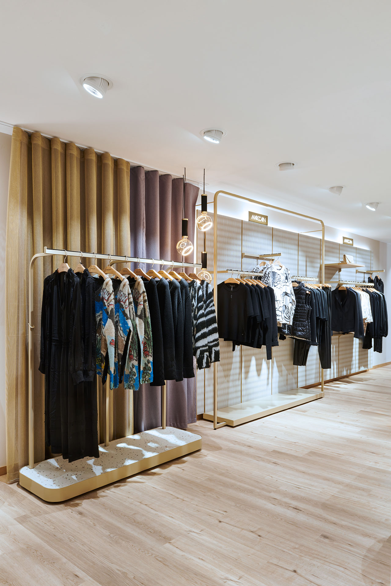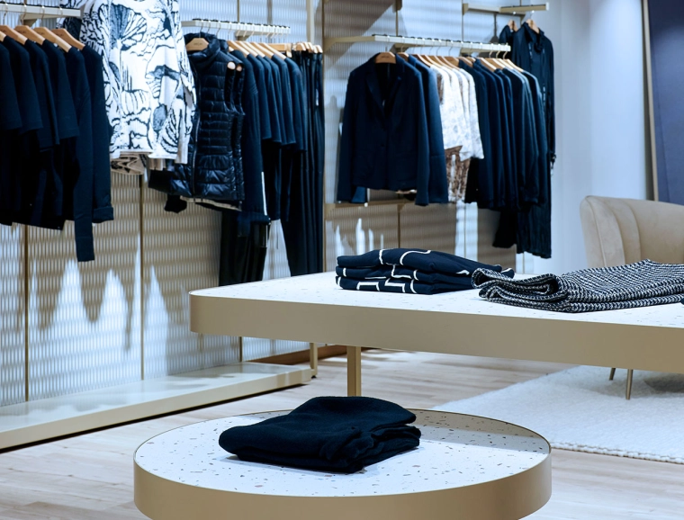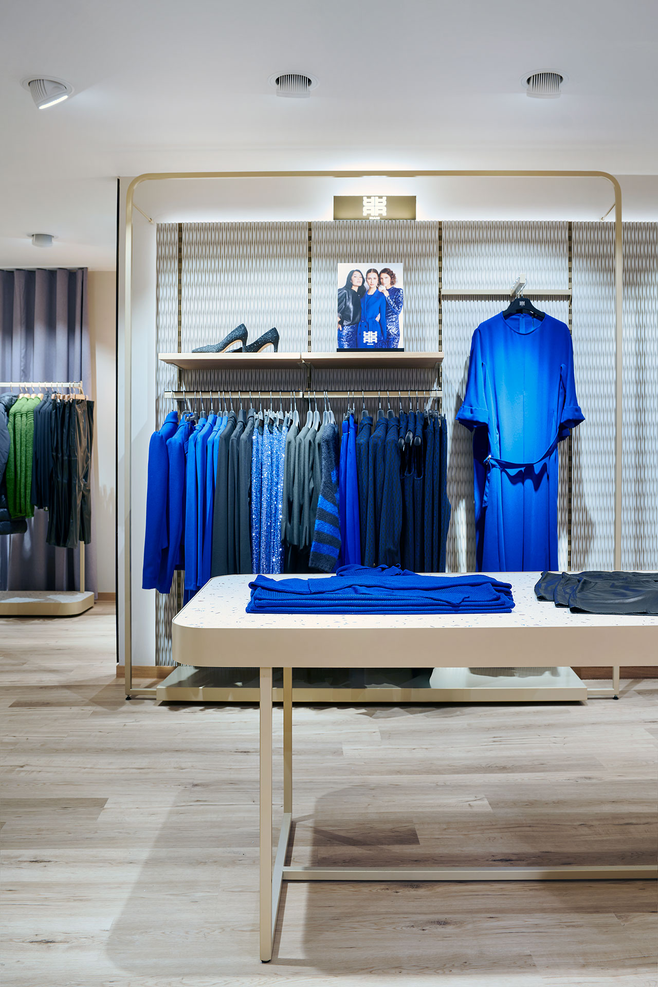 Im zweiten Obergeschoss wurde die Damen-Premium- und Jacken-Abteilung einem mondänen Upgrade unterzogen. Innovative Ladenbauelemente, die an der Wand verschoben werden können, ermöglichen eine flexible Strukturierung der Abteilungen. Der Premiumbereich wurde mit hochwertigen Materialien aufgewertet. Zudem wurde im gesamten Geschoss ein einheitliches Kabinenkonzept umgesetzt.