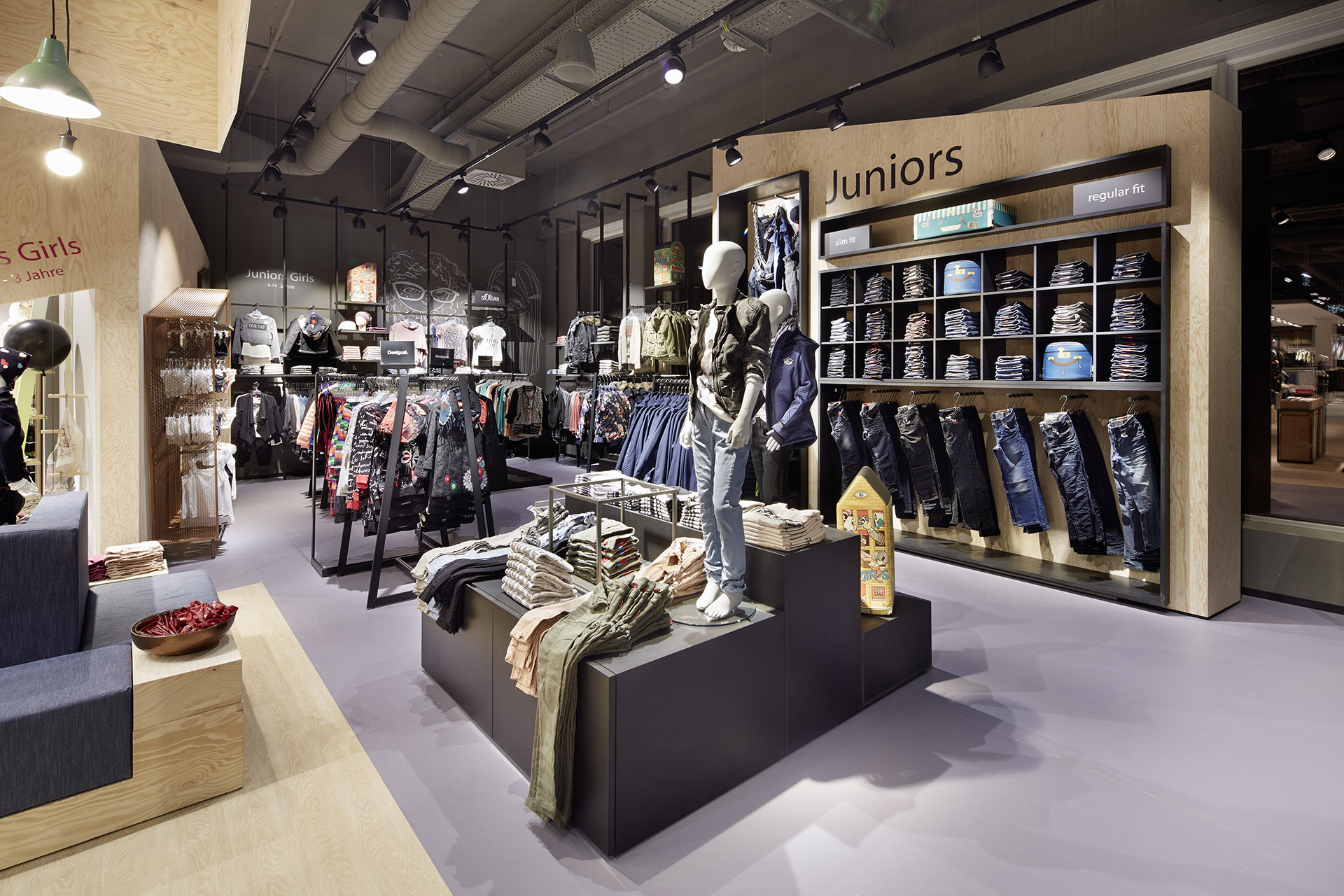 Die Kids-Welt im Erdgeschoss mit rund 150 Quadratmetern zeigt sich facettenreich. Von der Damenwelt räumlich getrennt, wird die Fläche rechts und links durch zwei Haus-in-Haus-Konstruktionen definiert. Während sich die Jungs in einer stilisierten Baumhauslandschaft austoben dürfen, entführt das Setting die Mädchen in ein Traumland – Wandskizzen von heimischer Flora und Fauna inklusive. Dazwischen eine Landschaft aus Präsentationskuben, die in den hinteren Teil der Nische führt, wo die etwas älteren unter den Kids ihre Lieblingsmarken finden – unter anderem an der eingestellten Jeanswand.