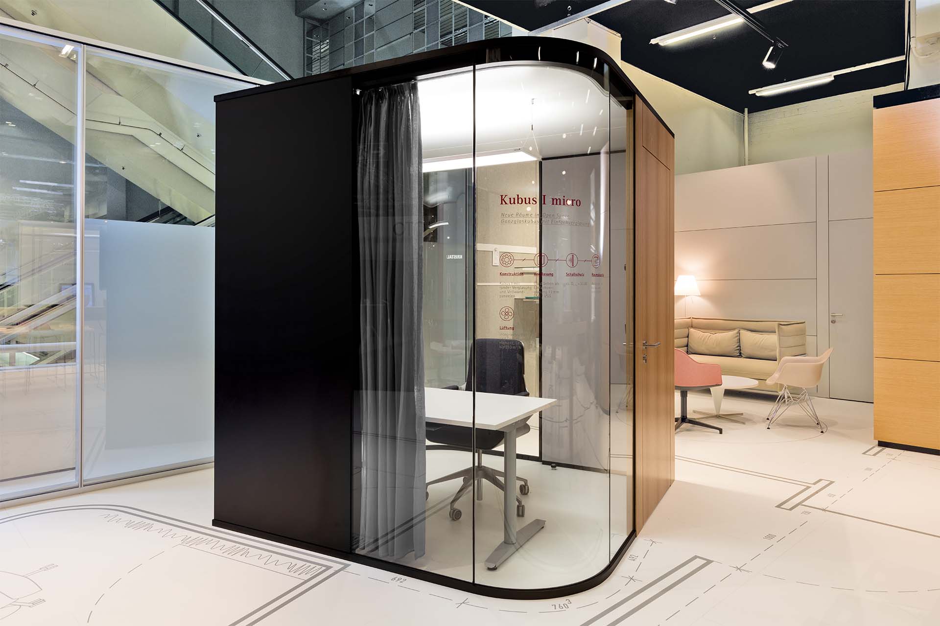 Moderne Open Space-Bürokonzepte erfordern räumliche Ausweichmöglichkeiten für Rückzug, Besprechungssituationen oder individuelles Arbeiten. Klimatisiert, schallgedämmt und flexibel konfigurierbar benötigt der von blocher partners für Strähle entwickelte Kubus I micro keinen Anschluss an Bauteile wie Fassade, Wand oder Decke. Frei im Raum positioniert oder aneinandergereiht ermöglicht das System eine effiziente Raumnutzung. Die hochwertige Ausstattung des Moduls – schwarz eingefärbte Wandelemente in Kombination mit Holz, eine optimale Lichtqualität durch Human Centric Lighting vor den gebogenen Glasscheiben – spiegelt den Anspruch an ein behagliches Ambiente wider.