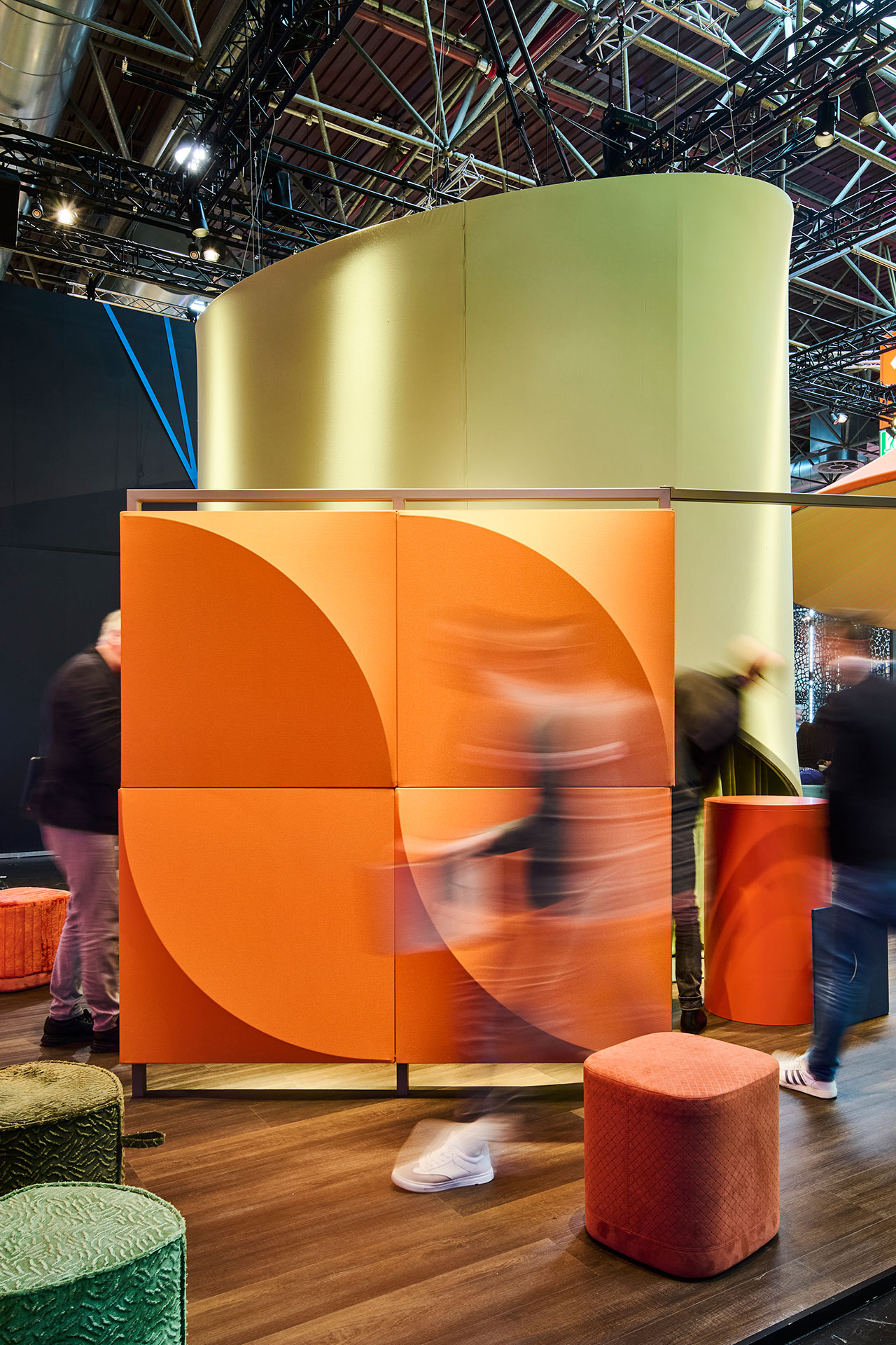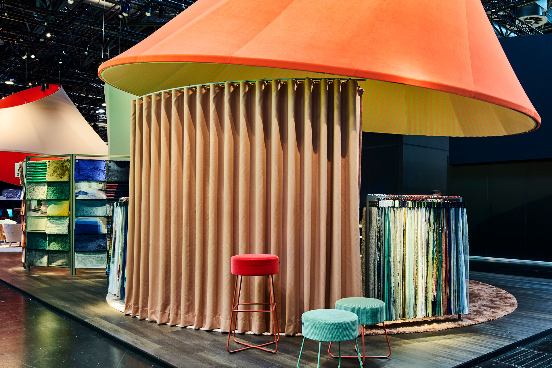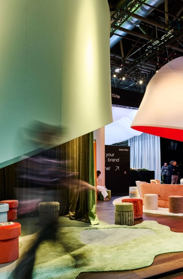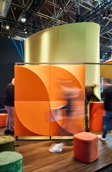 Drei dieser »Spotlights« bilden die zentralen Funktionszonen des Messestandes. Ein Bereich wurde als Lounge konzipiert und diente der Bewirtung sowie dem Socializing. Ein weiteres Spotlight markierte eine Beratungszone mit Hochtischen, die Gespräche sowie Produktinformationen ermöglicht. Der dritte Bereich wurde als Ausstellungsfläche gestaltet und eröffnete den Gästen beim Betreten eine sinnliche Raumerfahrung, in der Materialien, Farben und Texturen unmittelbar erlebbar werden.