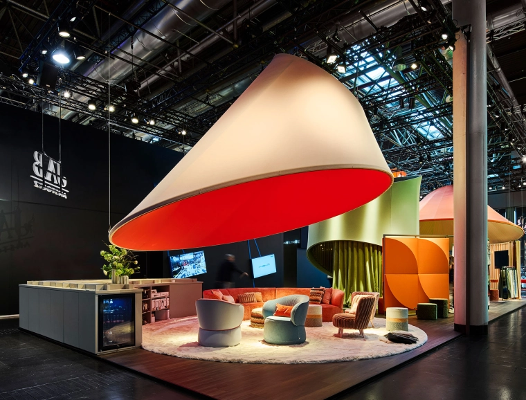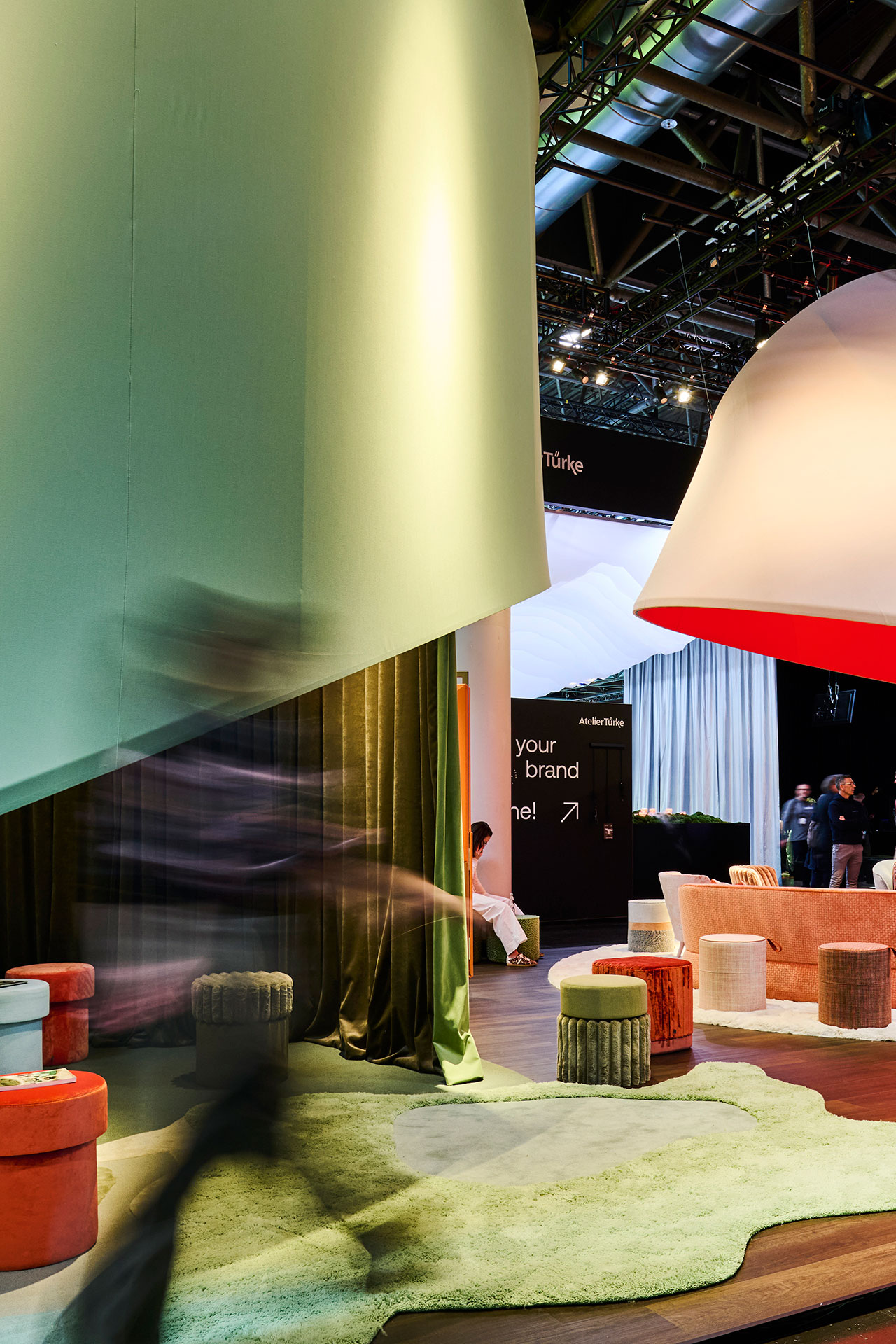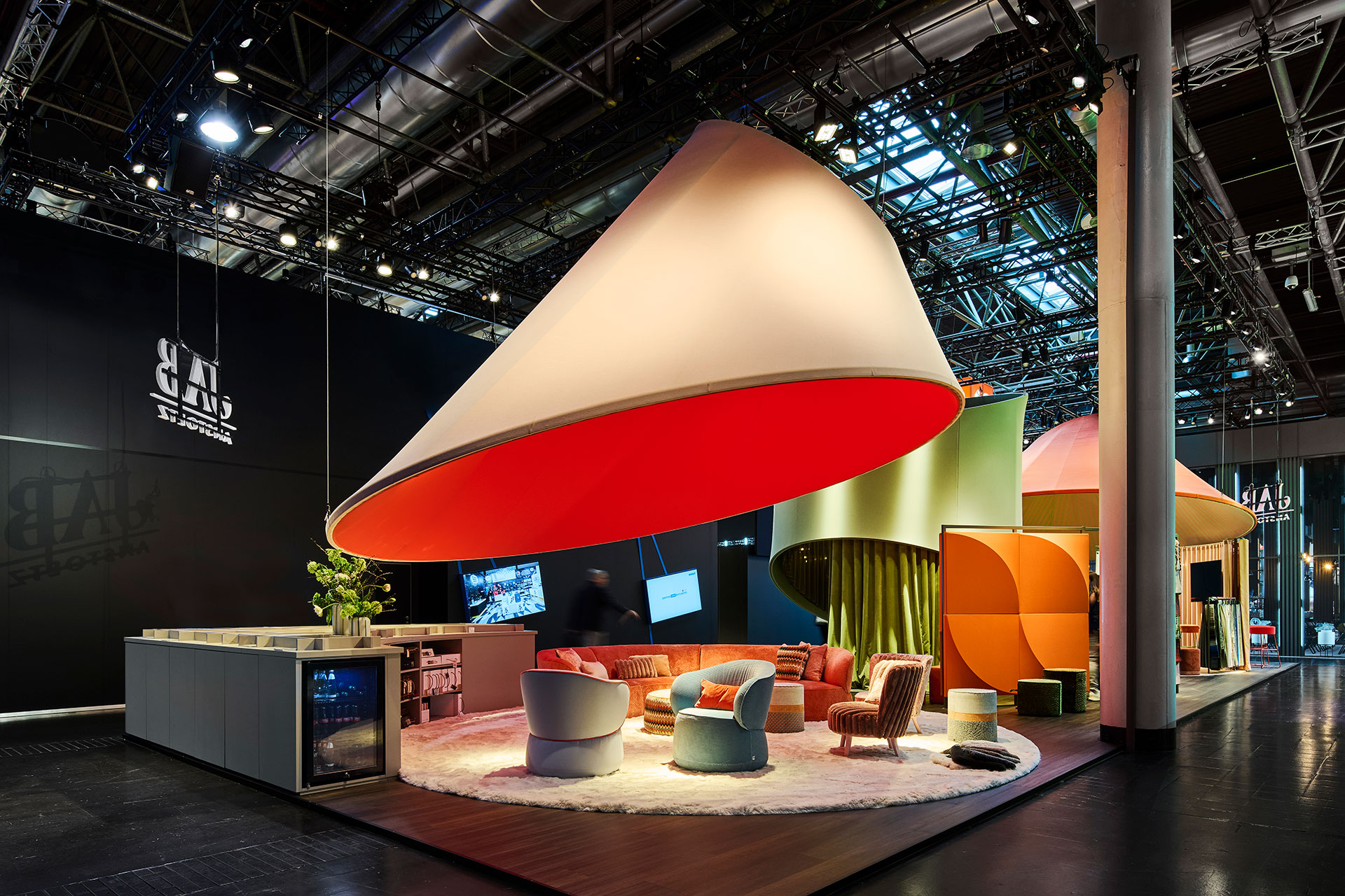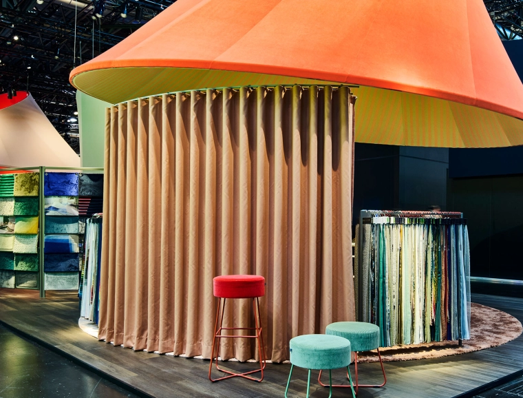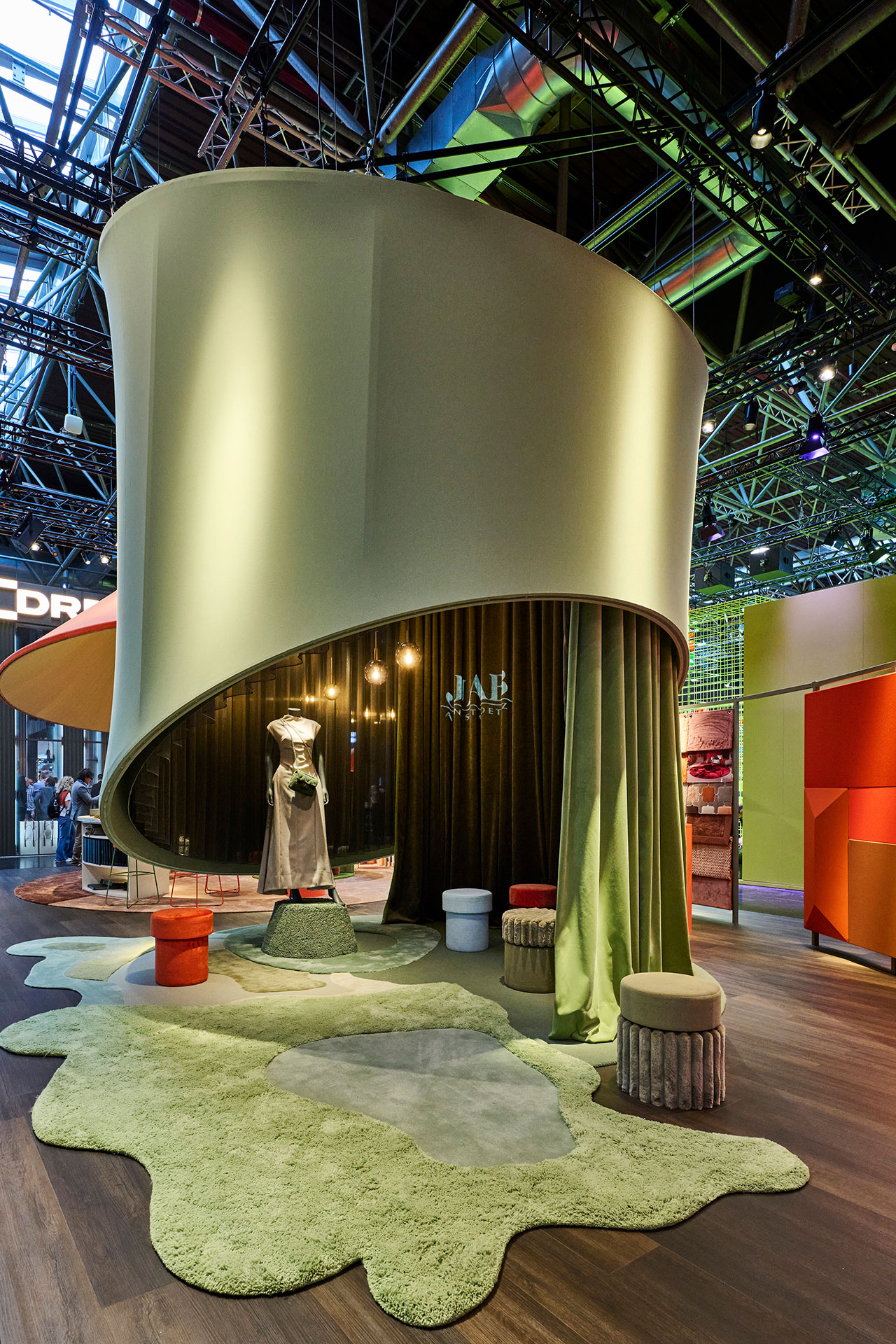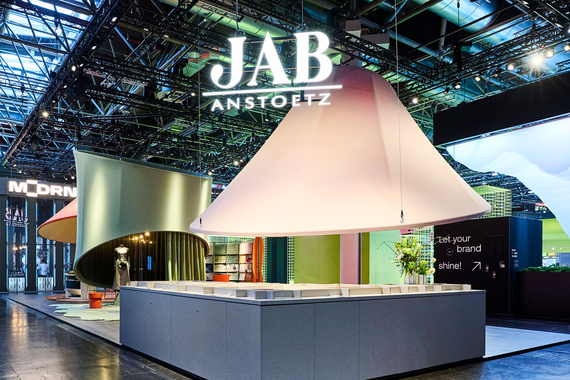 Textilgeprägte Elemente und eine durchdachte Zonierung schufen eine harmonische und doch dynamische Atmosphäre, die das kreative Potenzial von JAB ANSTOETZ widerspiegelte. Hängende, textile Kegel dienten als visuelle »Spotlights« und formten das visuelle Leitmotiv.