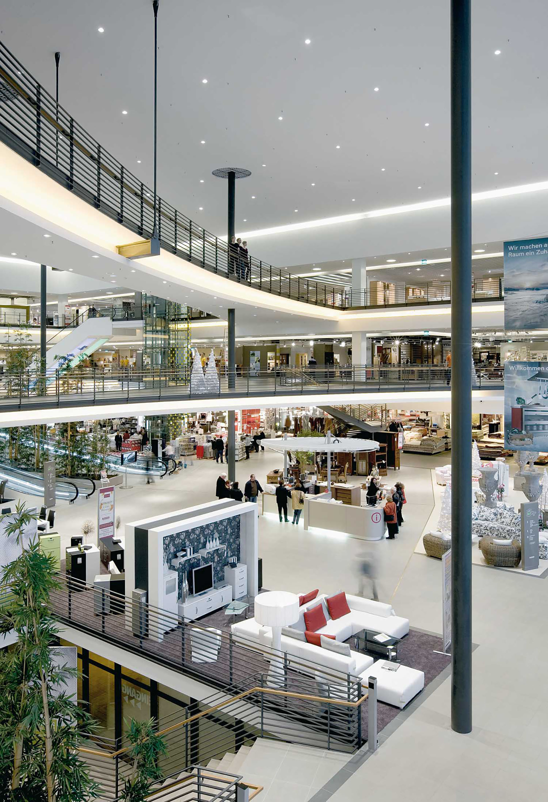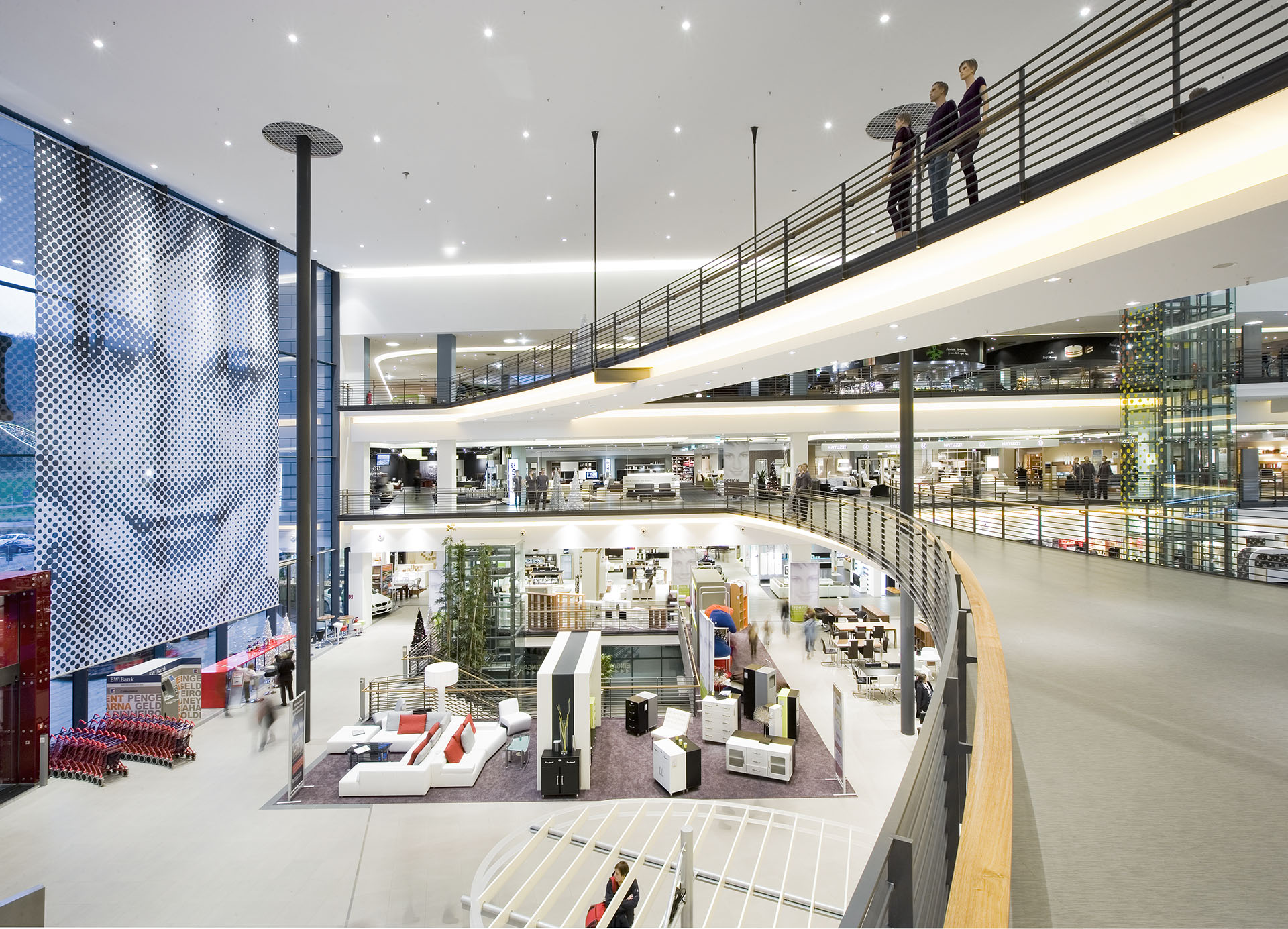 Der Besucher erlebt ein raumkompositorisches Gefüge aus Farben, Materialien, Lichteffekten und kunstvoll durch die Vertikale gespannte Wegenetze. Über drei Geschosse führen Treppen, Rollbänder und gläserne Aufzüge bis unter die lichte Dachkuppel. Organisch geschwungene Brückenbauwerke in luftiger Höhe erlauben ständige Positionswechsel und laden zum Entdecken ein. Statt Einbahnstraßen-Shopping können Kunden jederzeit in die Hauptrouten einfädeln oder wieder vom Weg abschweifen und eintauchen in die verschiedenen Wohn- und Geschmacksrichtungen. Der Name Arena ist dabei nicht nur den beiden dynamisch geformten Gebäudekörpern geschuldet, er ist durch und durch Programm: Möbel und Accessoires werden spektakulär inszeniert und dem Kunden als kreative Einrichtungsideen höchst lebendig vor Augen geführt.
