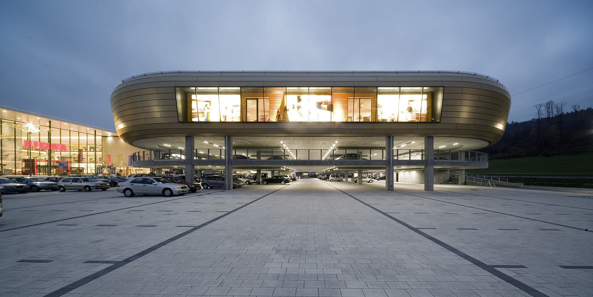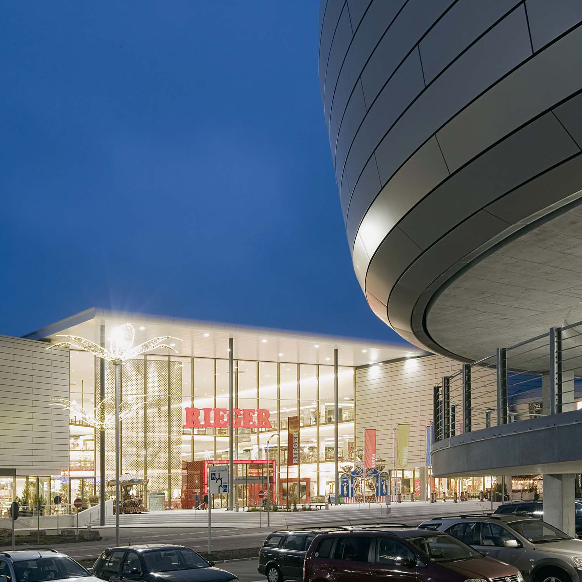 Das Unternehmen Rieger, das in Baden-Württemberg und Thüringen bereits fünf Einrichtungszentren, drei Küchenfachmärkte und zwei Küchenstudios betreibt, geht mit der Möbelarena neue Wege. Im Vordergrund stehen hier ein sorgfältig ausgewähltes Sortiment und geschmackvoll differenzierte Wohnwelten nach dem Shop-in-Shop-Prinzip. Die Außenhaut gliedert den Neubau in zwei Bereiche: Großzügige Schaufensterflächen im Erdgeschoss laden die Kunden ein, das Innere zu erkunden – die Architekten verknüpfen Innen und Außen miteinander. Die darüber liegenden Geschosse verbergen sich hinter einer geschlossenen Fassade aus Aluminiumtafeln. Auf einer Fläche von rund 36.000 Quadratmetern präsentiert Rieger die ganze Bandbreite des zeitgemäßen Wohnens: das Möbelkaufhaus und der großzügige Küchenfachmarkt sind über einen Verbindungsbau miteinander verbunden.