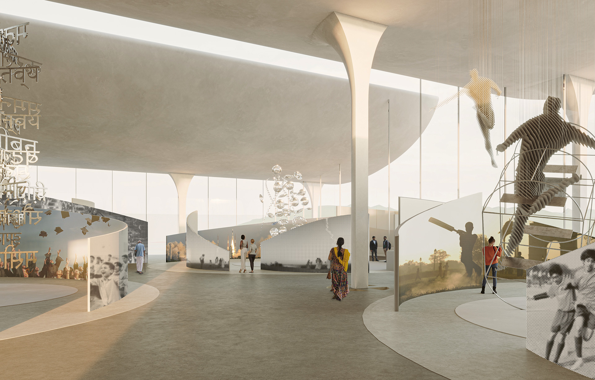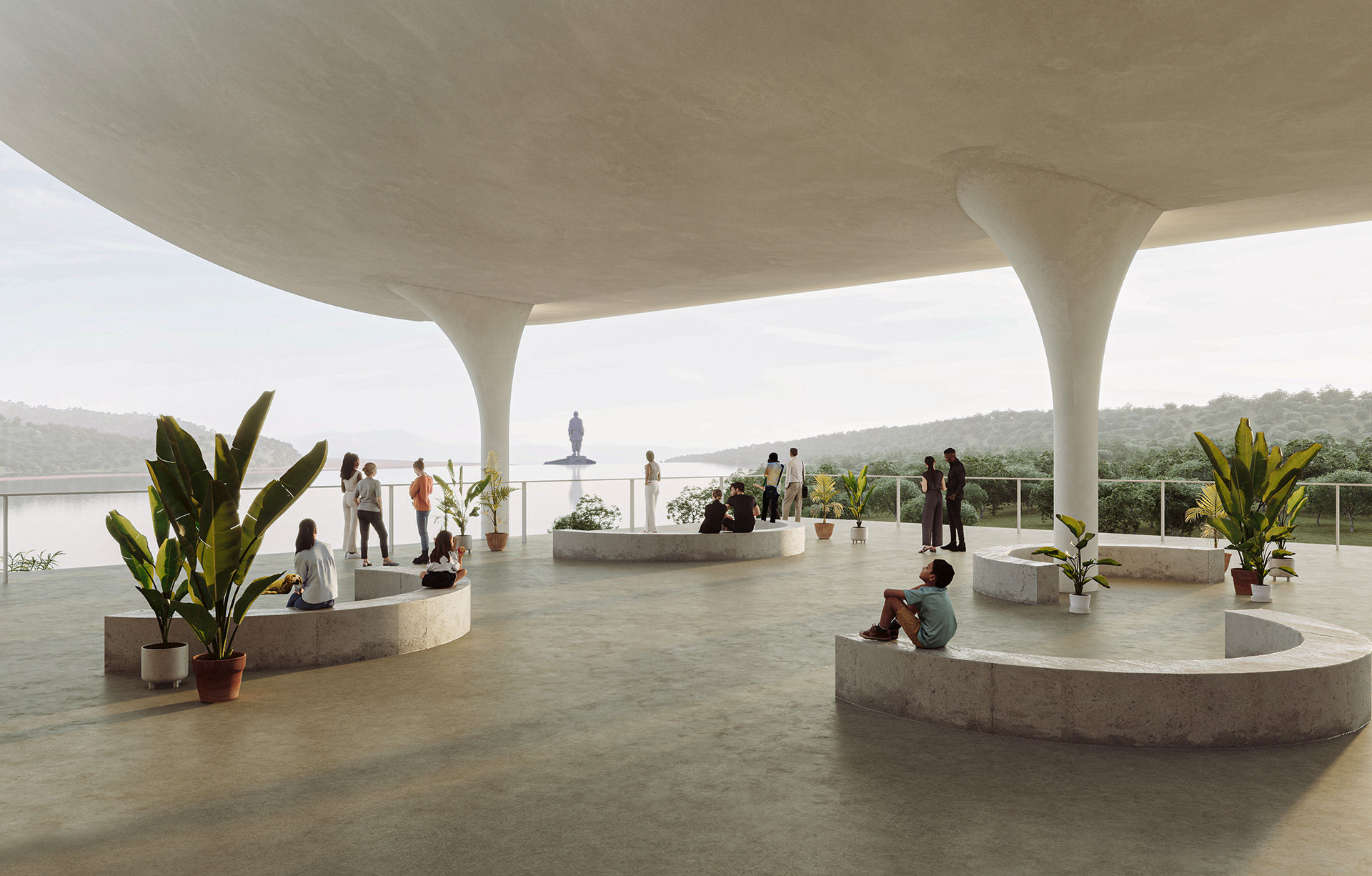 Aufgrund seiner markanten Form ist das Museum of Royal Kingdoms – eine Komposition aus Stampflehm und Ziegel – schon von Weitem sichtbar. Verbunden durch eine Besucherplattform entfaltet sich gegenüber das Gujarat Vandana Museum mit einem expressiven Dach aus großen Betonschalen. Beide Entwürfe integrieren nachhaltige Lösungen wie Solarenergie und Grundwasserkühlung.