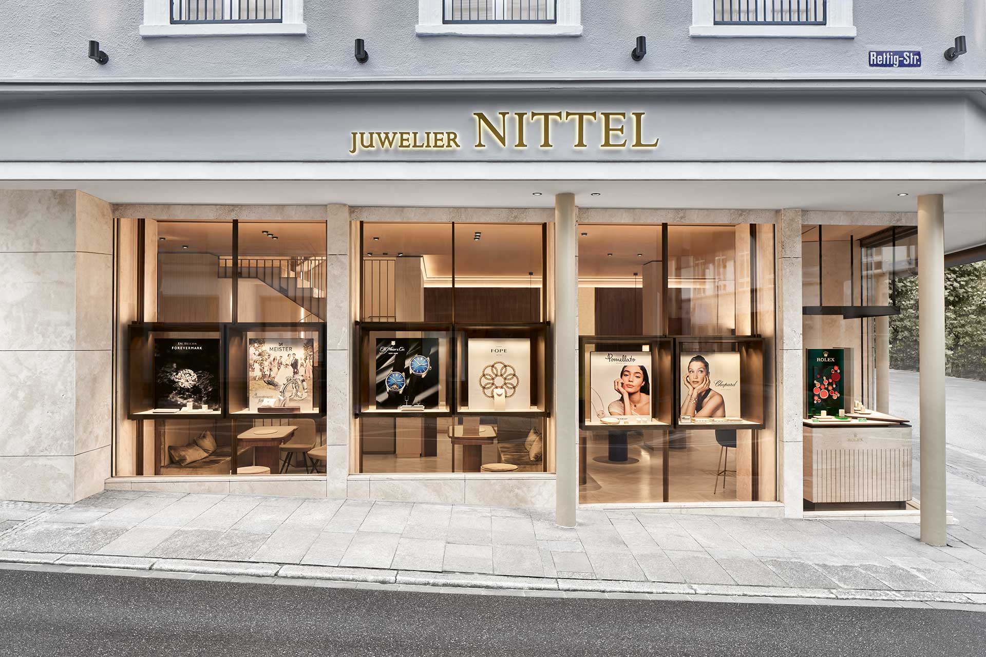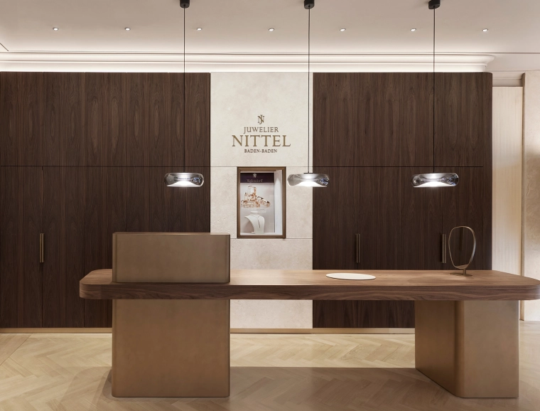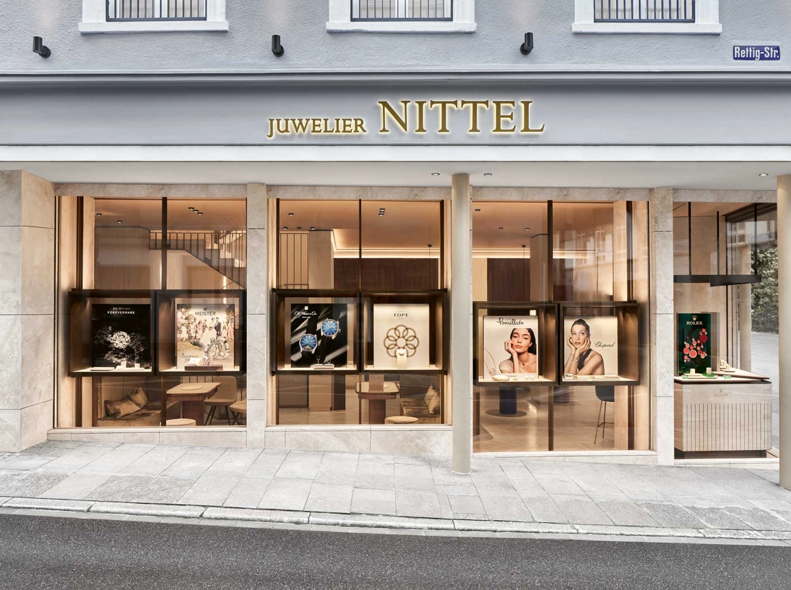Nittel ist seit über 80 Jahren eine feste Größe in Freiburg. Nun expandierte der Juwelier nach Baden-Baden, wo er ein passendes Ladenlokal in einem denkmalgeschützten Haus in der Altstadt fand. Die Fassade des Gebäudes präsentiert sich nach dem Umbau in einem stilvollen Taubenblau, umgesetzt von den Architekten in enger Abstimmung mit dem Denkmalamt: Die Stuckelemente wurden erneuert, die Fenster im ersten Obergeschoss wurden durch solche mit klassischen Fensterkreuzen ersetzt.