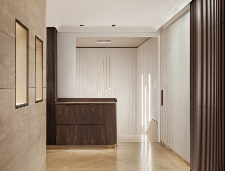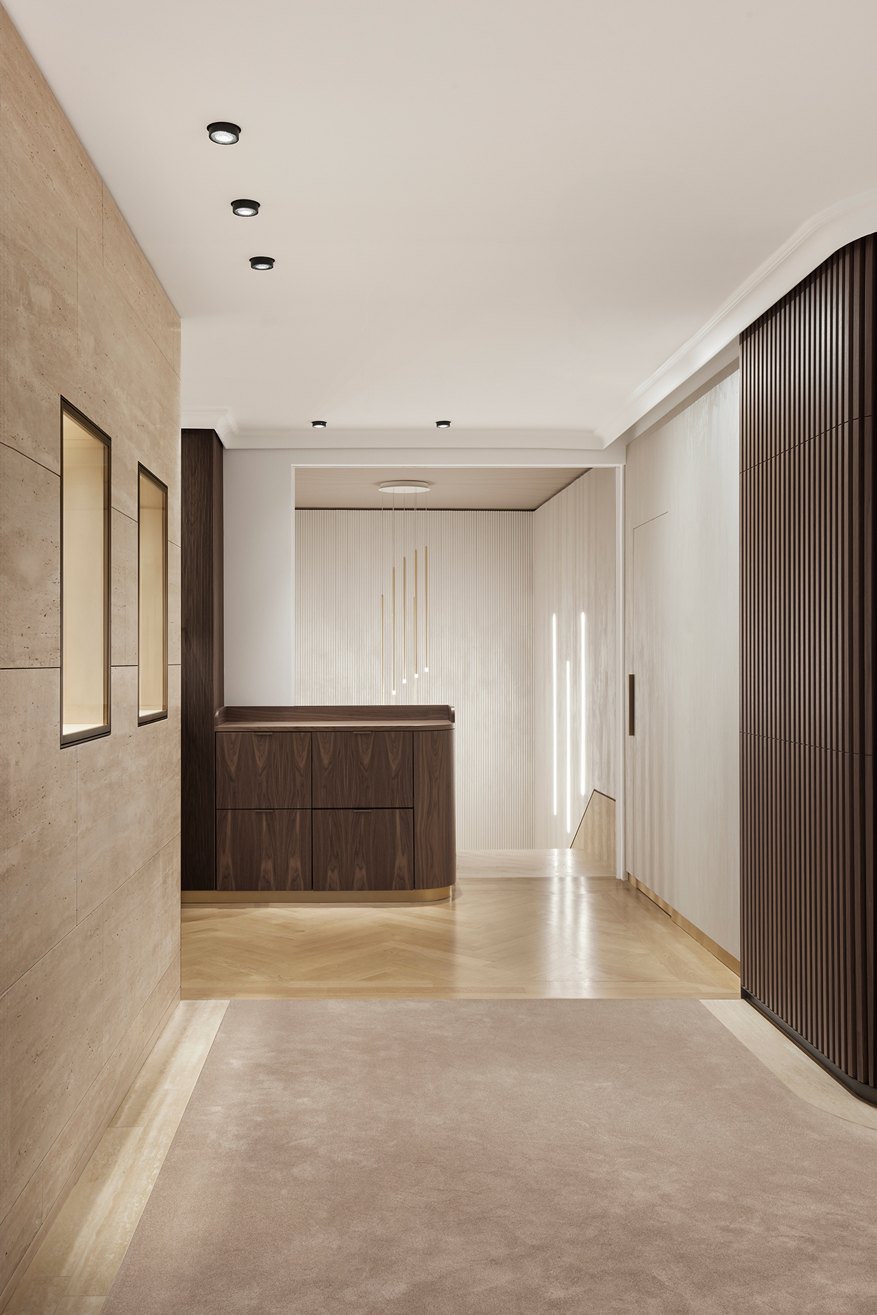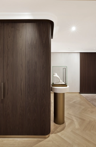 Auch im Inneren des Geschäfts haben die Planer die vorhandene Architektur aufgegriffen und erneuert. Die bestehende Treppe blieb als solche unverändert, jedoch mit einem neuen Bodenbelag aus Travertin versehen. Eine raffinierte Wandverkleidung aus dunklem Nussbaumholz in Kombination mit cremefarbenem Stuck unterstreicht den hohen Anspruch des Juweliers. Dabei fügt sich die Treppenverkleidung aus Stuck mit Wellenstruktur harmonisch ein.