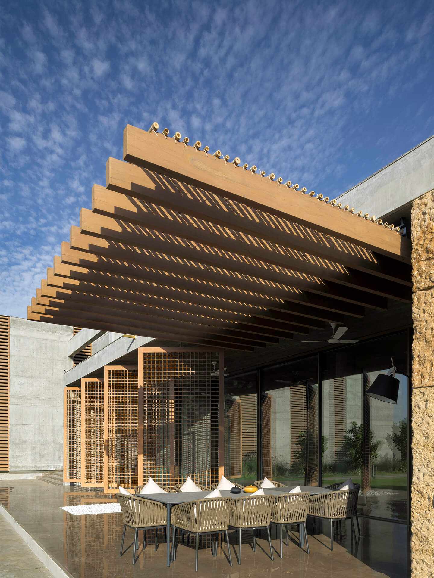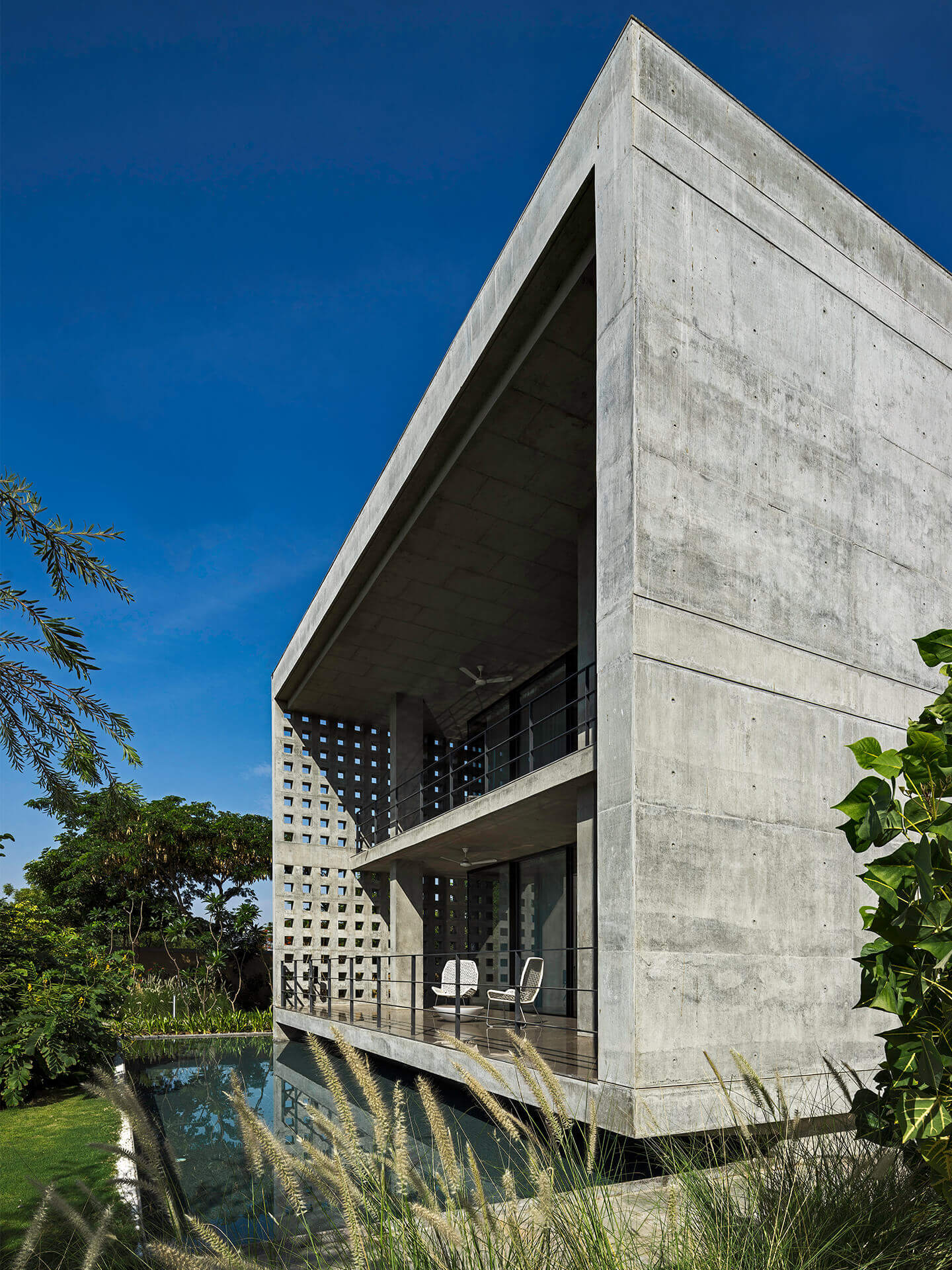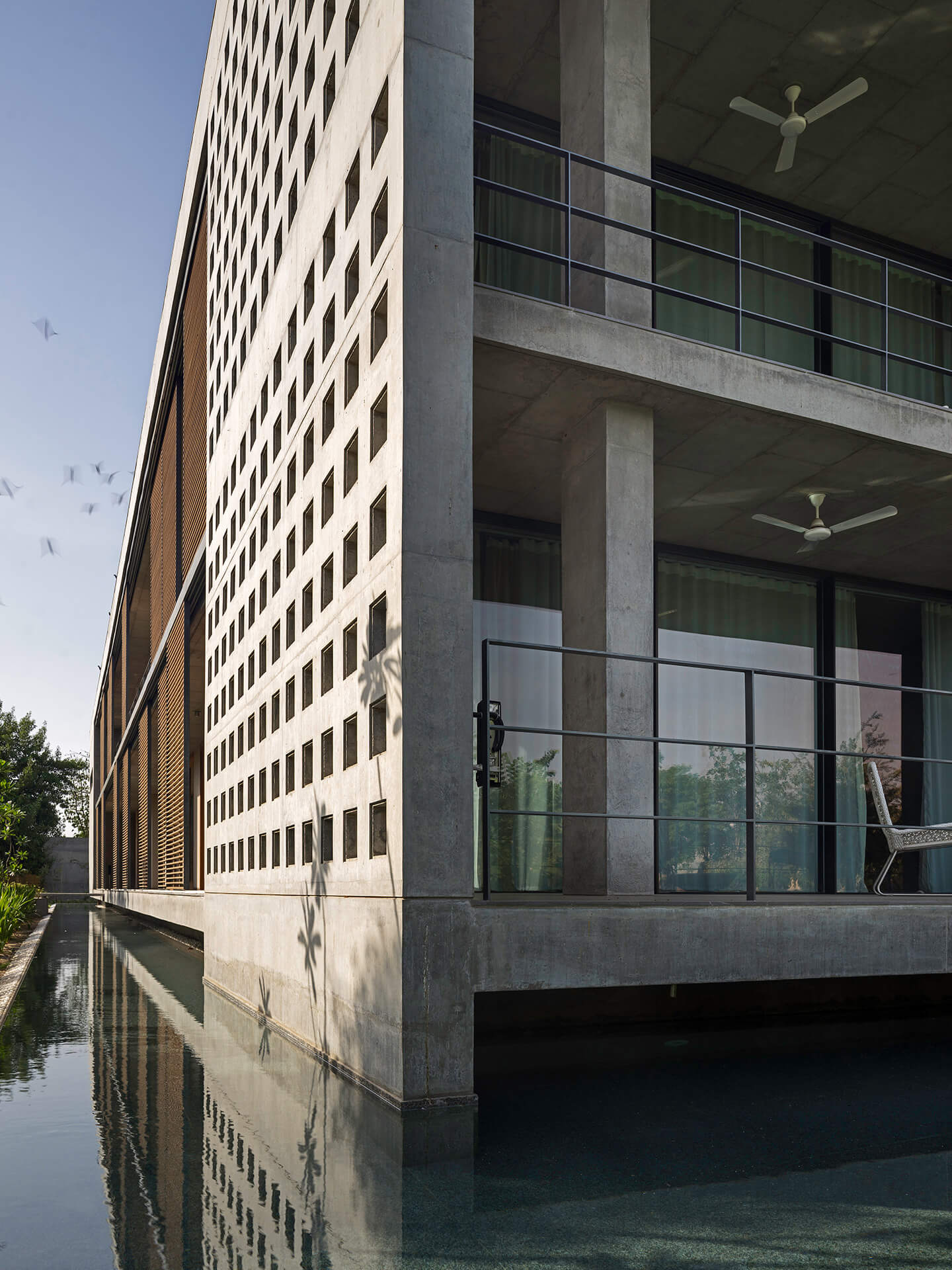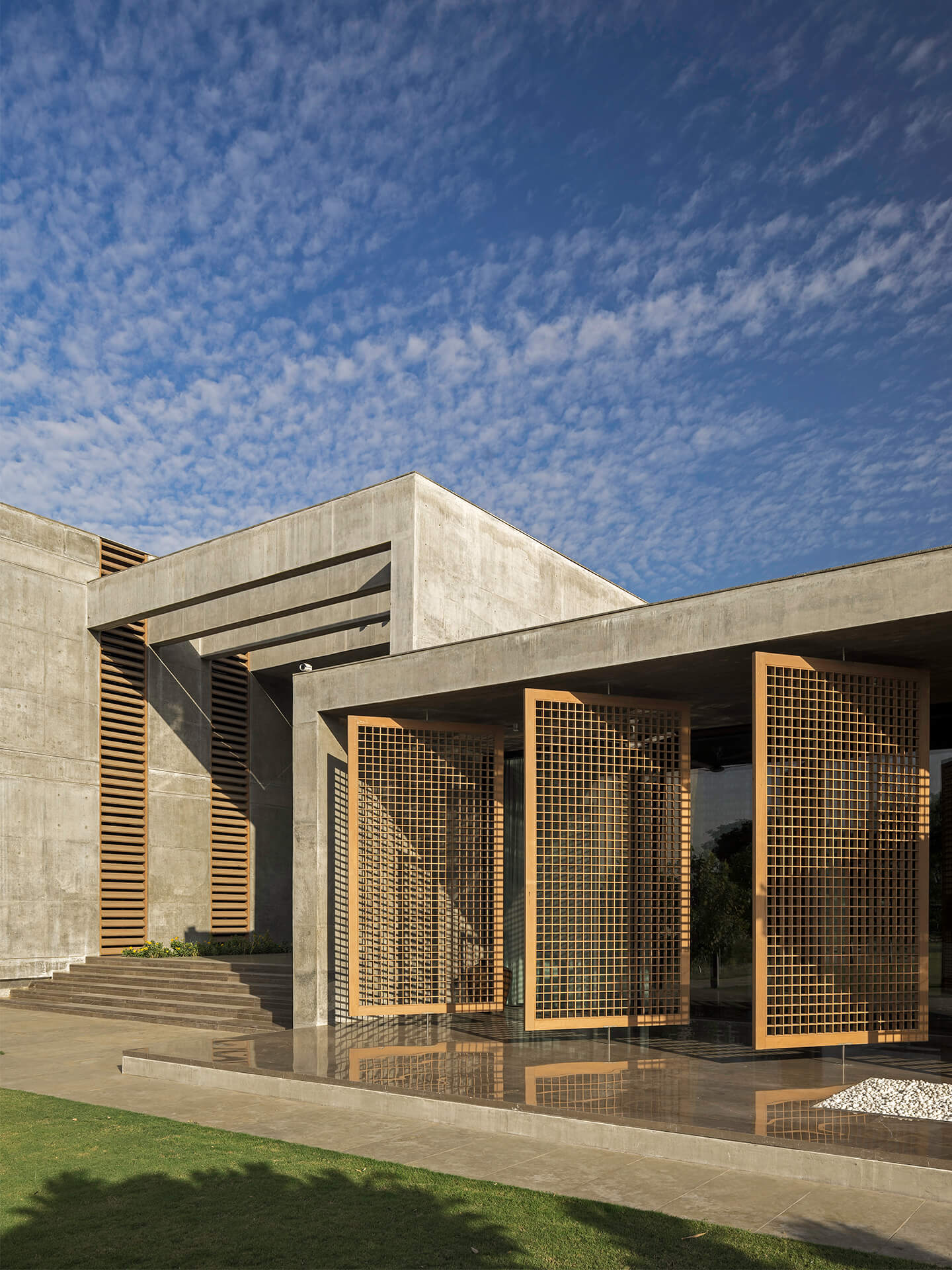 Als eines der ersten Gebäude in Ahmedabad umgibt die Villa eine mehrschalige Fassade, die die Wandflächen und Räume durch die hohe Isolationswirkung auch bei starker Sonneneinstrahlung angenehm temperiert. Im Innern kommen zudem zwei innovative Stage Cooler zum Einsatz, die in Lobby und Flurbereichen in den trockenen, heißen Phasen ebenfalls für Energieeinsparungen sorgen. Nach Osten orientiert sich eine fast 20 Meter lange Front aus Sichtbeton, in die Teakholzbänder eingelassen sind, durch die die Villa atmet. Auf der Westseite entlang der privaten Räume umgeben das Erd- und Obergeschoss durchgängige Veranden, die hinter einem Lamellenvorhang aus Teakholz vor der direkten Sonne geschützt sind. Die großzügigen, mit öffenbaren Schiebetüren aus Glas versehenen Patios und Terrassen schaffen den eleganten Übergang zwischen Innen mit Außen und strahlen dabei Transparenz und Offenheit aus. Die je nach Bedürfnis verschiebbaren Jalousien aus Holzlamellen verleihen dem Haus nicht nur Rhythmus und Struktur sondern zaubern zugleich ein fantastisches Schattenspiel an Wänden und Böden. Teil der ausgefeilten Klimatechnik ist zudem ein Wasserbecken, das das gesamte Haus umläuft und eine spürbar kühlende Wirkung hat.