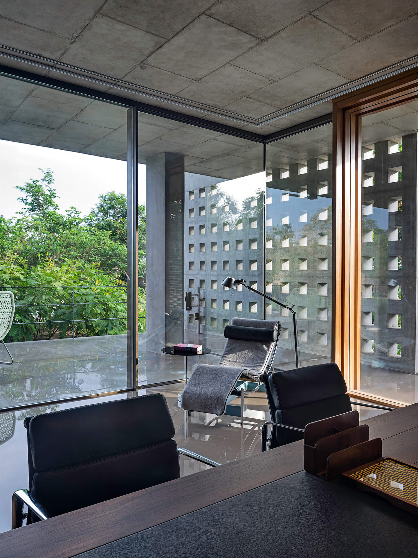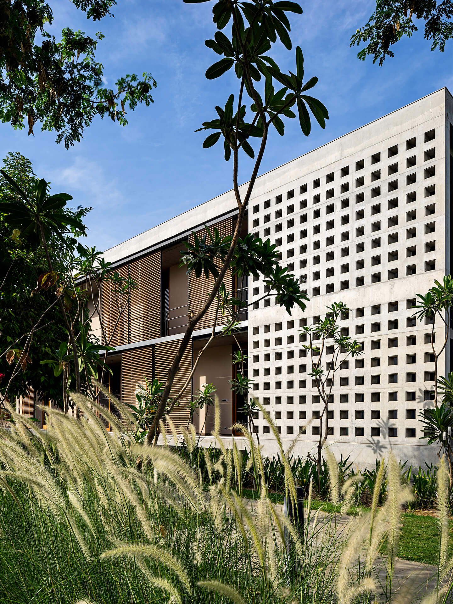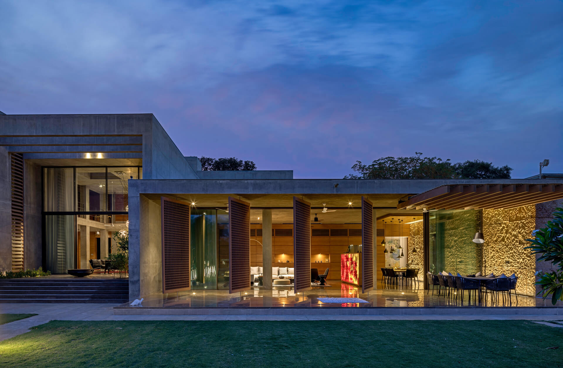 Als eines der ersten Gebäude in Ahmedabad umgibt die Villa eine mehrschalige Fassade, die die Wandflächen und Räume durch die hohe Isolationswirkung auch bei starker Sonneneinstrahlung angenehm temperiert. Im Innern kommen zudem zwei innovative Stage Cooler zum Einsatz, die in Lobby und Flurbereichen in den trockenen, heißen Phasen ebenfalls für Energieeinsparungen sorgen. Nach Osten orientiert sich eine fast 20 Meter lange Front aus Sichtbeton, in die Teakholzbänder eingelassen sind, durch die die Villa atmet. Auf der Westseite entlang der privaten Räume umgeben das Erd- und Obergeschoss durchgängige Veranden, die hinter einem Lamellenvorhang aus Teakholz vor der direkten Sonne geschützt sind. Die großzügigen, mit öffenbaren Schiebetüren aus Glas versehenen Patios und Terrassen schaffen den eleganten Übergang zwischen Innen mit Außen und strahlen dabei Transparenz und Offenheit aus. Die je nach Bedürfnis verschiebbaren Jalousien aus Holzlamellen verleihen dem Haus nicht nur Rhythmus und Struktur sondern zaubern zugleich ein fantastisches Schattenspiel an Wänden und Böden. Teil der ausgefeilten Klimatechnik ist zudem ein Wasserbecken, das das gesamte Haus umläuft und eine spürbar kühlende Wirkung hat.