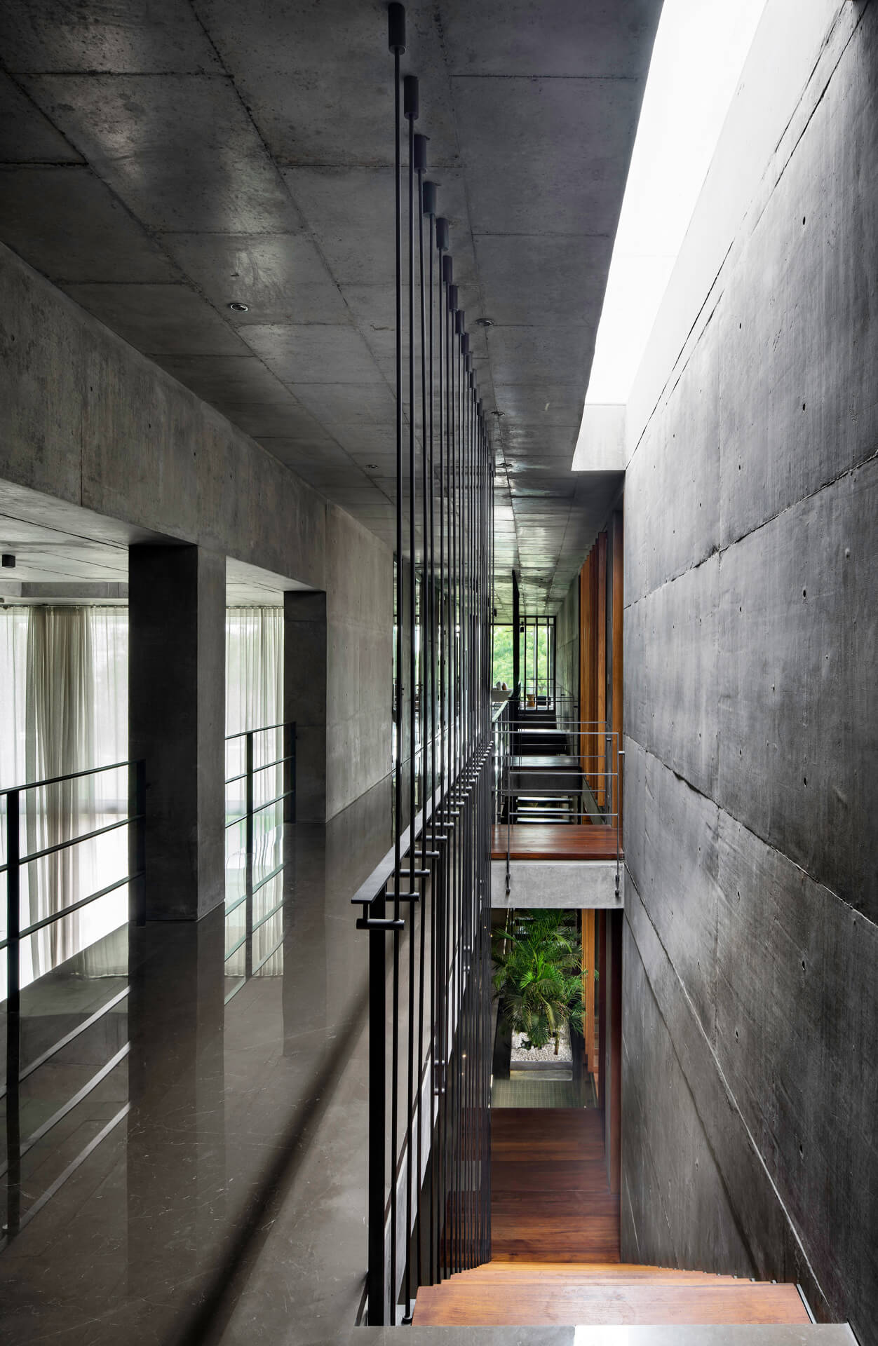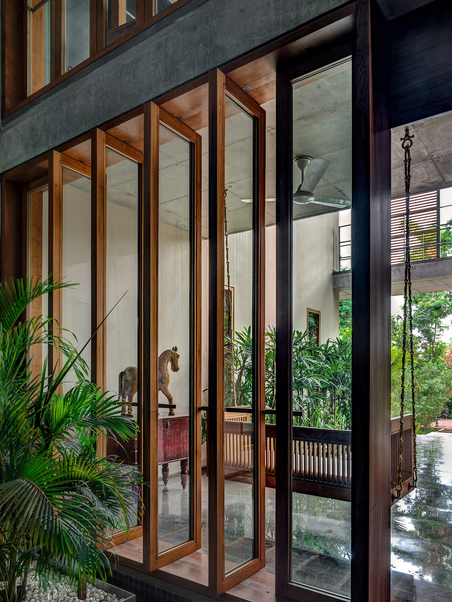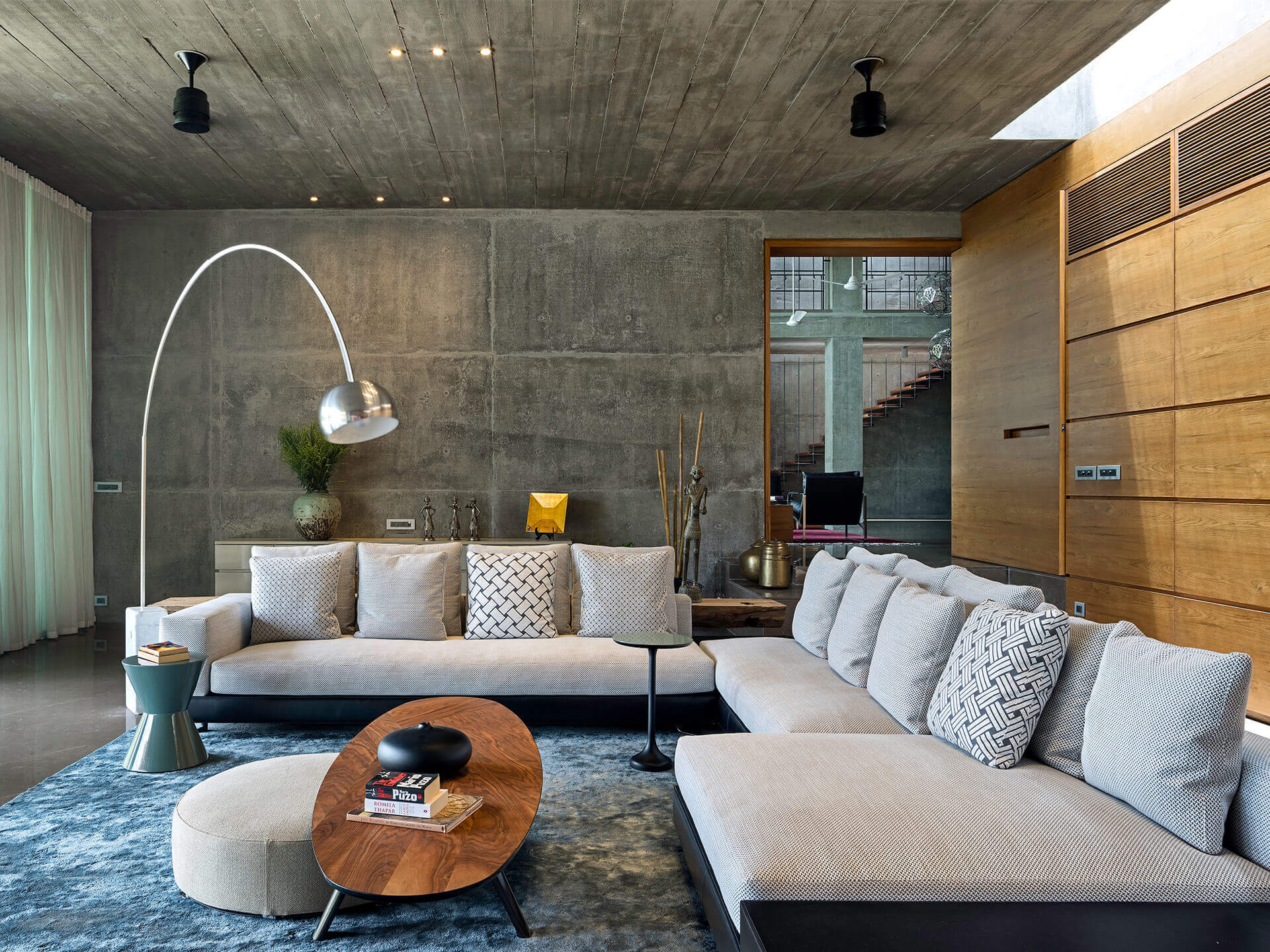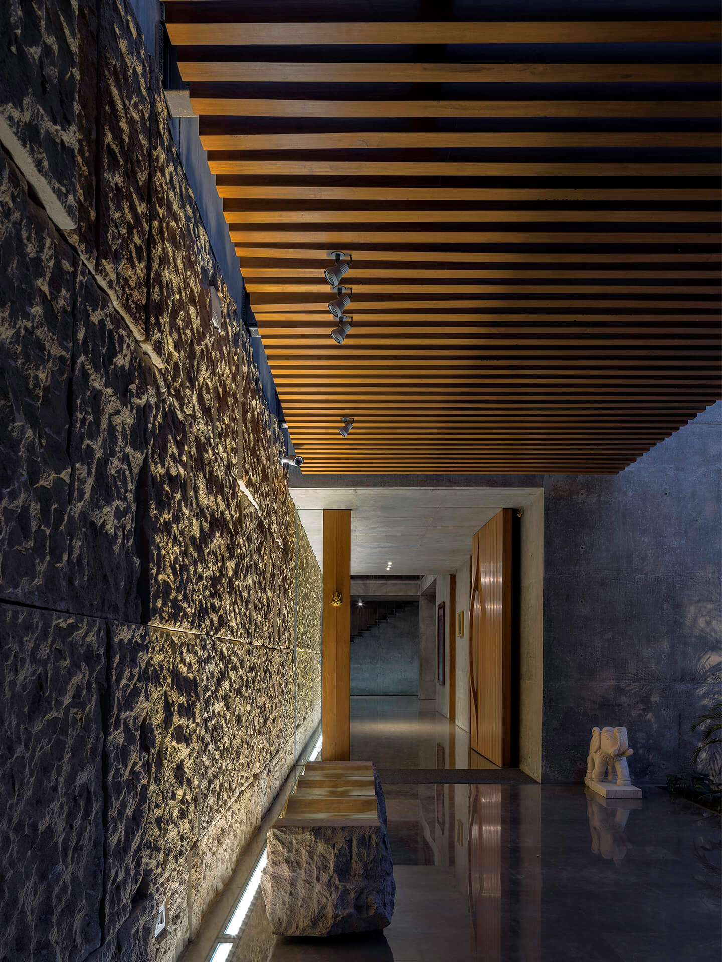 Als eines der ersten Gebäude in Ahmedabad umgibt die Villa eine mehrschalige Fassade, die die Wandflächen und Räume durch die hohe Isolationswirkung auch bei starker Sonneneinstrahlung angenehm temperiert. Im Innern kommen zudem zwei innovative Stage Cooler zum Einsatz, die in Lobby und Flurbereichen in den trockenen, heißen Phasen ebenfalls für Energieeinsparungen sorgen. Nach Osten orientiert sich eine fast 20 Meter lange Front aus Sichtbeton, in die Teakholzbänder eingelassen sind, durch die die Villa atmet. Auf der Westseite entlang der privaten Räume umgeben das Erd- und Obergeschoss durchgängige Veranden, die hinter einem Lamellenvorhang aus Teakholz vor der direkten Sonne geschützt sind. Die großzügigen, mit öffenbaren Schiebetüren aus Glas versehenen Patios und Terrassen schaffen den eleganten Übergang zwischen Innen mit Außen und strahlen dabei Transparenz und Offenheit aus. Die je nach Bedürfnis verschiebbaren Jalousien aus Holzlamellen verleihen dem Haus nicht nur Rhythmus und Struktur sondern zaubern zugleich ein fantastisches Schattenspiel an Wänden und Böden. Teil der ausgefeilten Klimatechnik ist zudem ein Wasserbecken, das das gesamte Haus umläuft und eine spürbar kühlende Wirkung hat.