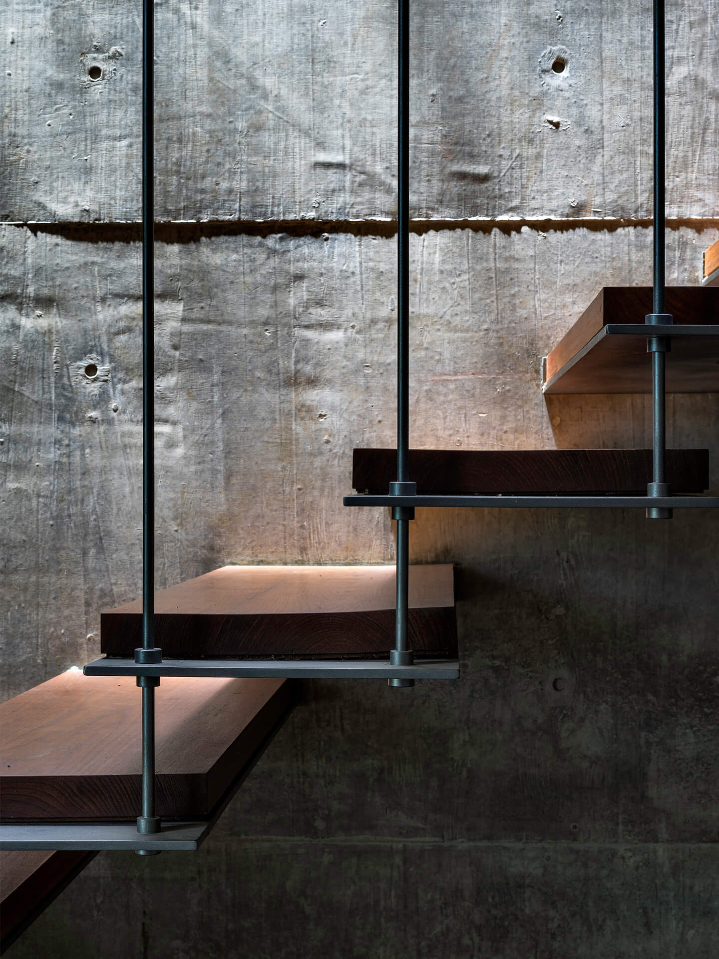 Eine fließende Einheit aus Innen und Außen ergibt sich auch aus der Fortsetzung der Strukturen, Farben und Materialien in den Innenräumen. Hier trifft maximaler Wohnkomfort auf höchste Eleganz. Das Spiel aus Sichtbeton, Teakholz, italienischem Marmor, viel Licht, Transparenz und Geometrie gibt den Räumen moderne Klarheit, wohnliche Wärme und ein behagliches Flair. Sanftes Plätschern begrüßt den Besucher, wenn er sich der Eingangstür nähert.
