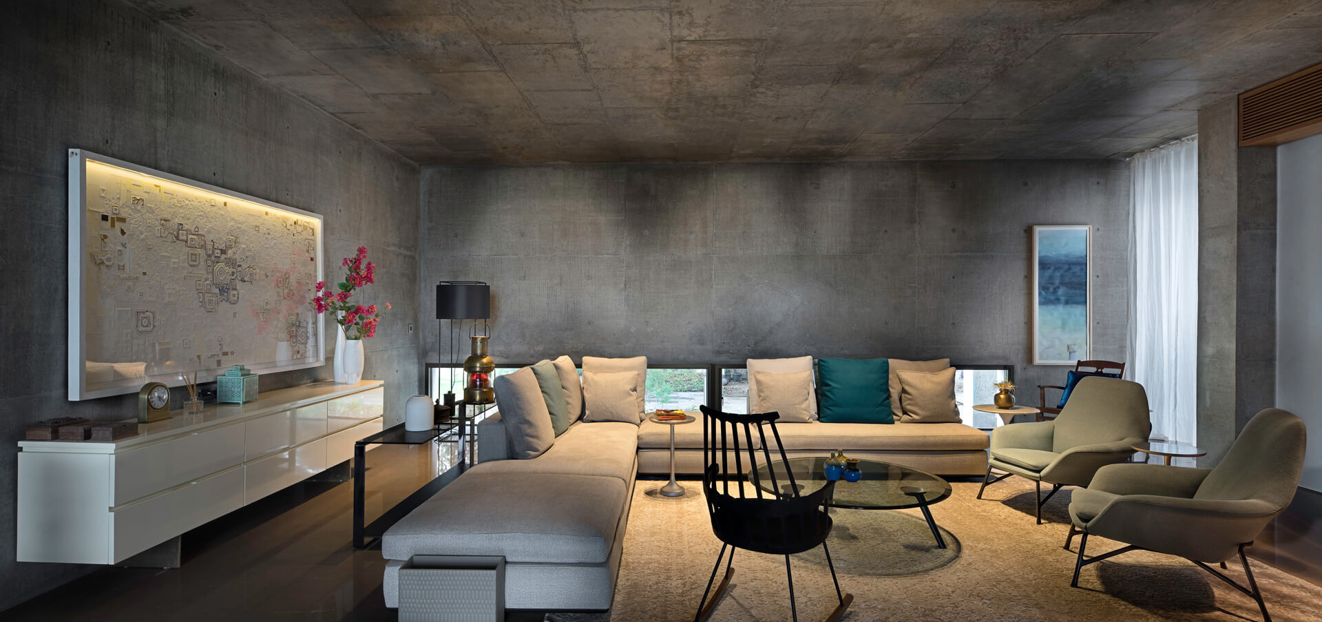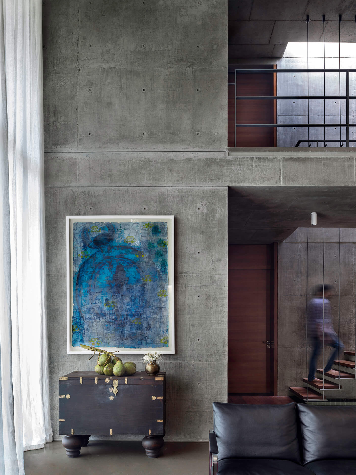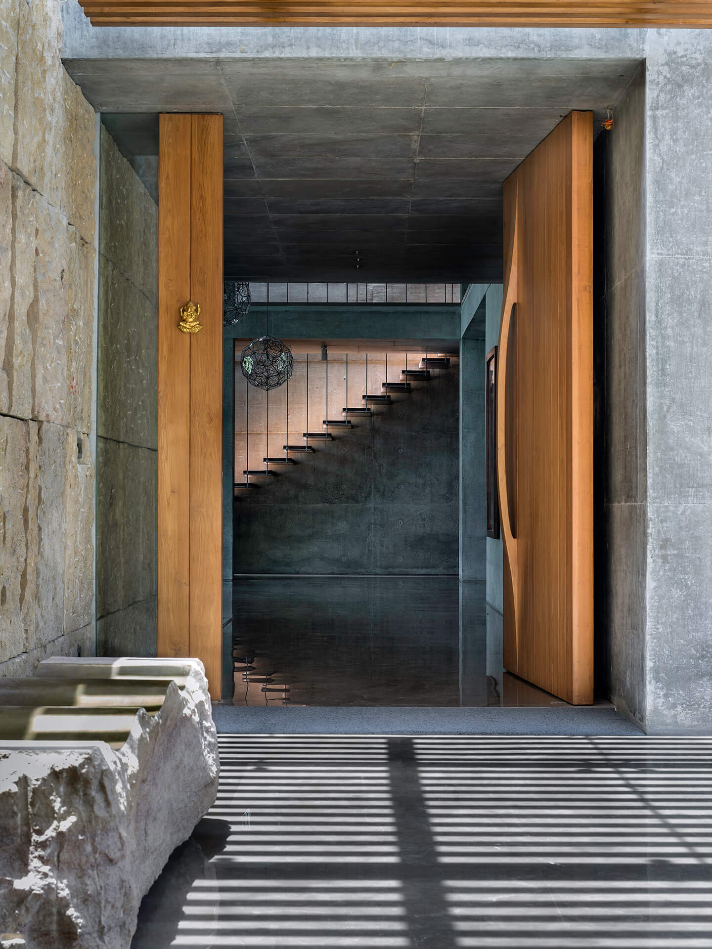 Feine Details in Form von ausgesuchten Designobjekten, ausdrucksstarken, edlen Antiquitäten und extravaganter Kunst setzen stilvolle Akzente in der Residenz. Neben der Architektur und Innenarchitektur sind blocher partners für die Auswahl der Kunstwerke verantwortlich. Bei den Bildern und Reliefs handelt es sich um Werke junger zeitgenössischer indischer Künstler aus dem persönlichen Umfeld der Architekten. An den klaren Sichtbetonwänden kommen die außergewöhnlichen Arbeiten besonders gut zur Geltung. Sie verleihen den Räumen lebendige Wohnlichkeit. Verbindende künstlerische Elemente sind die kontemporären Ausdrucksformen und aktuellen Themen, die zugleich in der indischen Kultur und Tradition verortet sind. Zum gemütlichen Ambiente trägt außerdem das Lichtkonzept bei wenn etwa Uplights die Oberflächen des handgeschlagenen Sandsteins betonen, dessen Goldton sich im kühlen Marmorboden bricht. Von außen entsteht der Eindruck eines nicht nur atmosphärisch leuchtenden Hauses sondern eines offenen Wohnkörpers, der von innen heraus glänzt.
