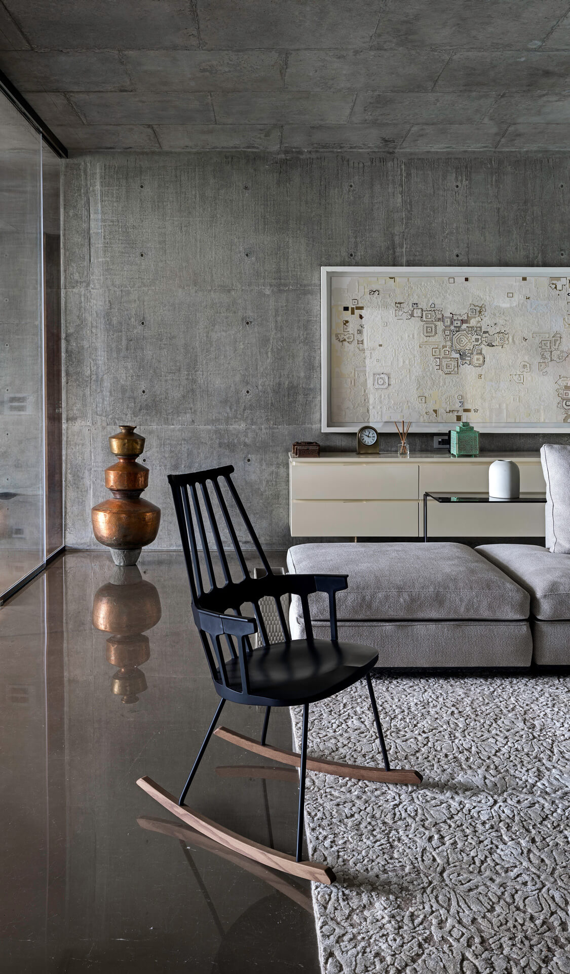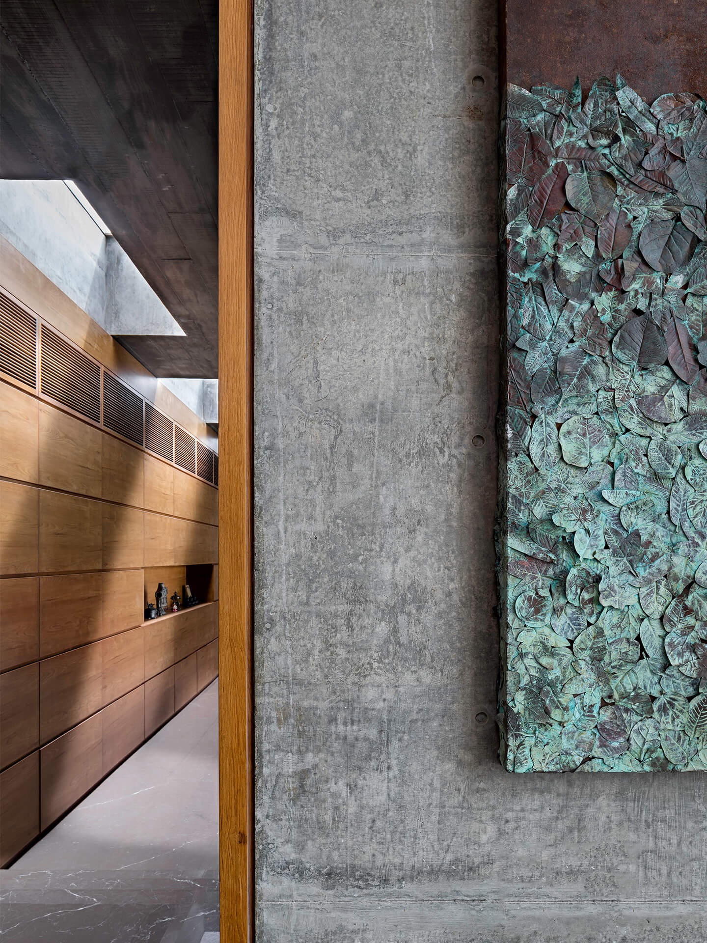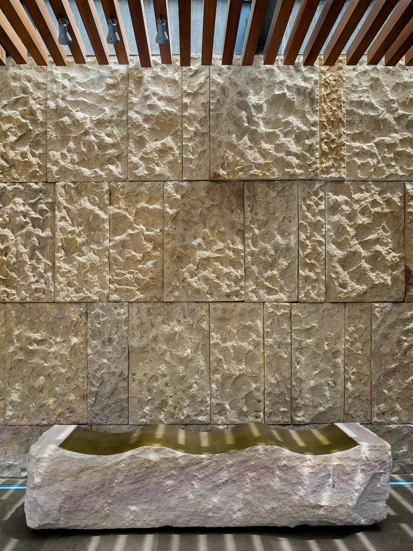 Feine Details in Form von ausgesuchten Designobjekten, ausdrucksstarken, edlen Antiquitäten und extravaganter Kunst setzen stilvolle Akzente in der Residenz. Neben der Architektur und Innenarchitektur sind blocher partners für die Auswahl der Kunstwerke verantwortlich. Bei den Bildern und Reliefs handelt es sich um Werke junger zeitgenössischer indischer Künstler aus dem persönlichen Umfeld der Architekten. An den klaren Sichtbetonwänden kommen die außergewöhnlichen Arbeiten besonders gut zur Geltung. Sie verleihen den Räumen lebendige Wohnlichkeit. Verbindende künstlerische Elemente sind die kontemporären Ausdrucksformen und aktuellen Themen, die zugleich in der indischen Kultur und Tradition verortet sind. Zum gemütlichen Ambiente trägt außerdem das Lichtkonzept bei wenn etwa Uplights die Oberflächen des handgeschlagenen Sandsteins betonen, dessen Goldton sich im kühlen Marmorboden bricht. Von außen entsteht der Eindruck eines nicht nur atmosphärisch leuchtenden Hauses sondern eines offenen Wohnkörpers, der von innen heraus glänzt.