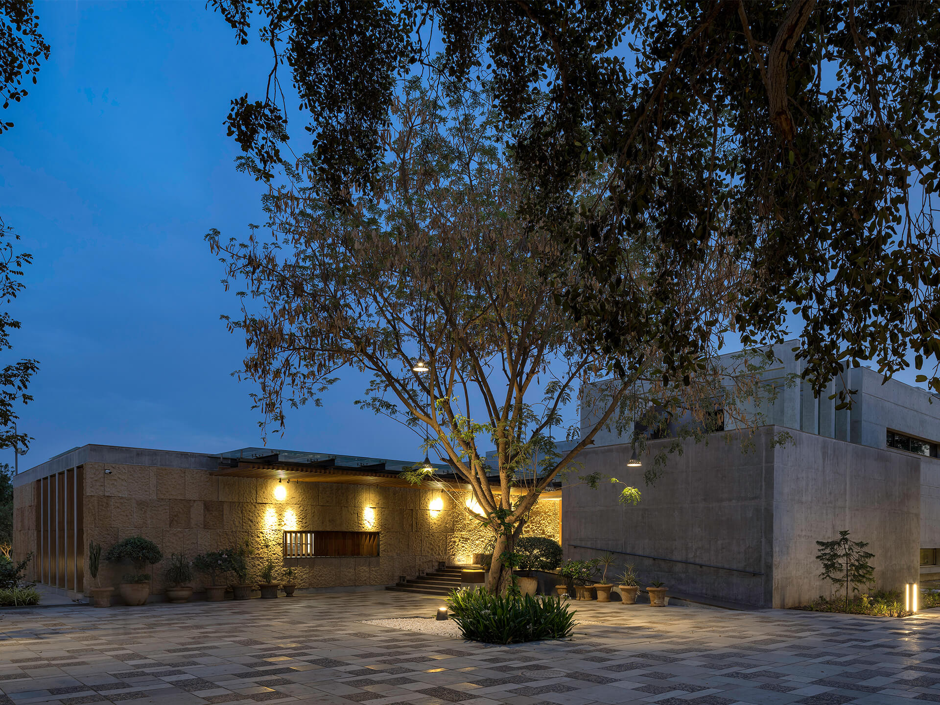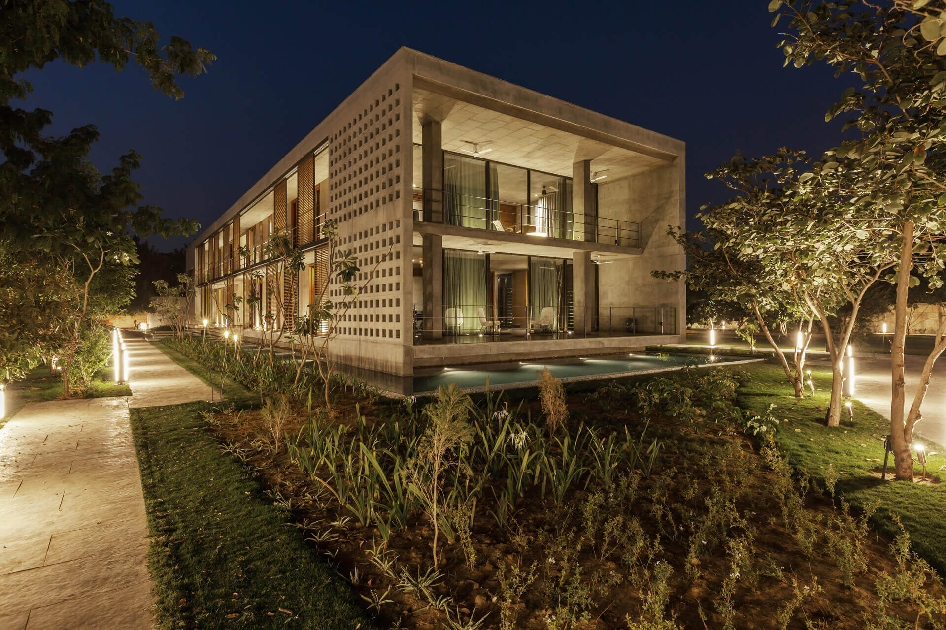 Eingefasst von einer idyllischen Grünanlage mit kleinem See schafft das Anwesen, was zunächst paradox erscheint: Es öffnet sich zum Garten und verschließt sich zugleich vor der sengenden Sonne Indiens. Das hier herrschende Wüstenklima treibt das Thermometer in den heißen Sommermonaten auf Temperaturen von über 40° Grad Celsius. Wesentlich für das Haus ist es deshalb - trotz der engen Verbindung zwischen drinnen und draußen - den Einsatz energiefressender Klimaanlagen zu minimieren.