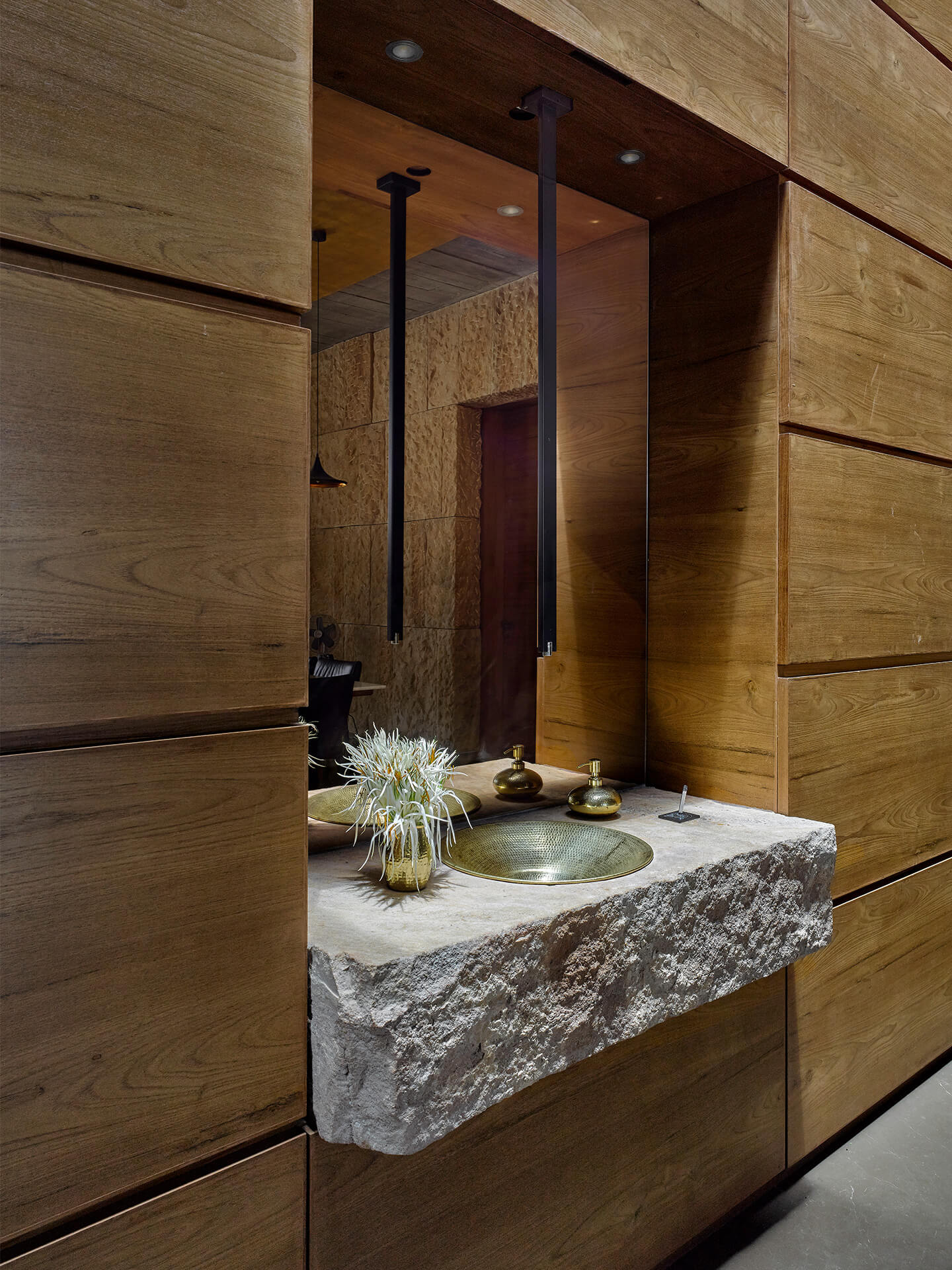 Zwei Baukörper unterschiedlicher Höhen mit einem Kubus als Kernstück ordnen sich L-förmig auf dem Gelände an. Sie bilden die geradlinige Silhouette des modernen Sichtbeton- und Natursteinbaus, der durch seine spannungsvolle Höhenstaffelung aus jeder Perspektive immer wieder neu erstrahlt. Die unbearbeitete, leicht schroffe Betonfassade wirkt dank großer Fensterflächen luftig und einladend. Gezielt eingesetzte Holzelemente verleihen dem minimalistischen Äußeren der Residenz freundliche Wärme. Zudem nehmen rechteckige Aussparungen in der Fassade und seitliche Fensterbänder dem Gebäude die Schwere. Natürlichkeit strahlt auch der handgeschlagene, goldfarbene Sandstein aus Rajasthan aus, der den vorderen Teil des Hauses umgibt. Die raue Natursteinfassade fügt sich aus Blöcken unterschiedlicher Breiten zusammen und begleitet den Besucher vom Eingang ins Innere des Hauses, entfaltet sich hier um den Funktionsblock der Küche und führt im Essbereich wieder nach draußen auf die Veranda.
