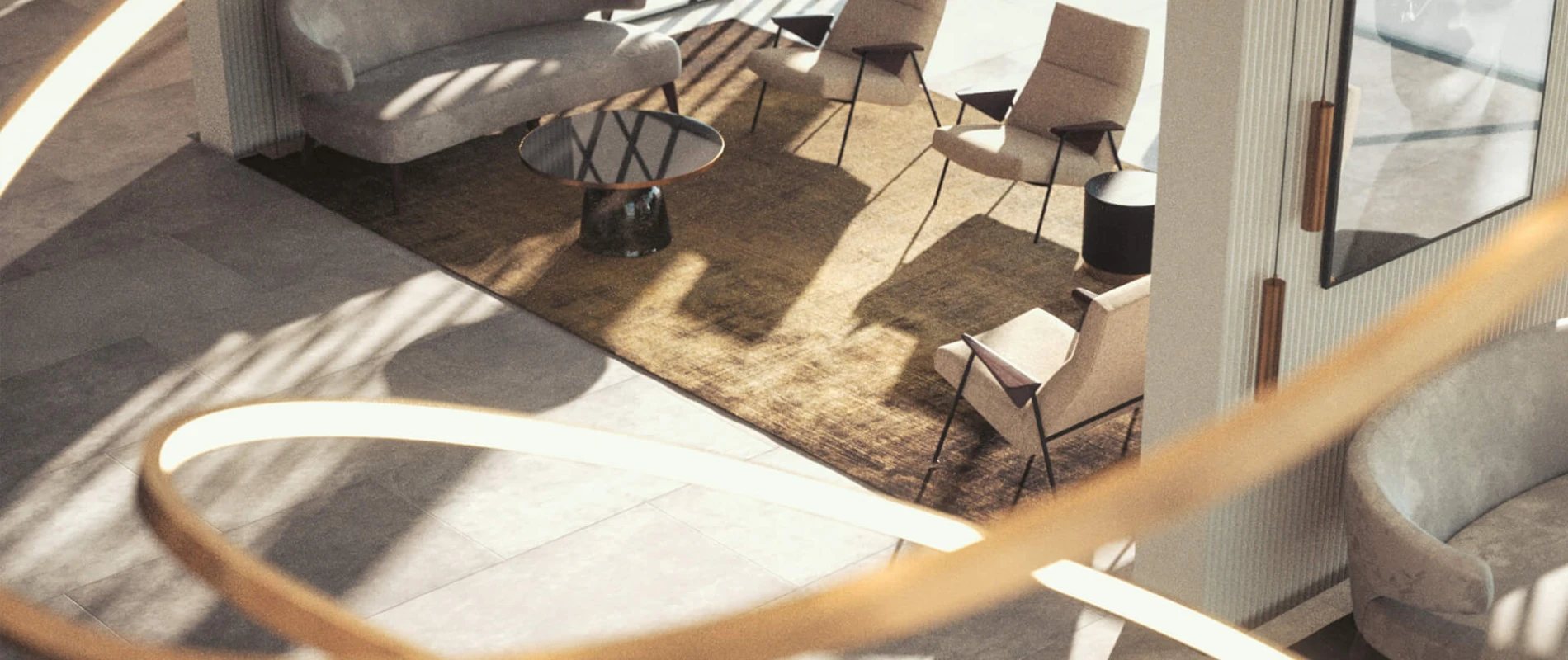 Das innenarchitektonische Konzept setzt auf fließende Übergänge: Zwei Holzkerne bilden das optische Rückgrat der öffentlichen Bereiche mit Lobby, Bar, Restaurant, Konferenzräumen und einem Ballroom. Lufträume über drei Ebenen schaffen interessante Blickbezüge, Glasflächen zwischen den Kernen sorgen für Offenheit und Interaktion. Eine fließende Deckenskulptur verbindet die öffentlichen Bereiche miteinander. Regionale kulturelle Zitate finden sich in Form eines Banater Motivs, das sich als moderne Grafik durch die Hotelbereiche zieht, während die Farbigkeit der Altstadtfassaden in der Gestaltung der Zimmer aufgegriffen wird. So entsteht ein Hotel, das Nahbarkeit und Lebendigkeit mit Stil und Eleganz verbindet.