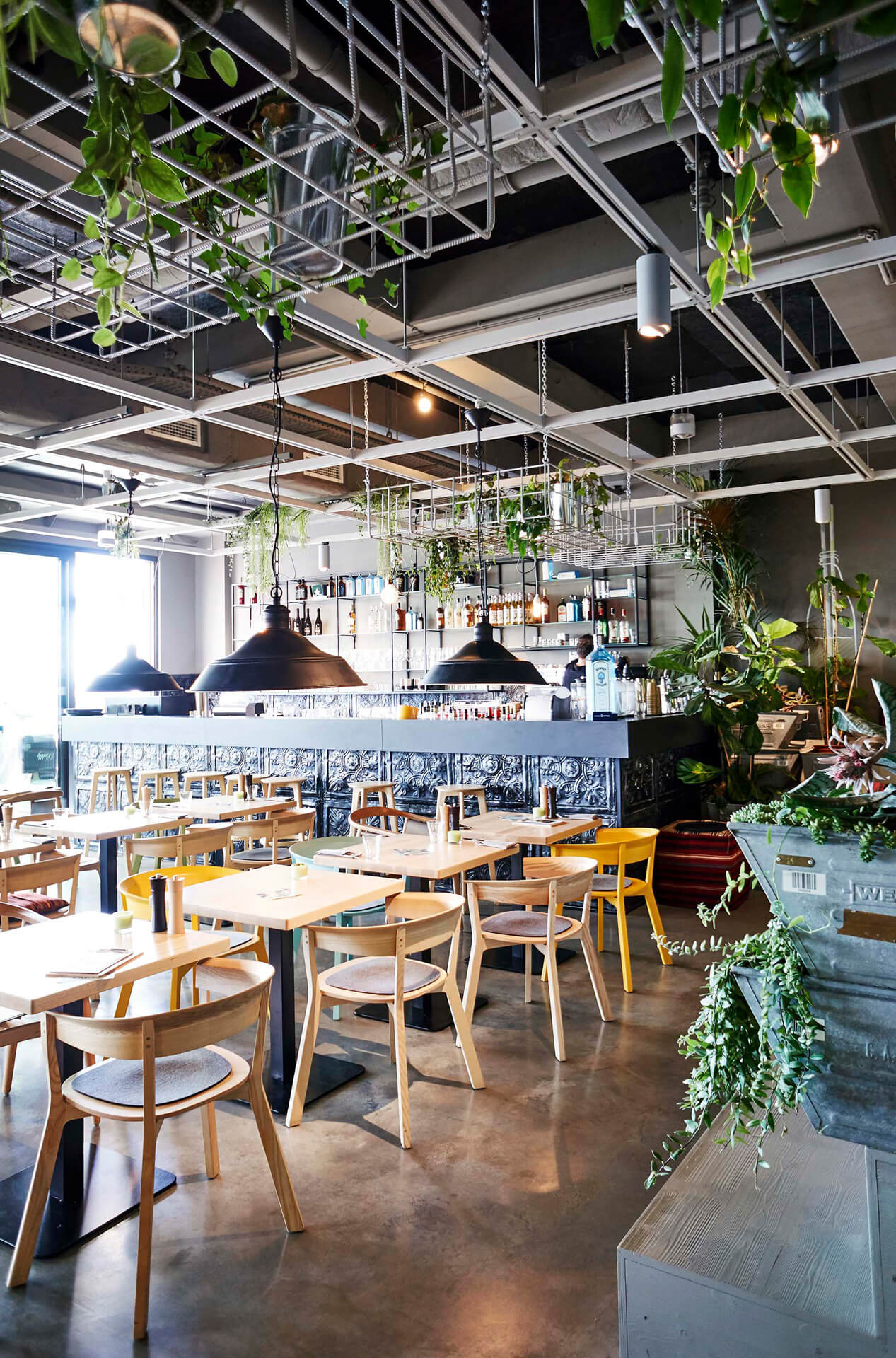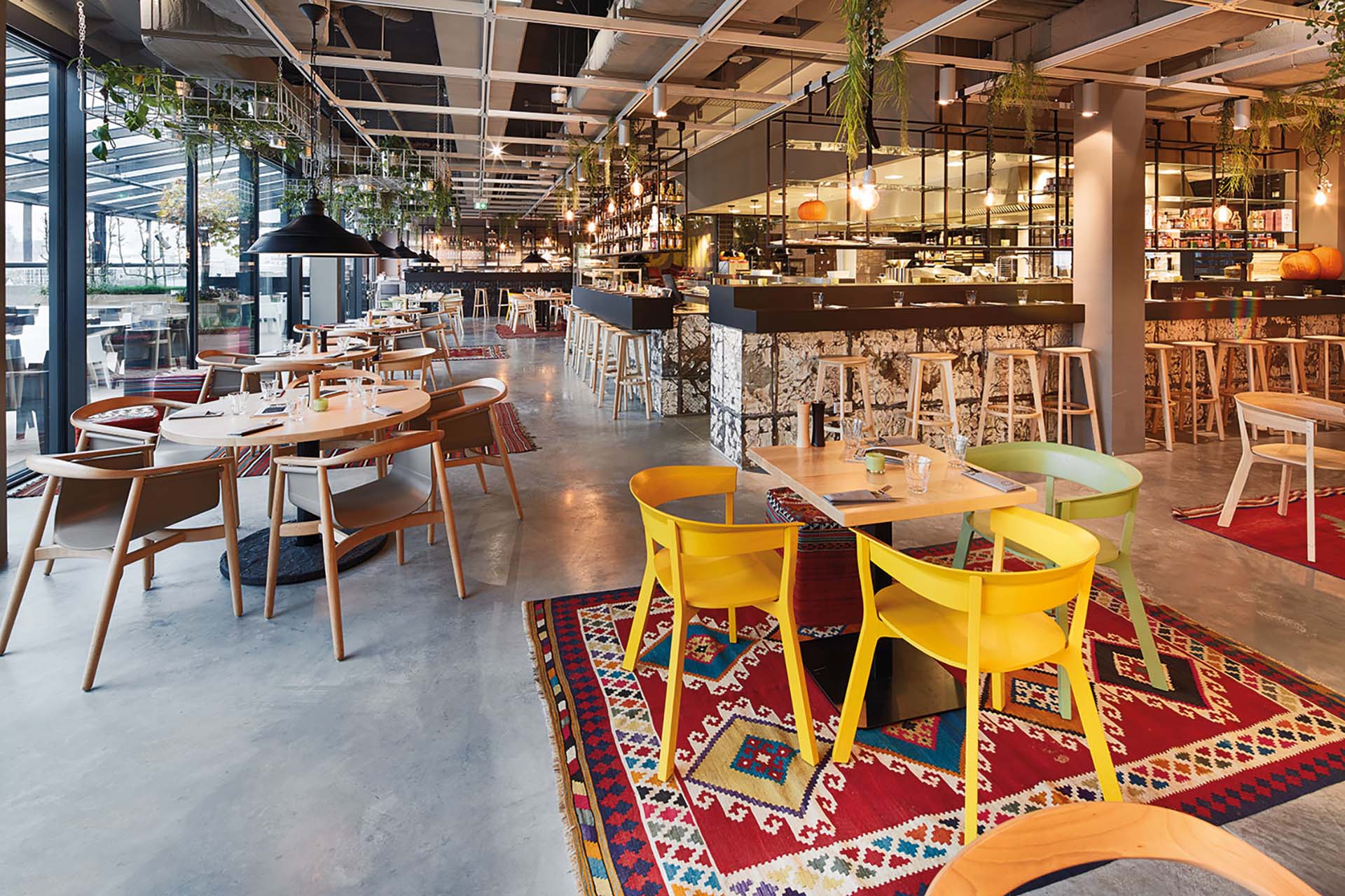 Bunte Kissen und Teppiche, natürliche Holzmöbel sowie pointiert gesetzte Metallakzente verdichten sich zu einer lässig-entspannten Atmosphäre, die Elemente des Industrial Style aufgreift und eine urbane Coolness vermittelt. Das gitterähnlich aufgebaute Deckensystem aus Aluminium-Profilen erlaubt eine hochflexible Nutzung. In diesem Netzwerk lassen sich unterschiedliche Komponenten spielend leicht ein- oder umhängen. Das gilt für die Regale über der Bar ebenso wie für die Leuchten. Sowohl der 340 Quadratmeter umfassende Innenraum als auch der 130 Quadratmeter große Außenbereich sind zudem üppig begrünt. Hier zeigt sich: Die Bezeichnung »Dachgarten« ist kein Etikettenschwindel, zumal die Freifläche eine beeindruckende Aussicht bietet.