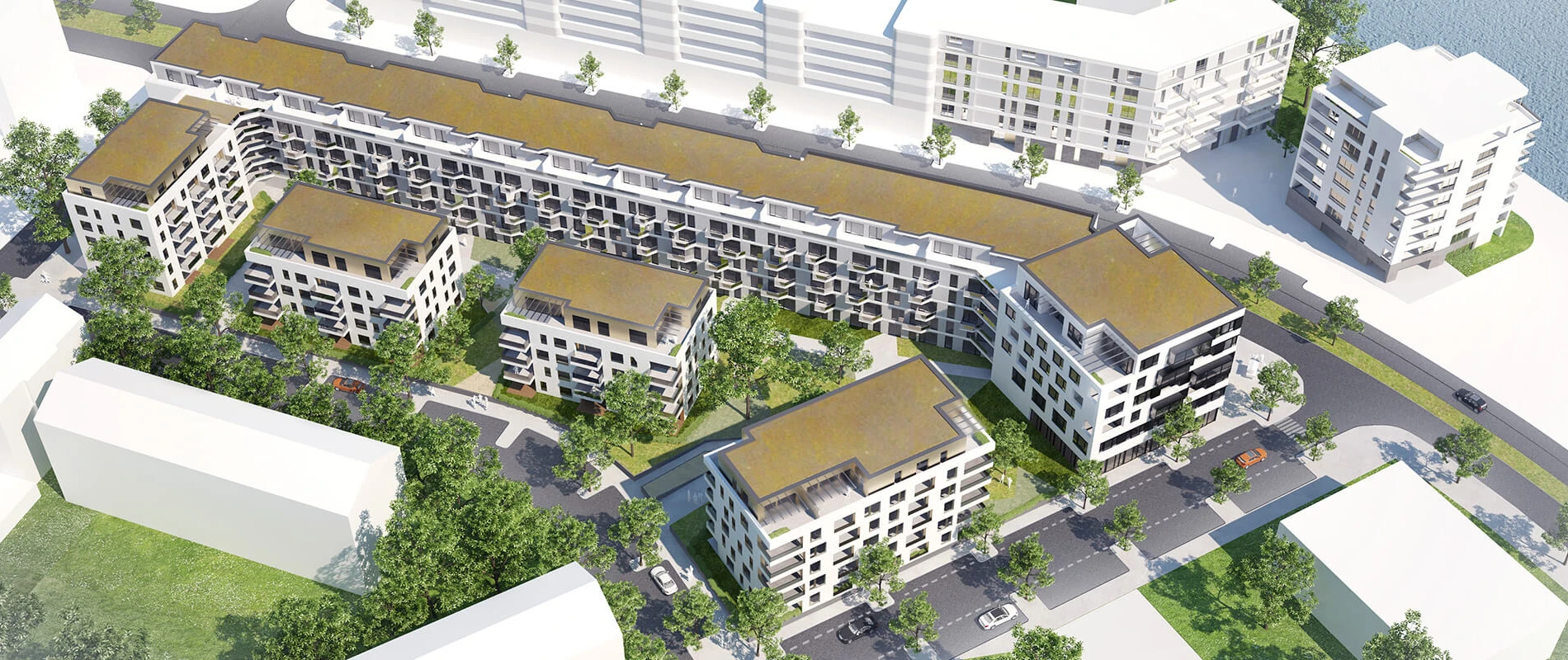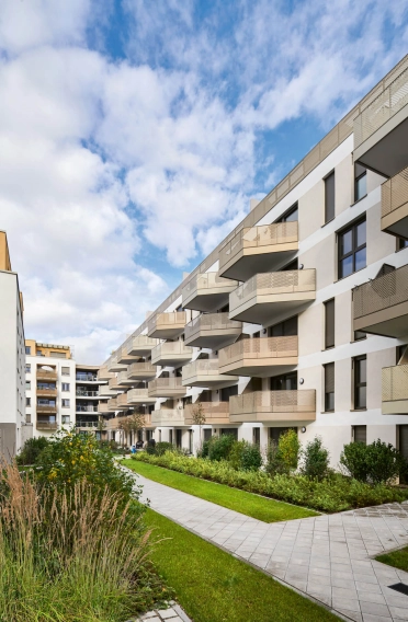 Die besondere Wohnungsqualität bei urbaner Dichte ergibt sich aus der hohen Durchgrünung des Areals und der Anordnung um durchlässige Innenhöfe. Die neuen Gebäude nehmen Bezug auf ihre Umgebung: Die vertikale Differenzierung der Fassaden sorgt für Maßstäblichkeit und integriert die Neubauten harmonisch in den Kontext. Eine horizontale Betonung zum Hofinneren schafft Zusammenhalt. Im Zusammenspiel des Wohnungsneubaus mit seinem benachbarten Gebäude ergibt sich eine identitätsstiftende Torsituation, die das Entree des Wohngebiets markiert.