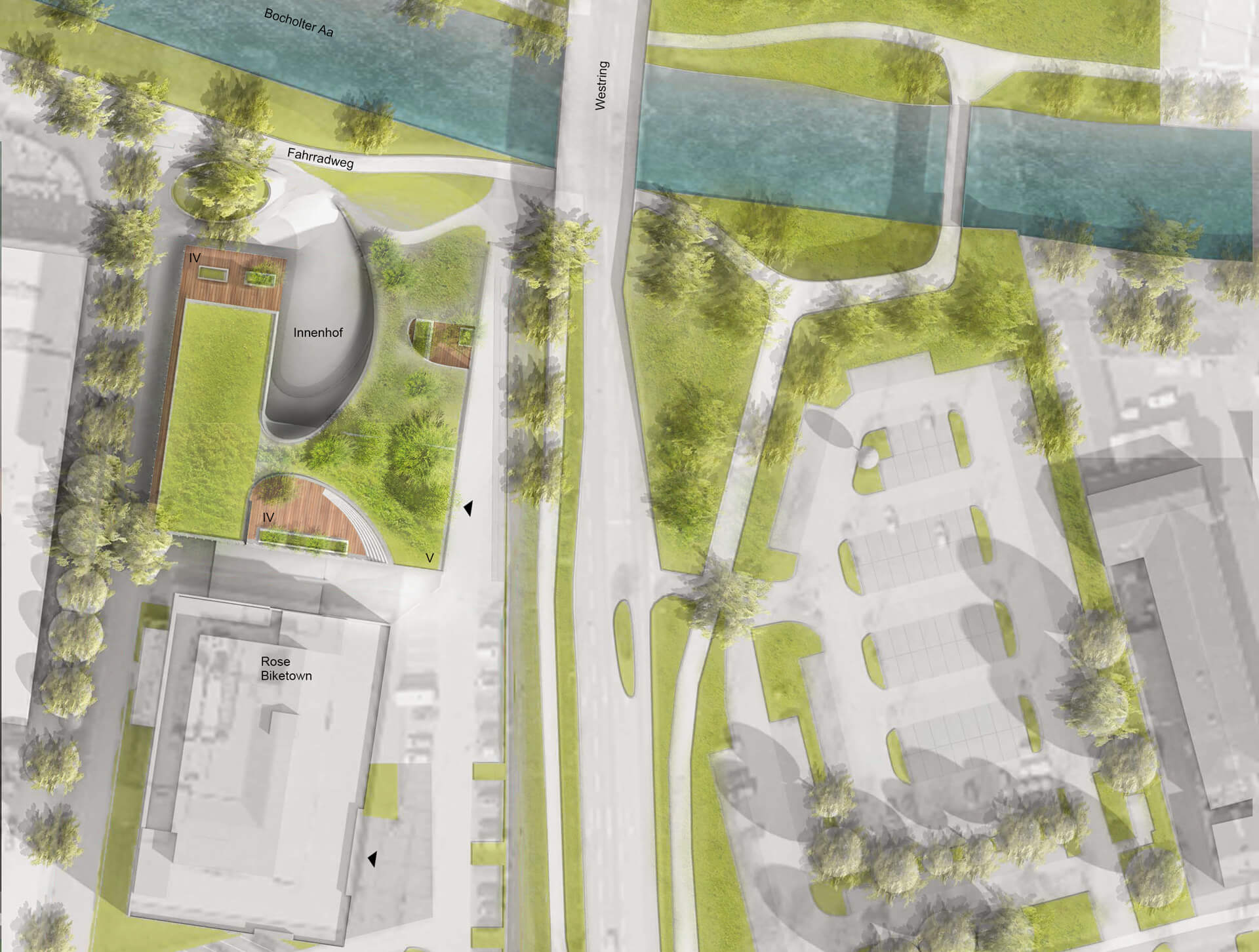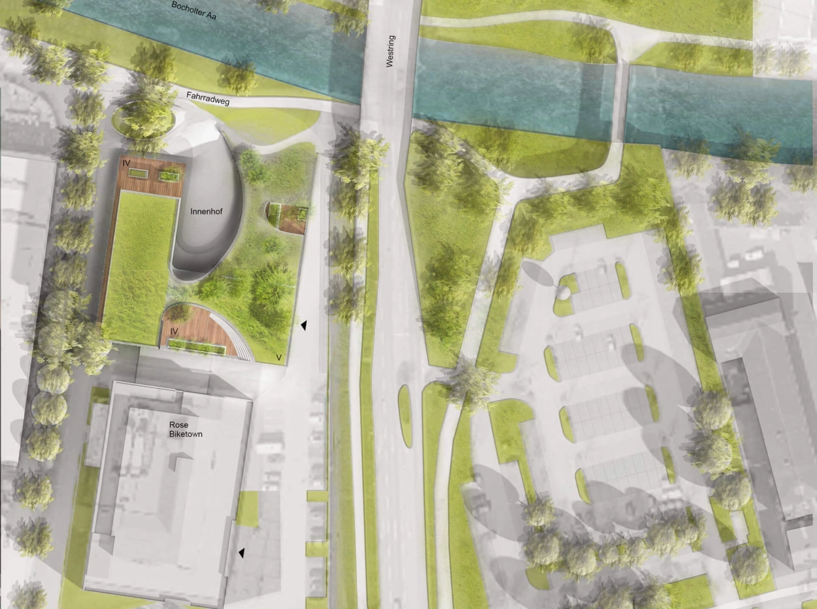 Für Rose ist Radfahren ein Lebensstil und gelebte Nachhaltigkeit. Diese Haltung spiegelt das Verwaltungsgebäude wider, das an den Flagship-Store und an die Aa angrenzen wird. Als Herzstück der Rose-Arbeitsumgebung kommuniziert der Neubau mit den Mitarbeitern und der Fahrradstadt Bocholt. Das Gebäude ist als offenes U geplant. So wird die kubische Form der Rose Biketown aufgenommen, während sich das Headquarter zur Westring-Brücke und zum öffentlich genutzten Ufer der Aa öffnet. Die fließende Entwicklung des Dachs nimmt dabei die Dynamik des Radfahrens auf. Als Symbol für Natur in der Stadt werden außerdem nach dem Prinzip des Animal aided Design die Qualitäten des Flussufers und der Insellandschaft fortgeführt.