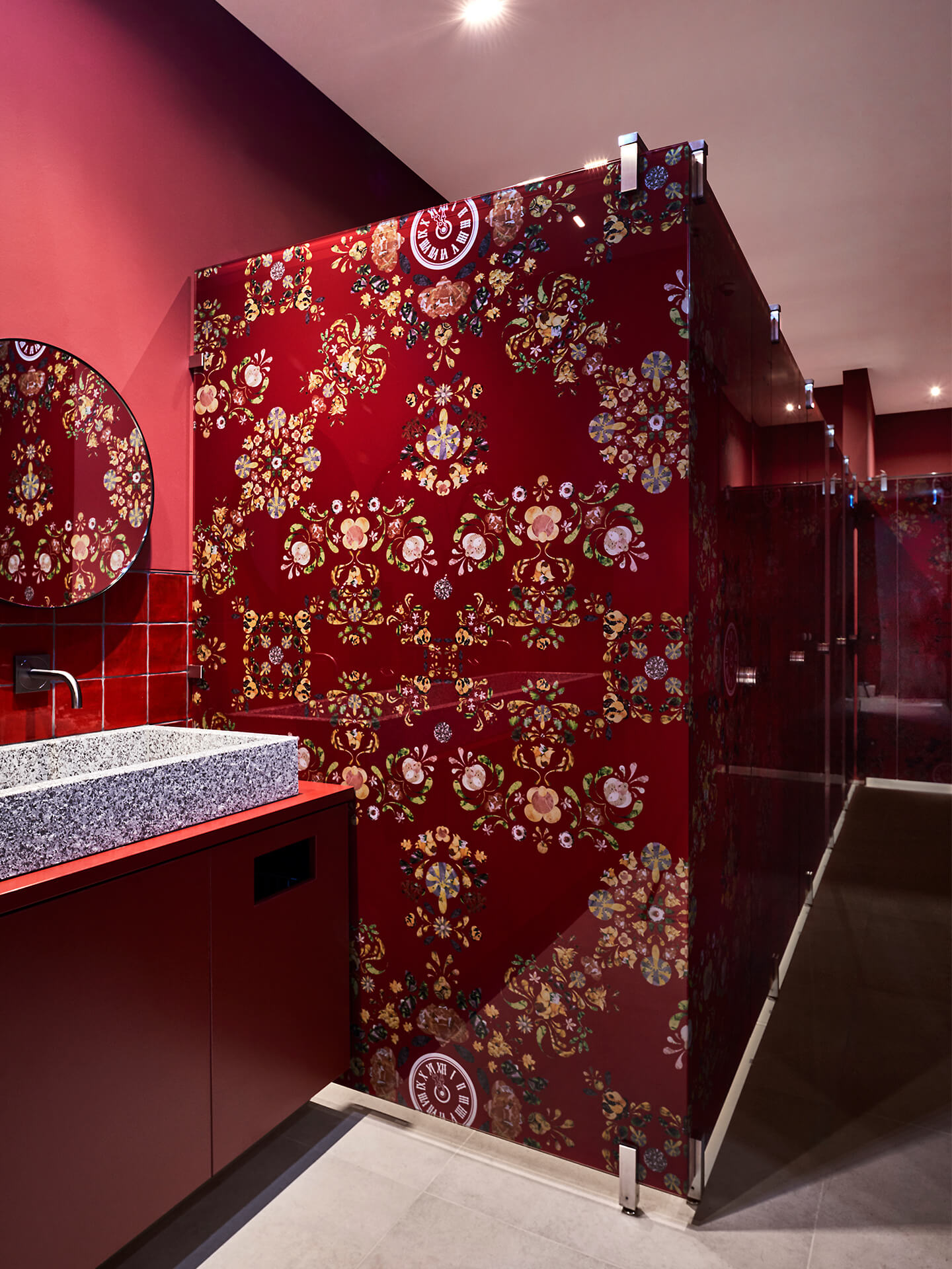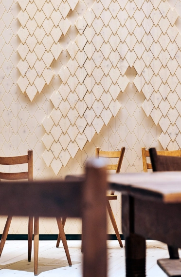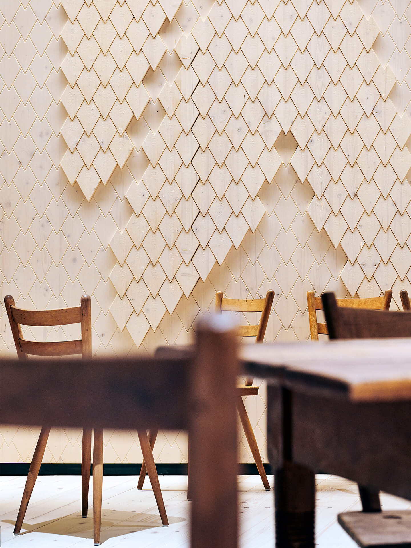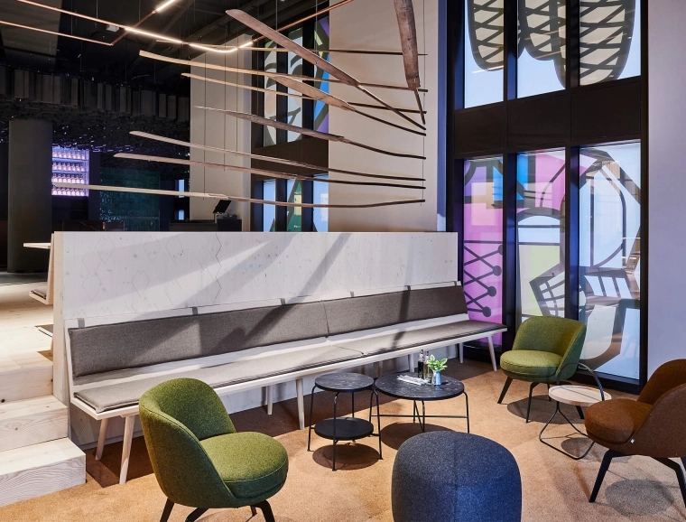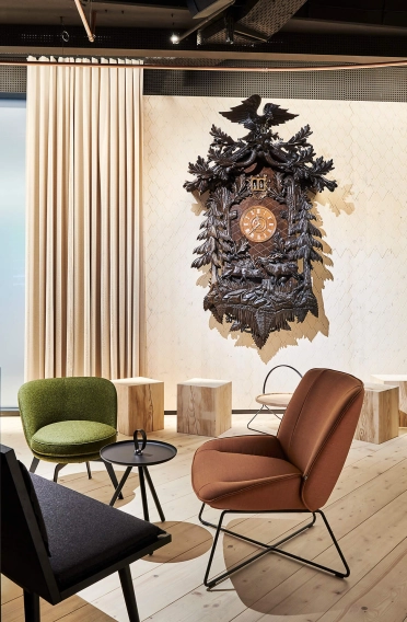 Als weiterer optischer Hingucker fungiert eine riesige dunkelbraune Kuckucksuhr. Den mystischen Charakter unterstreichen die von Hand geräucherten, schwarzen Schindeln, die im Bar- und Loungebereich an der Decke verzahnt sind. Über dem Gastraum gibt die offene Decke den Blick frei auf eine gestaltete Installationsebene. Helle Schindeln aus Fichtenholz machen die Wände – teilweise in abstrakter Form von Tannenzapfen – unverwechselbar. Geweißtes und geöltes Tannenholz formt den massiven Dielenboden. Den Gegensatz zwischen dunkel und hell thematisiert auch die emotionale Lichtgestaltung. Der bekannte Offenburger Künstler Stefan Strumbel interpretiert in den Sanitärbereichen mittels kaleidoskopischer Darstellungen traditionelle Schwarzwaldmotive auf moderne Art neu.