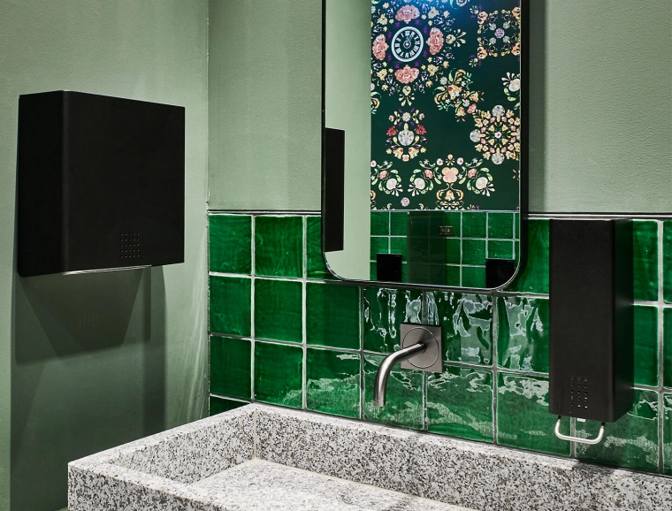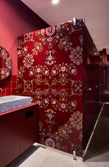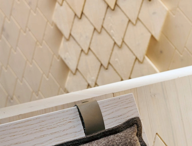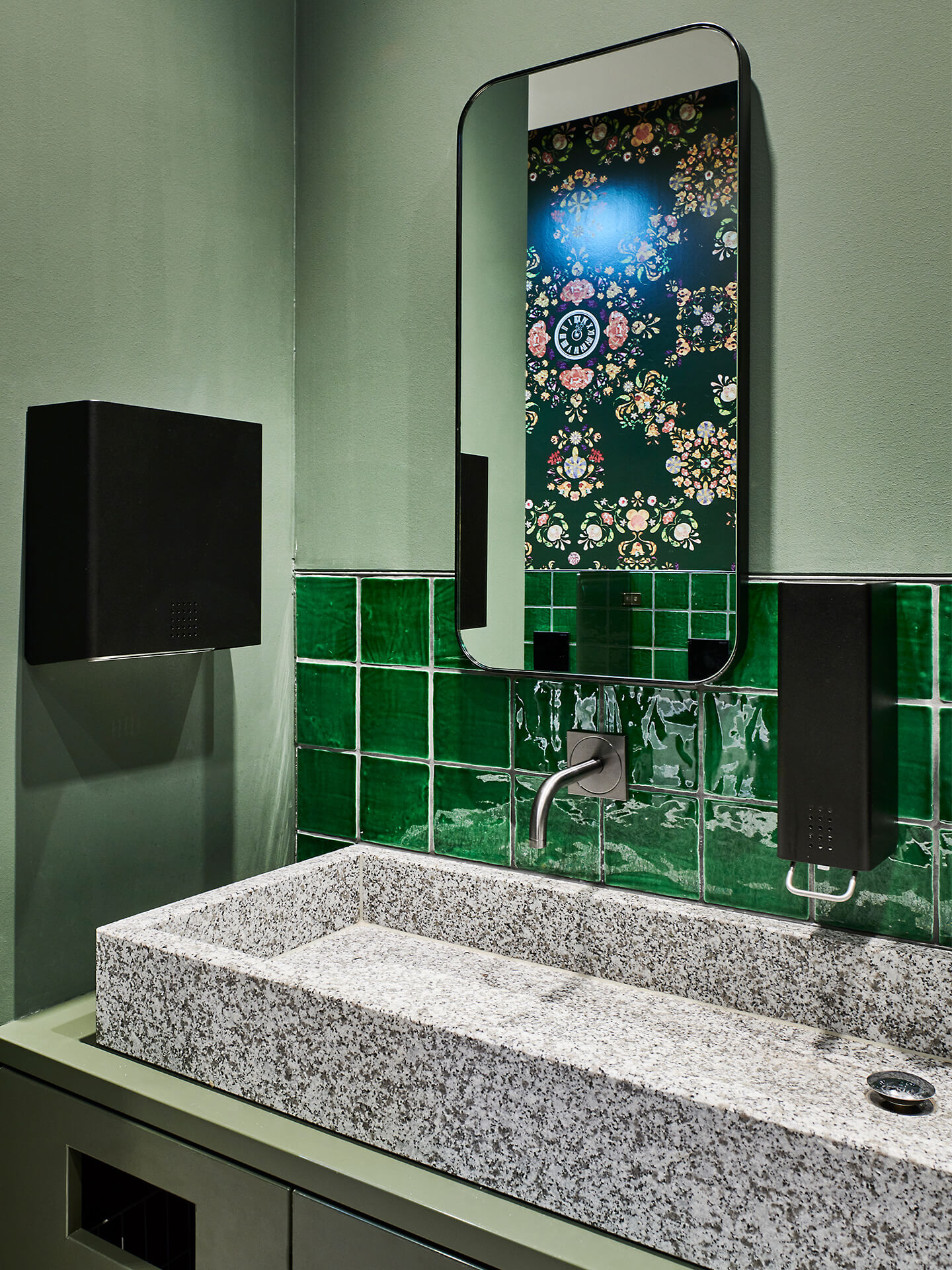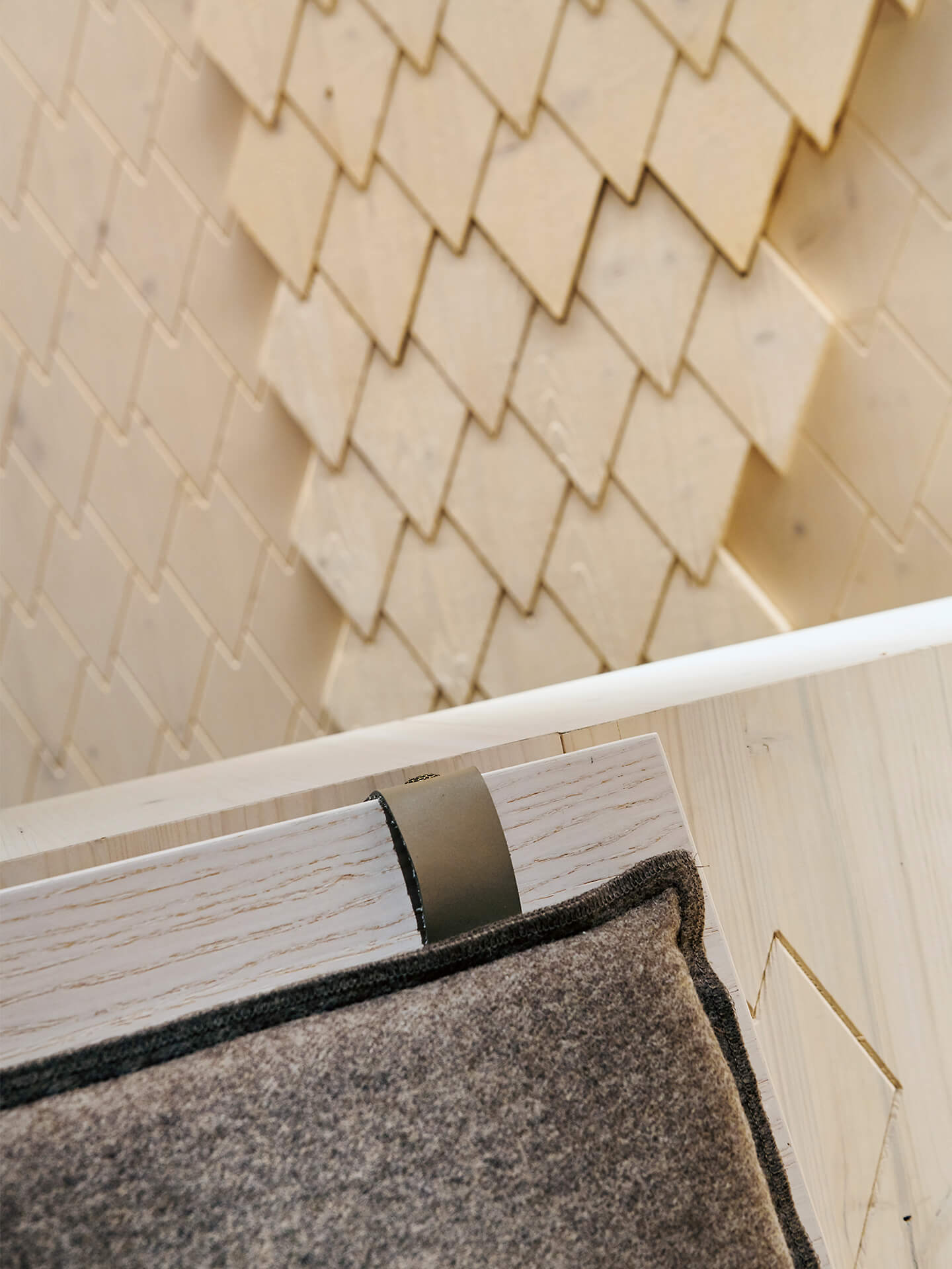 Als weiterer optischer Hingucker fungiert eine riesige dunkelbraune Kuckucksuhr. Den mystischen Charakter unterstreichen die von Hand geräucherten, schwarzen Schindeln, die im Bar- und Loungebereich an der Decke verzahnt sind. Über dem Gastraum gibt die offene Decke den Blick frei auf eine gestaltete Installationsebene. Helle Schindeln aus Fichtenholz machen die Wände – teilweise in abstrakter Form von Tannenzapfen – unverwechselbar. Geweißtes und geöltes Tannenholz formt den massiven Dielenboden. Den Gegensatz zwischen dunkel und hell thematisiert auch die emotionale Lichtgestaltung. Der bekannte Offenburger Künstler Stefan Strumbel interpretiert in den Sanitärbereichen mittels kaleidoskopischer Darstellungen traditionelle Schwarzwaldmotive auf moderne Art neu.