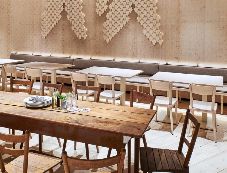 Im Mittelpunkt steht ein massiver, dunkelgrüner Kachelofen, der nach althergebrachter Weise gefertigt wurde. Besonders ins Auge stechen die von Hand modellierten Tannenzapfen in einer Kachelreihe. Als zentrales Element im Raum untermalt der Ofen mit seiner Rundbank und gemütlichen Kissen die perfekte Atmosphäre in der „guten Stube“. Gespeist wird an rustikalen Holztischen, kleinere Snacks und Drinks schmecken zudem auch auf stilvollen Lounge-Sesseln an Holztischen.