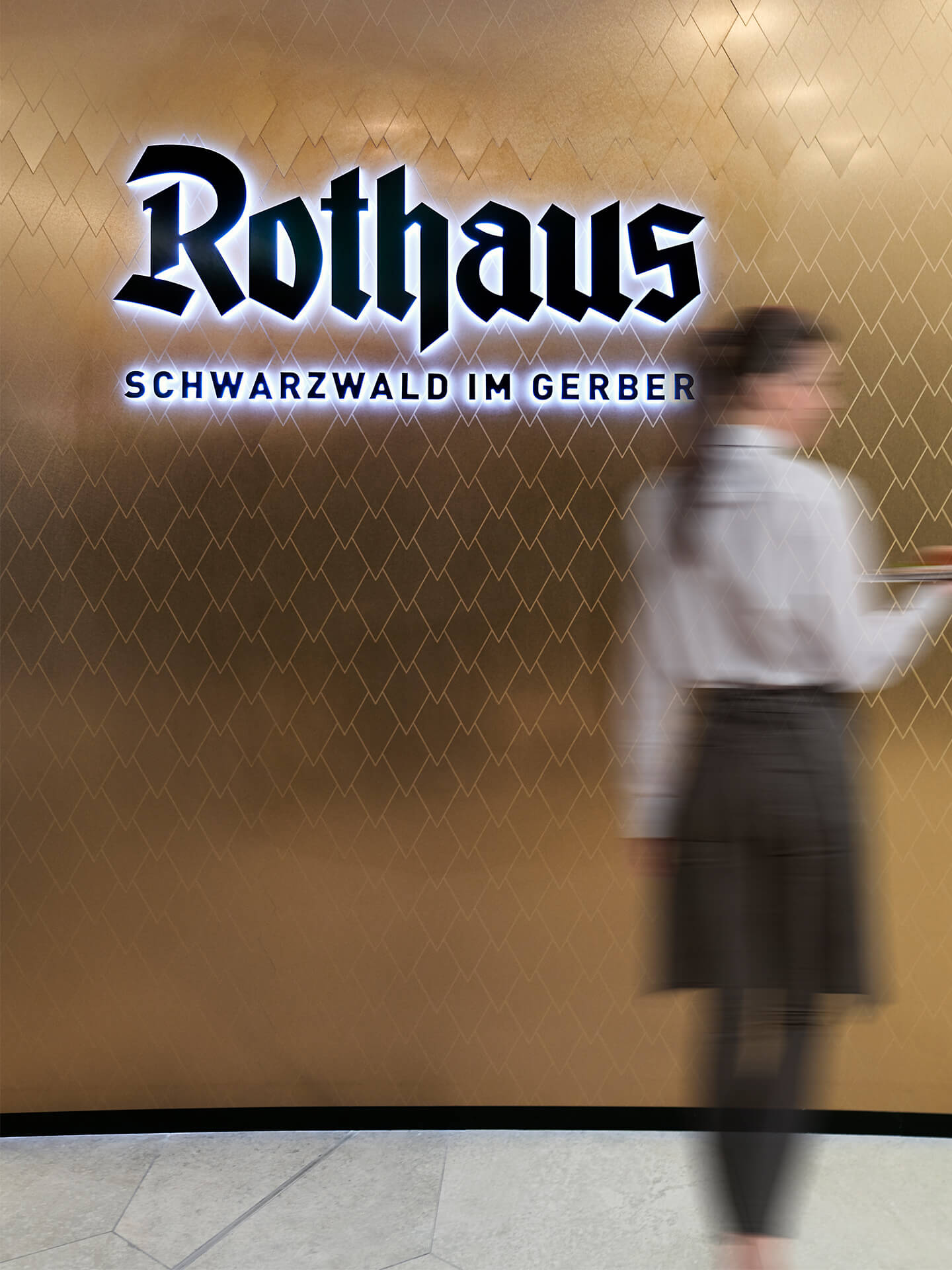 Rothaus bietet künftig 260 Gästen im Restaurant und 66 Gästen auf der Sonnenterrasse Platz. Der Innenraum gliedert sich auf drei unterschiedlichen Höhenlevel in die Bereiche Gastraum, Bar, Lounge, Küche und Sanitär. Die 1.160 Quadratmeter der Gesamtfläche sind zudem untergliedert in 760 Quadratmeter Innenraum und 130 Quadratmeter Mallfläche.