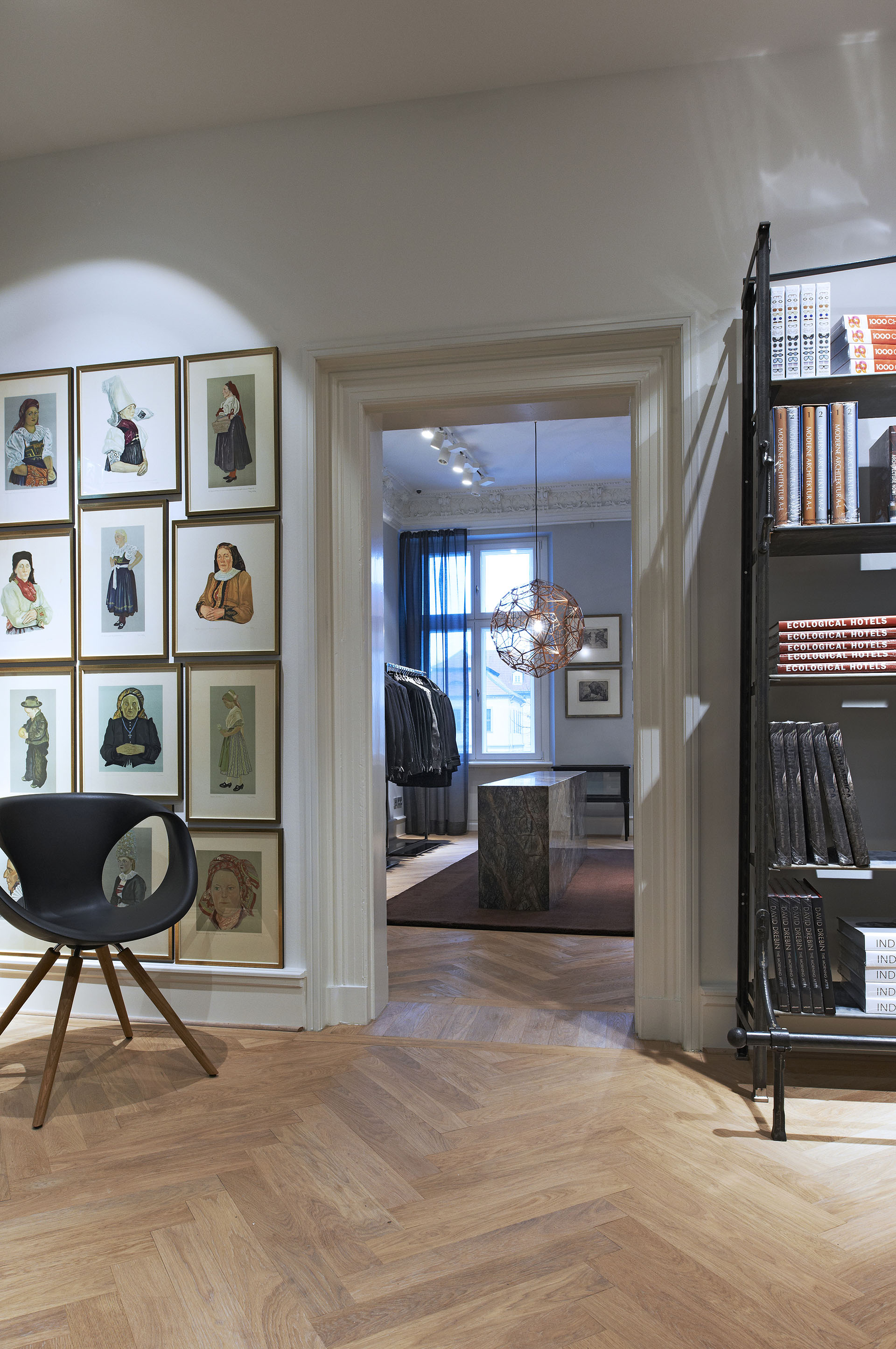 Durch ein anthrazitfarbenes Treppenhaus führt eine geschwungene Holztreppe in den ersten Stock. Liebevoll arrangierte Bildergalerien empfangen den Besucher in einem als Mixed-Zone gestaltenen Entrée. Neben Mode präsentiert Roy Robson hier ein ständig wechselndes Sortiment an Accessoires. Die Innenarchitekten haben die Aufteilung des früheren Wohnhauses beibehalten, denn die sieben verbundenen Räume sind ideal, um entlang wiederkehrender Leitmotive ein Story-Telling zu betreiben. Teils wird die Geschichte mit neuen, teils mit historischen oder rekonstruierten Möbeln erzählt.