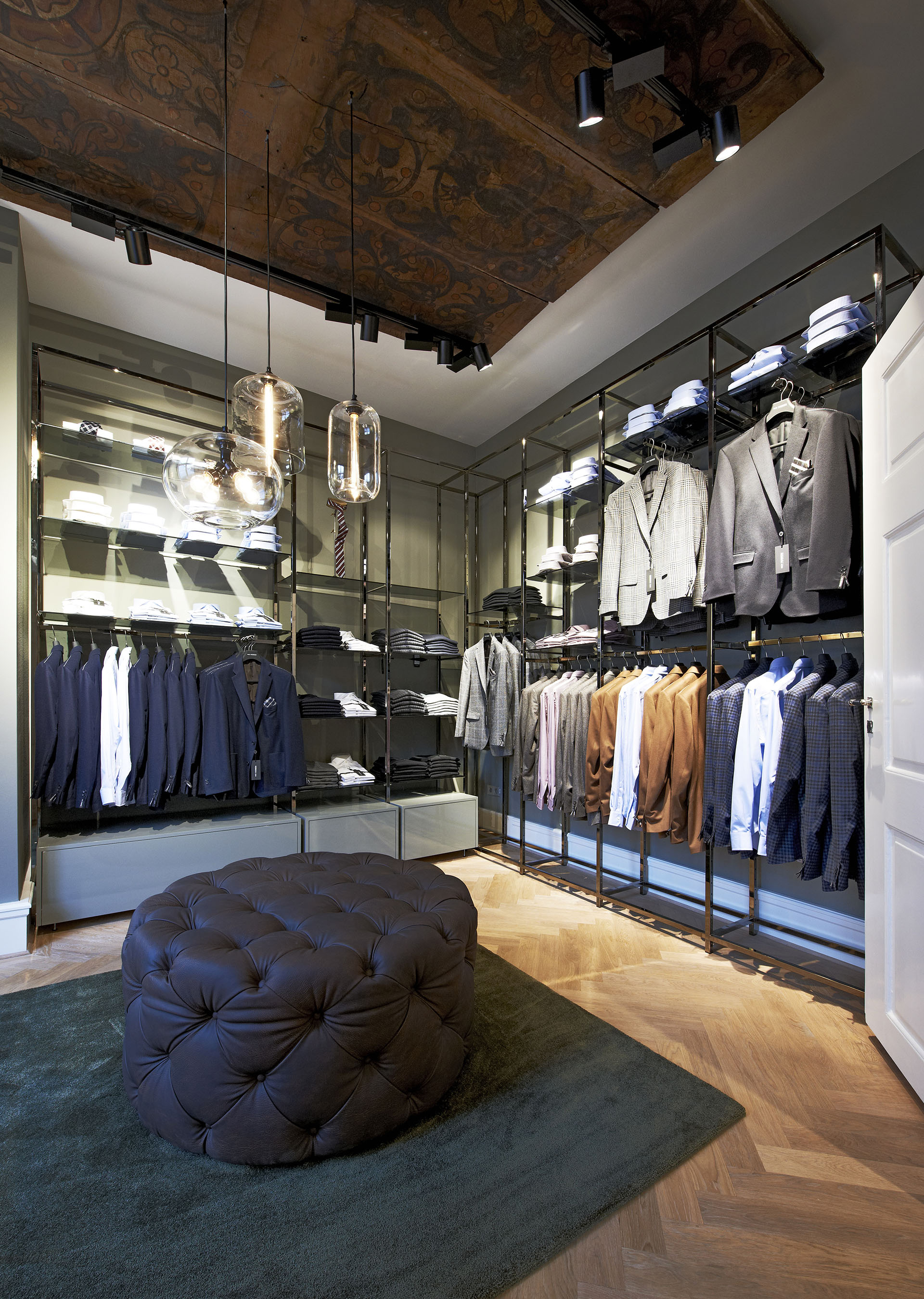 Dabei sind Mittelraum und Raumhülle klar voneinander getrennt. Blickfang sind die restaurierten Türzargen. Gemeinsam mit dem freigelegten Stuck vermitteln sie ein fast erhabenes Raumgefühl. An den Wänden wird die Mode in Regalen aus glänzendem Stahlrohr präsentiert, gefeatured von wie zufällig drapierten großformatigen Elementen in Betonoptik. Auch der Farbverlauf der Zimmer folgt der Storyline, startet in hellem Grau, verdunkelt sich sanft und mündet, wo sich die hochwertigsten Stücke der Kollektion präsentieren, mit einem noblen Touch ins Grün.