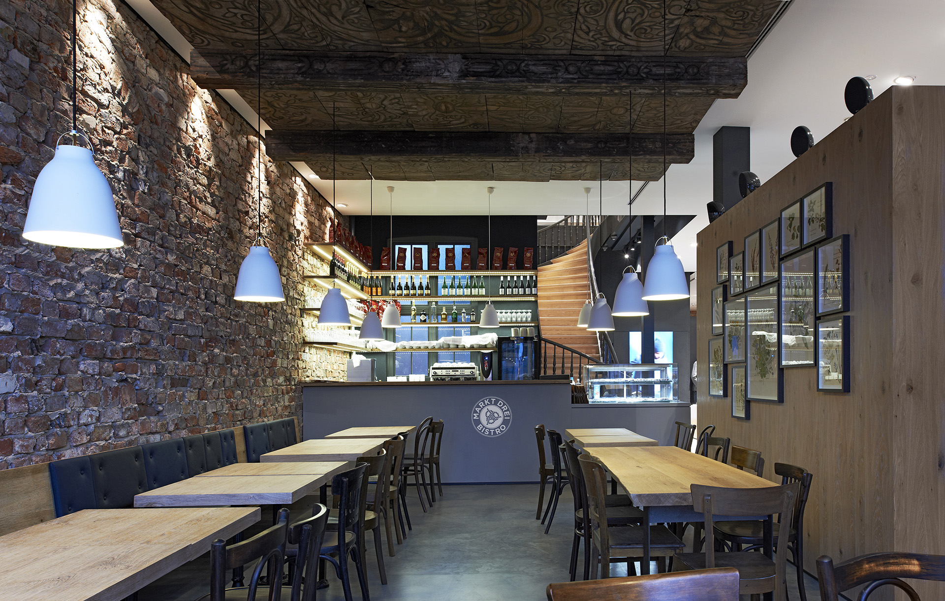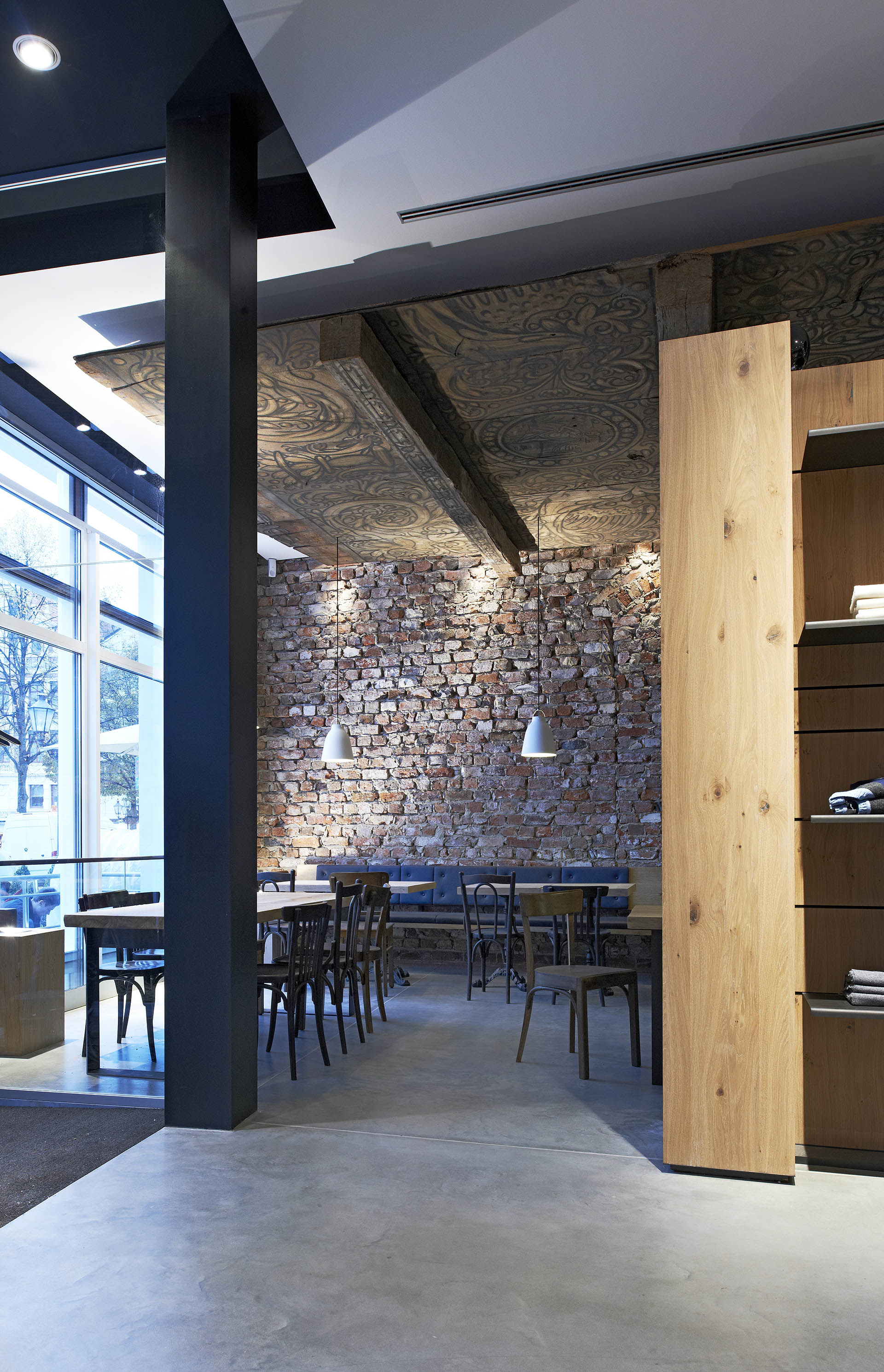 Besucher des Konzepthauses tauchen zunächst in geschäftiges Leben ein - im Erdgeschoss treffen Store und das Bistro „Markt Drei“ aufeinander. Hier wird die jugendlich-sportive Kollektion vor Wänden aus heller Eiche und in Regalen aus Schwarzstahl gezeigt. Der schlichte graue Estrichboden betont die solide Lässigkeit. Wo zu roten Ziegelsteinwänden anthrazitfarbener Wandputz verarbeitet wurde, springt die Decke nach oben und gibt dem Raum Tiefe und Struktur. Die auffällig bemalte Holzdecke des Bistros stammt aus einem anderen Gebäude, wurde konservatorisch aufbereitet, um wieder zu Geltung zu kommen. Kräuter und Pflanzen schmücken als gerahmtes Herbarium die seitlich zum Store abschließende Eichenwand. Neben dem eigens entwickelten Corporate Design sorgt nicht zuletzt die kreative, regional verankerte Küche des Bistros für die genussvolle Erinnerung an die Marke.