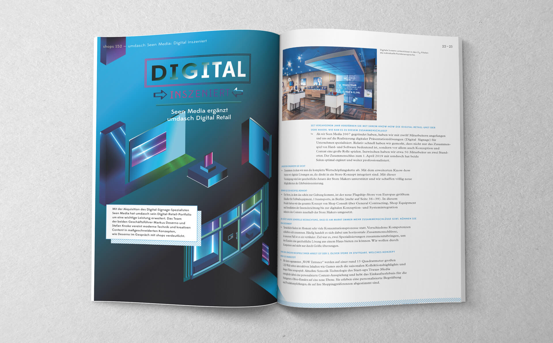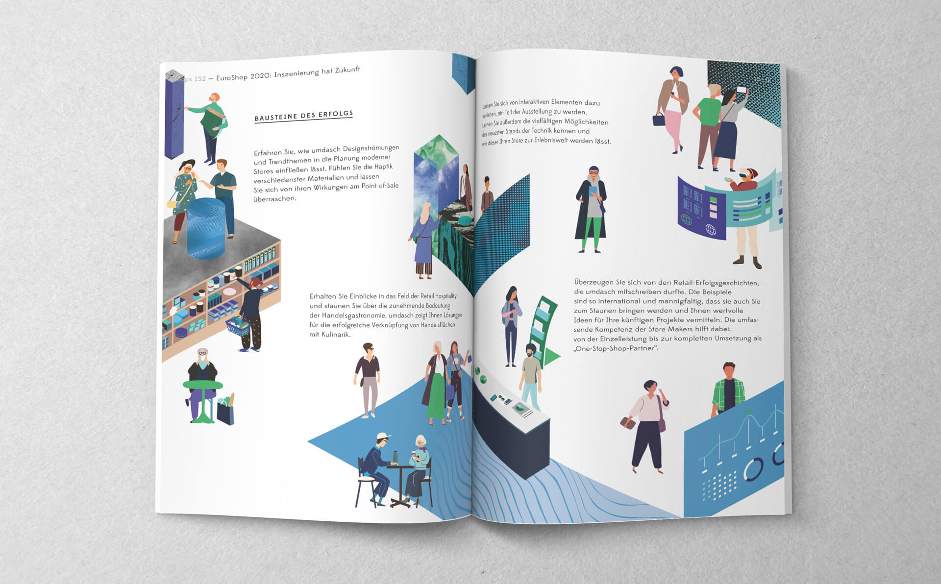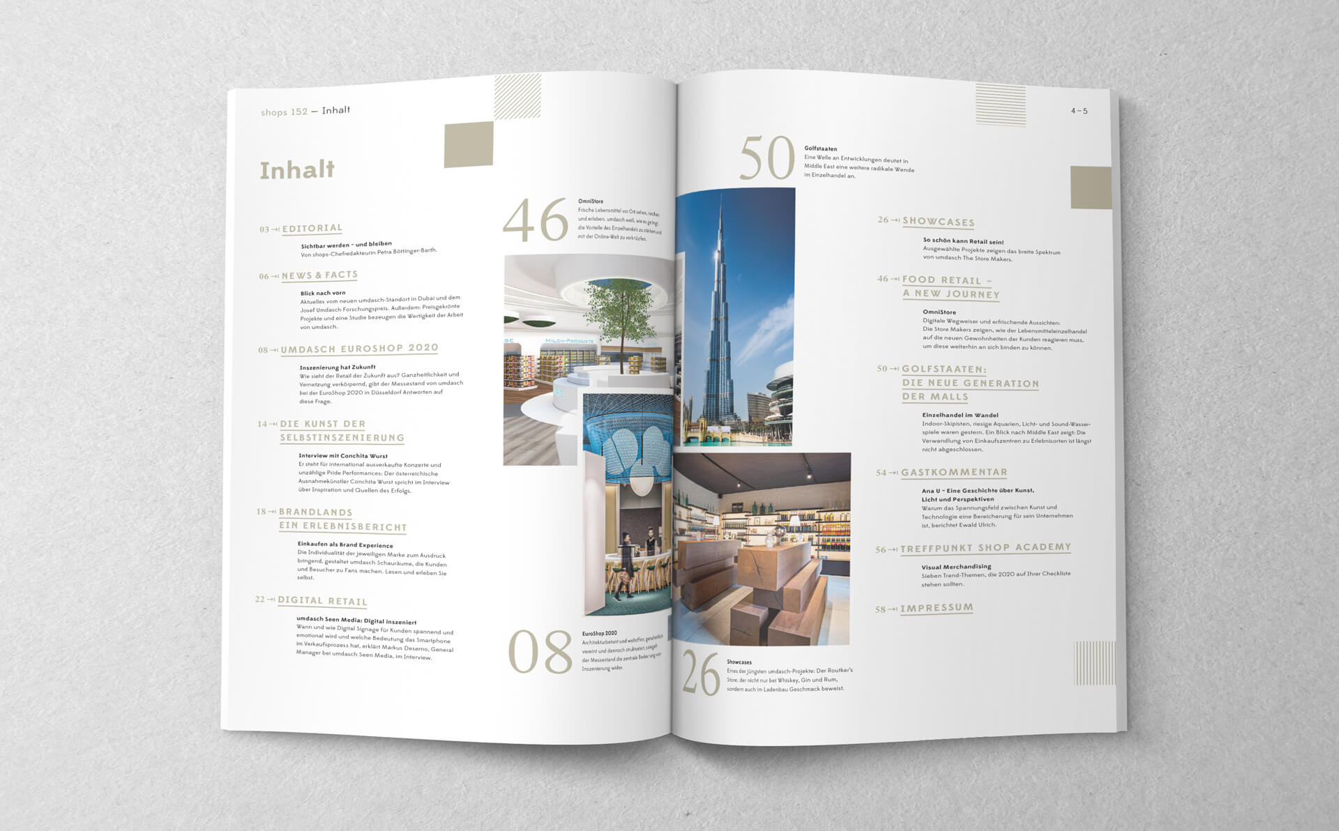 Die aktuelle Ausgabe shops 152, die ganz im Zeichen der eigenen Marken-Inszenierung steht, befasst sich schwerpunktmäßig mit der Euroshop 2020 in Düsseldorf – dargestellt durch verschiedene Textformen und individuelle Illustrationen. Die „Store Makers“ haben es sich nicht nur zur Aufgabe gemacht, ihren Kunden Bedeutung und Sichtbarkeit zu verleihen. Auch sich selbst gekonnt in Szene zu setzen, versteht das Unternehmen bestens.