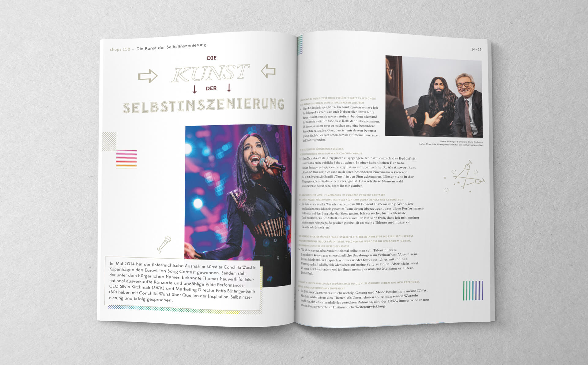 So nimmt das Magazin seine Leser mit auf die beständige Suche der „Store Makers“ nach immer neuen Leistungen, lässt sie an spannenden Unternehmenszukäufen wie dem des Digital-Signage-Unternehmens „Seen Media“ teilhaben und gibt ihnen in den Showcases einen Überblick über die aktuellen Projekte. Mit einer außergewöhnlichen Illustration versehen, zeigt der Brandlands-Erlebnisbericht wie Einkaufen zur Brand Experience wird. Eine Bühne bietet shops einem besonderen Meister der Selbstinszenierung: Im Interview berichtet der Künstler Conchita Wurst, wie es gelingt, mit einem kurzen Auftritt Menschen weltweit von der eigenen Performance zu überzeugen.