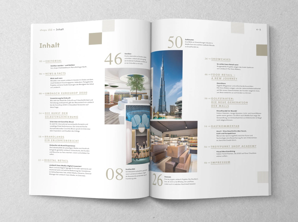 Die neuesten Trends im Handel, zukünftige Entwicklungen sowie Impulse, die zur Inspiration anregen: Das shops Magazin gewährt exklusiven Experten-Einblick in die Branche. Herausgegeben vom weltweit agierenden österreichischen Ladenbau-Spezialisten umdasch, erfreut es sich jährlich in deutsch- und englischsprachiger Ausgabe großer Resonanz beim internationalen Fachpublikum.