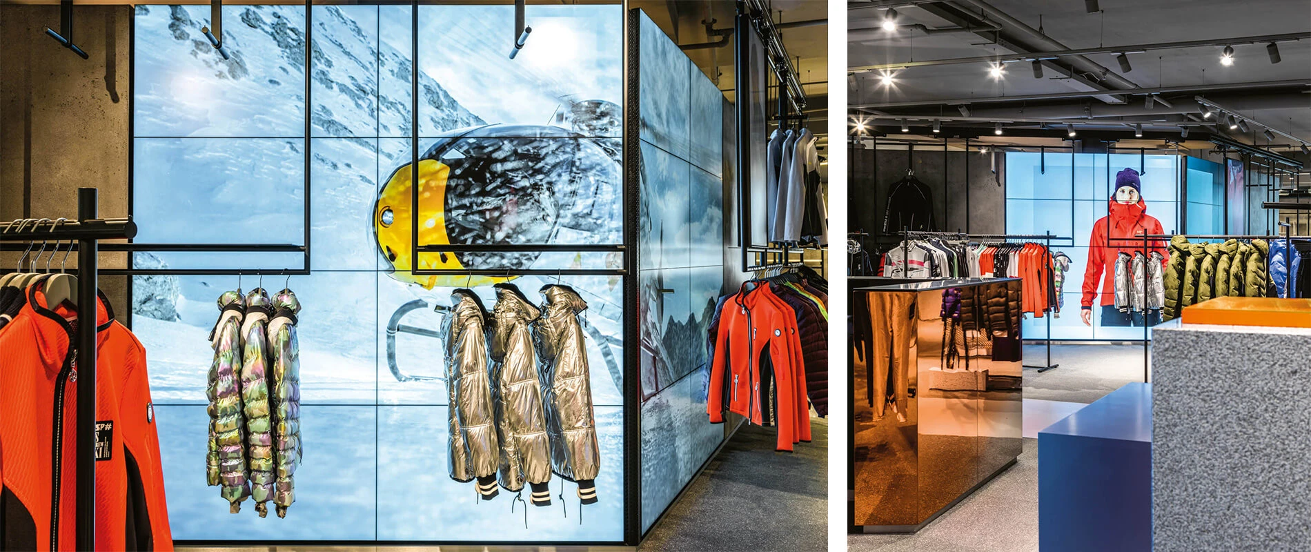 Auf ein Spiel mit Kontrasten waren die Innenarchitekten aber auch auf einer anderen Ebene bedacht: Um das Shoppingerlebnis über mehrere Sinne erlebbar zu machen, wird bei der Warenpräsentation durch Überlagerung verschiedener Medien eine ungewöhnliche Detailtiefe geschaffen. Auf dem sogenannten Inspiration-Island etwa wird an der flexiblen Deckenschiene nicht nur die Ware abgehängt, sondern auch Monitore, die beidseitig mit inspirierendem Content bespielt werden. Ergänzt wird die mediale Inszenierung durch Screens, die die zum Verkauf angebotene Ware digital zur Schau stellen.