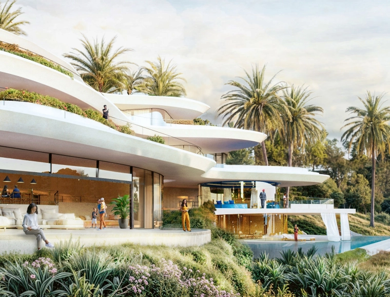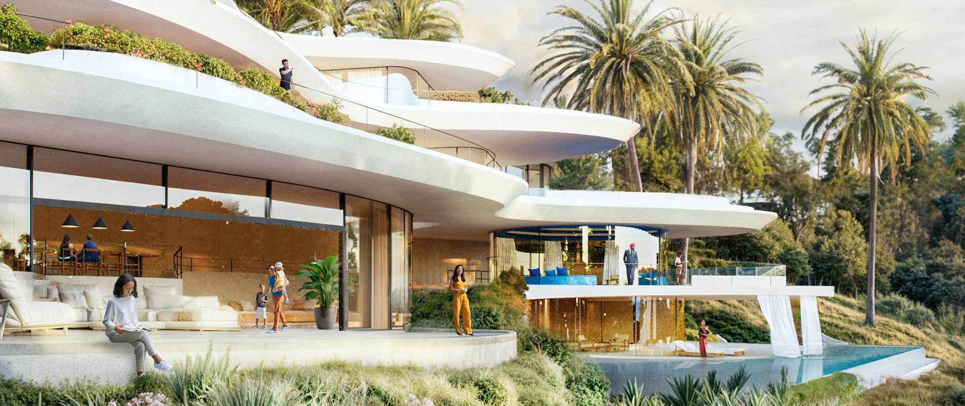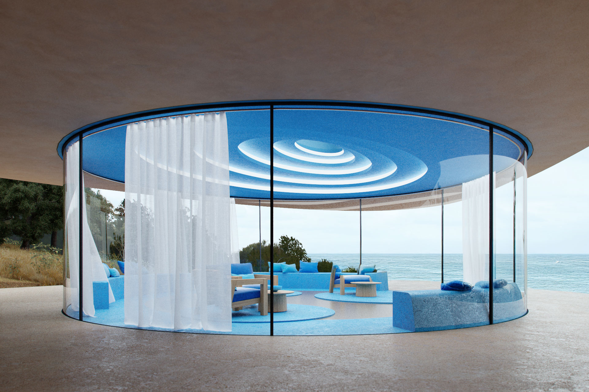 Im Mittelpunkt steht die »Blue Lounge« – ein multifunktionaler Raum mit 360-Grad-Panoramablick. Ein wesentliches Element des Designs ist Wasser, das durch den Wohnraum vom Eingangsbereich hinunter zur Hauptterrasse in einen Swimmingpool fließt und sich so mit der Gartenlandschaft verbindet.